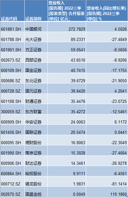 2022年中报营收排名前十的券商中,中国银河证券股份有限公司(下称“中国银河”,601881.SH,06881.HK)率先披露三季报。 10月27日,中国银河发布2022年第三季度陈诉。三季报表现,中国银河陈诉期内业务收入为90.68亿元,同比(与前一年同期相较)淘汰了17.29%。归属于上市公司股东的净利润(下称“净利润”)为21.14亿元,同比淘汰了32.79%。 中国银河三季报表现,本年前三季度利润表重要项目标变更中,因大宗商品贩卖规模增长导致资源增长,其他业务资源达125.22亿元,同比增长了30.94%。 Wind数据表现,停止记者发稿,共有17家券商发布了2022年三季报。此中,前三季度净利润实现正增长的券商仅有3家,分别为东方财产(300059)、光大证券(601788)、方正证券(601901),占比仅18%。 中国银河第三季度净利润同比降落32.79% 中国银河三季报表现,陈诉期内,公司实现业务收入90.68亿元,同比淘汰了17.29%;净利润为21.14亿元,同比淘汰了32.79%;根本每股收益为0.20元/股,同比淘汰了31.03%。 停止本年三季度末,中国银河总资产为6223.24万亿元,较2021年底5601.35亿元的规模,增长了11.10%。 本年前三季度,中国银河业务收入为272.78亿元,同比增长了4.50%;净利润实现64.40亿元,同比淘汰了12.97%。 对于陈诉期内净利润的变更,中国银河三季报指出,重要由于2022年三季度较客岁同期业务收入淘汰。 中国银河三季报利润表的重要项目变更表现,本年前三季度,由于大宗商品贩卖规模增长导致资源增长,公司其他业务资源达125.22亿元,较客岁同期的95.64亿元,同比增长了30.94%。 别的,因存货减值增长,中国银河本年前三季度的其他资产减值丧失为1774.24万元,客岁仅为214.87万元,同比大幅增长了725.73%。 17家券商中仅3家前三季度实现净利润正增长 行业团体情况又是怎样的呢? Wind数据表现,停止10月27日晚记者发稿,合计共17家券商发布了2022年三季报。此中,仅3家券商前三季度的净利润实现了正增长,且前三季度出现亏损的券商已有4家。 具体而言,营收方面,如今前三季度高出50亿元的,仅有中国银河、光大证券、方正证券(601901),分别为272.78亿元、89.23亿元、59.04亿元。 西部证券(002673)和国金证券(600109)前三季度的营收,均高出40亿元,分别为43.65亿元、40.74亿元。 东北证券(000686)、国元证券(000728)、财通证券(601108)、东方财产等,前三季度营收均高出30亿元,分别为39.67亿元、38.64亿元、35.45亿元、35.43亿元。 增幅方面,本年前三季度,营收实现正增长的券商如今有5家,分别为国盛金控(002670)、华安证券(600909)、中国银河、国元证券、国联证券(601456),分别增长了119.19%、6.12%、4.50%、4.20%、0.04%。 净利润方面,本年前三季度,如今仅东方财产、光大证券、方正证券等3家券商的净利润实现了正增长,分别为5.77%、4.17%、2.89%。 净利润同比降幅高出100%的有4家,分别是湘财股份(600095)、国盛金控(002670)、哈投股份(600864)、锦龙股份(000712),降幅分别为129.67%、174.44%、479.65%、543.79%。 规模方面,如今前三季度净利润高出10亿元的有6家,分别为东方财产、中国银河、光大证券、方正证券、国元证券、财通证券,分别达65.94亿元、64.41亿元、34.54亿元、20.29亿元、11.61亿元、10.79亿元。 不外,停止如今已出现4家前三季度亏损的券商,分别为哈投股份、锦龙股份、国盛金控、湘财股份,分别亏损了7.04亿元、2.73亿元、1.46亿元、1.16亿元。 |