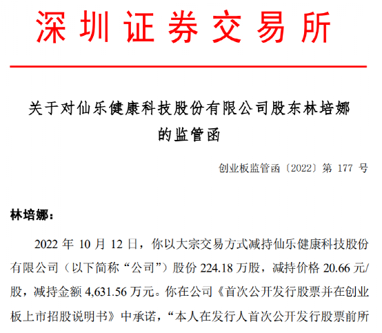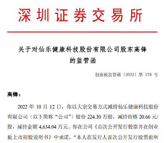 见习记者 骆吴 10月27日,厚交所对仙乐康健(300791)的两位股东下发羁系函,要求他们及时整改违反答应减持股票的举动,杜绝此类题目再次发生。 在此之前的10月12日,这两位股东以20.66元/股的代价,大笔减持持有的刚排除限售不久的仙乐康健股票,减持代价低于经除权除息调解后的发行价,即23.39元/股,违反了公司上市时他们在招股分析书中作出的干系答应。 两位股东违反答应减持股票 据厚交所下发的羁系函披露,2022年10月12日,林培娜以大宗买卖业务方式减持仙乐康健股份224.18万股,减持代价20.66元/股,减持金额4631.56万元。 同日,高锋以大宗买卖业务方式减持仙乐康健股份224.30万股,减持代价20.66元/股,减持金额4634.04万元。 林培娜、高锋在仙乐康健《初次公开辟行股票并在创业板上市招股分析书》中答应,“本人在发行人初次公开辟行股票前所直接或间接持有的发行人股份在锁定期满后两年内减持的,减持代价(如果因派发现金红利、送股、转增股本、增发新股等缘故因由举行除权、除息的,须按照中国证券监视管理委员会、深圳证券买卖业务所的有关规定作相应调解)不低于公司初次公开辟行股票时的发行价。” 仙乐康健股票发行代价为54.73元/股,2020年5月,公司举行权益分派(每10股派3元现金,每10股转增5股)、2021年6月公司举行权益分派(每10股派6元现金,每10股转增5股)、2022年5月公司举行权益分派(每10股派3.999992元现金),2021年9月公司向43名鼓励对象归属16.962万股股票,2021年10月25日至2022年9月30日期间,仙乐转债合计转股619股。 厚交所下发的羁系函称,根据以上事项除权除息调解后,上述两人答应的减持代价应为不低于23.39元/股,他们以20.66元/股的代价减持违反了作出的答应。 厚交所下发的羁系函指出,上述举动违反了厚交所《创业板股票上市规则(2020年12月修订)》第1.4条、第8.6.1条的规定,要求这两位股东充实器重上述题目,罗致教导,及时整改,杜绝上述题目的再次发生。 大笔甩卖 仙乐康健于2019年9月25日在厚交所创业板上市,是国内大型营养康健食品条约生产商之一。 在上市之前,高锋直接持有仙乐康健230.4万股,通过正诺投资持有144万股,共计持有374.40万股,占发行前总股本的6.24%,为公司的发起人之一。 林培娜直接持有仙乐康健138.24万股,通过广东光辉持有230.41万股,共计持有368.65万股,占发行前总股本的6.144%,也是公司的发起人之一。 仙乐康健此次排除限售股份的上市流畅日期为2022年9月26日,排除股份限售的共有4名股东,为高锋、林培春、林奇雄、林培娜,高锋与公司现实控制人林培青是表兄弟关系,林培娜与林培青是兄妹关系。 此中,此次林培娜排除限售数目为311.04万股,高锋排除限售数目为518.4万股,两人此次减持股份数目占其此次排除限售数目的比例分别为72%、43%,可以说是趁着排除限售的时机大笔甩卖了。 以后前的干系买卖业务信息也可以看到,2022年10月12日,仙乐康健发生了2笔大宗买卖业务,总成交448.48万股,成交金额9265.6万元,成交均价20.66元。这些数据与厚交所羁系函中披露的数据划一。 而在9月22日,仙乐康健副总司理杨睿因个人缘故因由申请辞去公司副总司理职务,但辞职见效后,杨睿还将继续担当公司非独立董事职务。克制9月22日的公告披露日,杨睿直接持有仙乐康健股份587.335万股,占公司总股本的比例约为3.26%。此前,杨睿在2021年减持过持有的31.385万股仙乐康健股份。 编辑:舰长 |