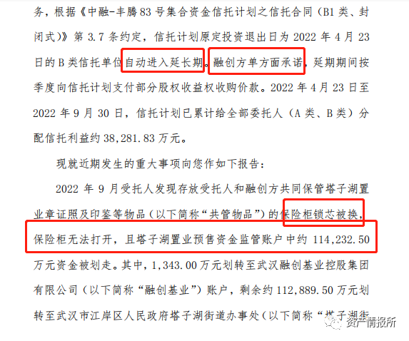 中国基金报 泰勒 融创偷换与中融信托共管的保险柜锁芯、划走15亿? 两边回应 27日晚间,又一起商战力作上演了。 影戏里的商战:西装革履,唇枪舌剑,找法律毛病,钻规则空子,董事会股东会。 现实中的商战:抢公章绑腰带,偷保险柜,换锁芯…… 这一幕发生在融创跟中融信托身上。 克日网上流传一份中融信托针对投资者的《中融-丰腾83号聚集资金信托操持第 2 次临时管理陈诉》。该陈诉称,2022年9月受托人发现存放受托人和融创方共同保管塔子湖置业章证照及印鉴等共管物品的保险柜锁芯被换,保险柜无法打开。 别的,塔子湖置业预售资金羁系账户中约 11.4亿元资金被划走。此中,1343万元划转至武汉融创基业控股团体有限公司账户,剩余约11.2亿元划转至武汉市江岸区人民政府塔子湖街道服务处设立的塔子湖项目专户。 着实不止丰腾83号的11亿被挪走,另有别的一个信托产物,中融-承安 96 号,也被撬锁挪了4.23亿。。 靠近融创的相干人士向体现:“相干资金账户管理是在有关部门的羁系下举行,资金也会用于保交楼,不存在融创私自调用去他途的情况。至于网上流传的种种戏剧性细节,有些八卦。” 而中融信托人士则体现:“变乱发生后,中融信托立刻向融创方提出严正谈判,并第一时间向当地公安构造报警,敏捷采取法律本事,完成了塔子湖置业剩余10%股权及公园大观项目剩余未售在建工程查封。同时多次向江岸区相干政府部门反映情况,协商办理公园大观项目交付及信托操持投资人优点实现的方案。现在资金在政府羁系账户,我司也将在政府的统筹和谐下,最大程度保障委托人权益。” 变乱毕竟是怎么样?为何一件事,两边各执一词? 中融-丰腾83号聚集资金信托操持,建立于2021年3月31日。信托资金金用于武汉市武昌区姚家岭村K1地块、K2地块项目开发。 有上市公司吉华团体就买了这个信托理财,效果公告称踩雷逾期了。投了3000万只收回160多万。 吉华团体的公告体现,这个信托操持此中有三个风险步伐: 1、业绩对赌:会昌置业向中融信托答应投资股权收益权的投资收益目的、目的项目的管理目的,并与中融信托举行对赌生意业务。 2、抵押包管:抵押物1:武汉塔子湖置业以其持有的K3的地盘使用权提供抵押包管。 抵押物2:融科智地(武汉)有限公司以融科天城五期部门商业办公共283套房地产提供抵押包管。 3、包管包管:融创房地产团体有限公司为会昌置业对信托操持的业绩对赌赔偿及股权收益权购买任务提供连带责仸包管包管。 而这个信托操持底层资产为武汉市武昌区姚家岭村K1地块、K2 地块项目开发,实质生意业务对手为融创房地产团体有限公司。 本项目现在处于延期阶段。经中融信托与融创团体沟通,该项目延期至2023年3月31日,利率改为7.5%。项目自2021年3月取得预售证后连续开始贩卖,克制现在往化率66%。现在贩卖均价23000元,周边贩卖单均价为22000元。 该笔信托以武汉塔子湖K3地块地盘、融科天城部门商业办公楼为抵押物,逾期后新增天津、大连部门地块抵押,综合抵押率50%以下。融创房地产团体有限公司为会昌置业对信托操持的业绩对赌赔偿及股权收益权购买任务提供连带责任包管包管。现在抵押率富足。 据《凤凰周刊》报道,这笔信托投入的是融创在武汉的公园大观项目。中融信托在《陈诉》中称,2022年二季度以来,该项目住宅贩卖断崖式下滑,购房人投诉激增,公园大观项目按期交付、信托操持还款均受到影响。 基金君大概看懂了。卖房子的钱(预售),应该先付出给信托的投资人呢?照旧优先保交楼呢? 上市公司董事长聚众饮酒! 被采取逼迫步伐 26日晚间,上市公司山水比德发布公告称,董事长孙虎老师因涉嫌聚众饮酒并引发进一步刑事违法运动,被公安构造备案观察并采取逼迫步伐。 美股方面 美股三大指数震荡,中概股普跌。 |
