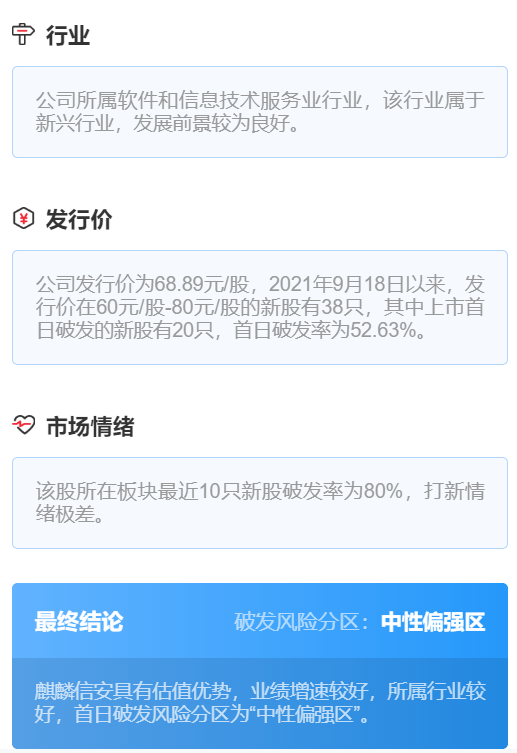 每经记者:闫峰峰 每经编辑:吴永世 各位老铁,本日上市了两只新股,固然大市走低,但此中一只新股表现非常火爆,中一签最高可赚近8万元。本日新股雷达研究员就来聊聊。 它就是科创板上市的麒麟信安。 公司发行价68.89元,上午盘中最高涨至219.78元,最大涨幅达219%,中一签最高可赚75445元。 如果以上市首日盘中最高价盘算,麒麟信安也是年内最赢利的新股,妥妥的大肉签一枚啊。它为何表现云云精良呢? 起首,公司具有很显着的估值上风。据新股雷达数据,麒麟信安发行时的动态市盈率是29.12倍,而可比公司匀称动态市盈率为90.78倍。 其次,公司业绩增速精良。新股雷达数据表现,麒麟信安近几年业绩保持着高增速,净利润从2018年的0.11亿元,增长至2021年的1.12亿元,复合增速达116.74%,而2022年前3季度净利同比增幅达70.05%。 末了,公司紧张从事国产操纵体系开辟,业务具有稀缺性,所属行业远景精良,涉及网络安全、国产更换、信创等多个当下热门概念。 在这些诸多上风的加持下,即便麒麟信安发行价较高,所在板块破发率较高,也不能拦截其成为年内最赢利的新股。 逐日经济消息 |