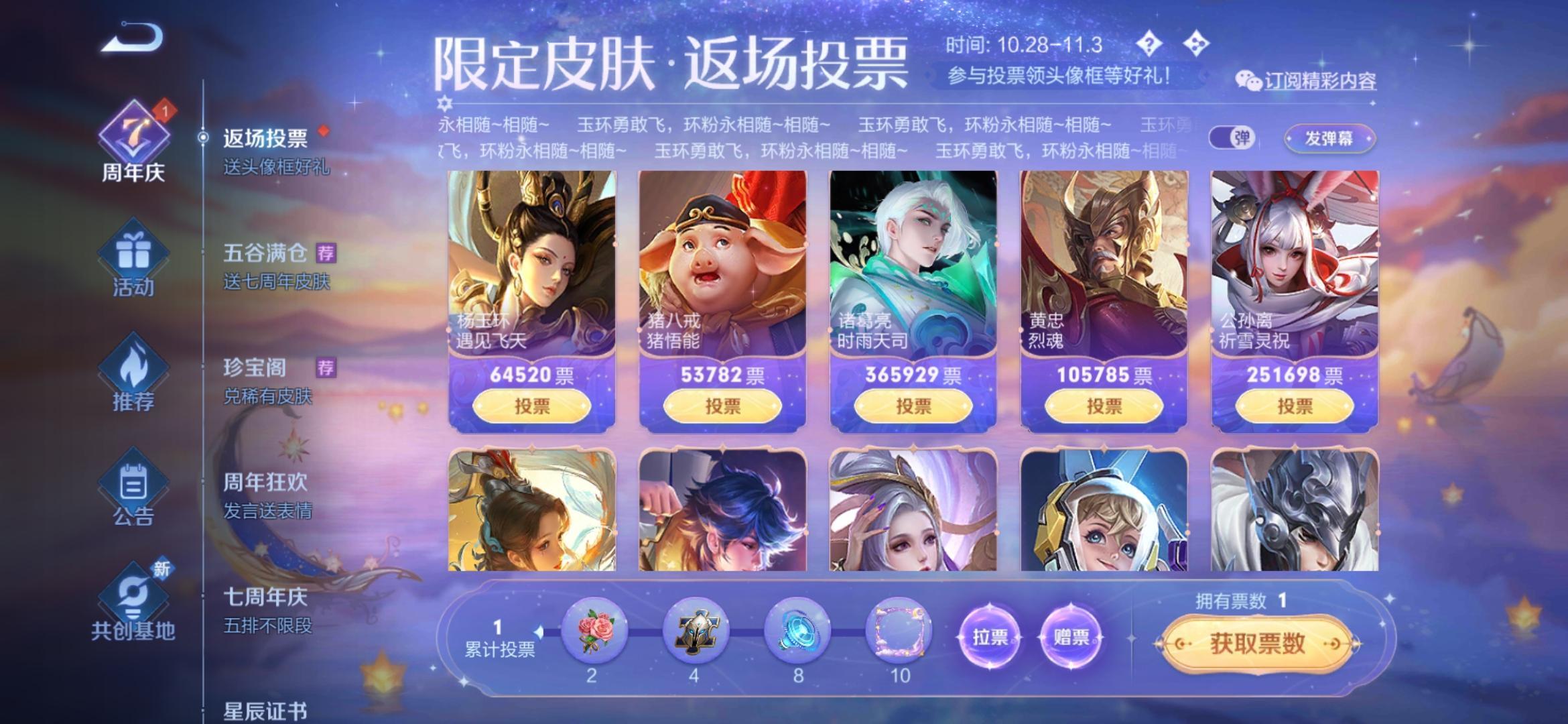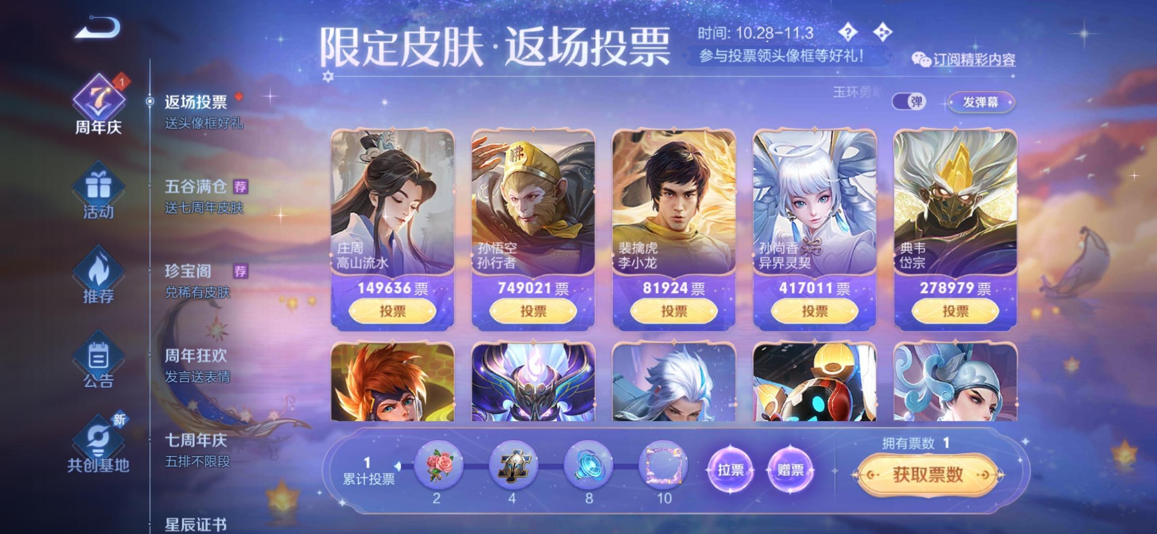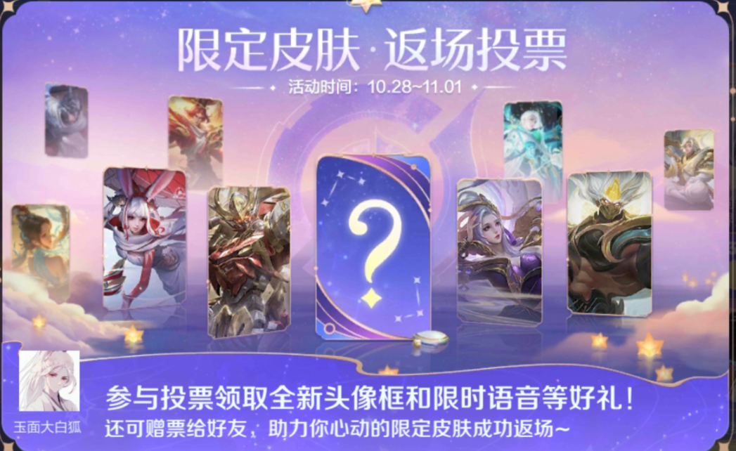 王者光彩在每年的10月份都会举行一次大型的返场运动,其返场皮肤由玩家投票决定,而本年的返场投票运动正在逐区开放,玩家可通过游戏内——运动——【返场投票】运动参加(完成逐日使命得到投票券)。下面一起来看看最新票数: 制止至发稿前(10.28下战书2点),票数第一的孙悟空-孙行者拥有74W票(猴王威武),遥遥领先于其他皮肤,而票数第二的孙尚香-异界灵契拥有41W票,这两款皮肤根本可以确定肯定返场。 票数第三的貂蝉-遇见胡旋拥有37W票,票数第四的诸葛亮-时雨天司拥有36W票,票数第五的典韦-岱宗拥有27W票,票数第六的公孙离-祈雪灵祝拥有25W票。票数紧随厥后的皮肤另有:赵云-龙胆、吕布-御风骁将、韩信-飞衡等。 以上数据为2022年10月28日下战书2点的实时票数,终极票数排名前五的限定皮肤将在11月12日返场,此中票数排在3~5名的限定皮肤只能自选一款返场。从如今的最新数据来看,孙行者和异界灵契最有大概夺得前二,3~5名有大概是遇见胡旋、时雨天司、岱宗。更多王者光彩最新资讯,请关注玉面小白狐! |
