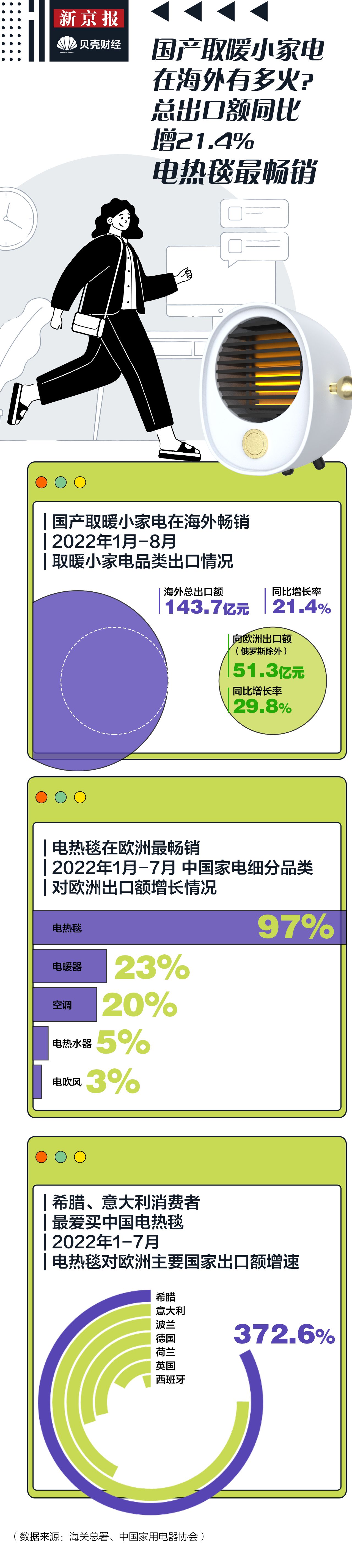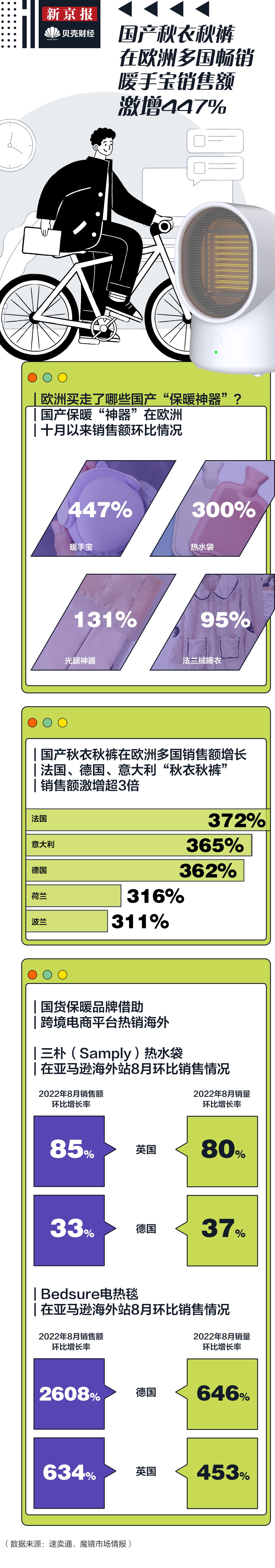 本年欧洲遭遇能源危急,电费、取暖和费用暴涨,为淘汰电费付出,欧洲斲丧者踊跃抢购中国生产的取暖和装备,话题#中国取暖和装备火到欧洲#登上微博热搜。 来自中国的“取暖和神器”火爆出海——加绒丝袜、秋衣秋裤、电热毯、热泵等取暖和衣物和装备在欧洲的出口额呈发作式增长。新京报贝壳财经用数据透视哪些企业从欧洲“御寒”商机中获益?这些御寒衣物和取暖和小家电,都来自哪些省份? 国产取暖和小家电在外洋有多火? 总出口额同比增21.4%电热毯最脱销 不少境外斲丧者选择在中国购物网站上“海淘”取暖和装备,一家位于河北沧州的取暖和装备工厂店客服向新京报贝壳财经记者提到,“本年外洋订单激增,近来没少接转运仓的票据。” 海关总署数据体现,只管2022 年1月-8 月中国家电行业出口额同比客岁有所降落,但取暖和小家电品类总出口额同比增长21.4%,此中,向欧洲(俄罗斯除外)出口额同比增长29.8%。 哪些国产取暖和装备在欧洲大卖?海关总署数据体现,电热毯是国产取暖和装备在欧洲最脱销品类,出口额增速高达97%。2022年1月-7月,家电产物对欧洲出口额增长的品类告急包罗电热毯、电暖器、空调等。此中,我国电热毯对欧洲累计出口额达3340万美元,其出口增速排名第一。 为什么电热毯在欧洲卖得云云火爆?住在英国伦敦的赵密斯在担当新京报贝壳财经记者采访时体现,用电热毯取暖和比开电暖气更省电,赵密斯在淘宝上买了一个水暖毯转运到英国自用。据外媒此前盘算,一条额定功率100瓦的电热毯开一整晚(8小时)所需电费仅为0.42英镑。 在欧洲各国中,希腊、意大利斲丧者最爱购买来自中国的电热毯。海关总署数据体现,2022年1月-7月,我国电热毯对希腊、意大利出口额增长率最高,达372.6%和338.1%,其次是波兰和德国。 国产秋衣秋裤在欧洲多国脱销 暖手宝贩卖额激增447% 国产保暖“神器”正远销欧洲,欧洲斲丧者纷纷“剁手”来自中国的暖手宝、热水袋、光腿神器等过冬好物。据跨境电商平台速卖通提供的数据体现,10月以来,暖手宝、热水袋贩卖额环比增长分别为447%和300%。 欧洲人也开始穿秋衣秋裤了?速卖通数据体现,10月以来,秋衣秋裤在法国等多个国家均有3倍以上环比增长。 多家中国保暖用品品牌出海结果斐然,魔镜市场谍报数据体现,来自江苏常州的“三朴(Samply)”品牌热水袋在亚马逊英国站8月贩卖额高达39.36万元,贩卖额环比上月增长85%,占据亚马逊英国站热水袋品类8月销量榜单第一。 2022年1月-8月,来自江苏无锡的跨境电商品牌“Bedsure”在欧洲亚马逊四国(德国、法国、西班牙和英国)站点电热毯市场份额占比为3.8%,排名第八。魔镜市场谍报数据体现,本年8月,Bedsure品牌的电热毯在亚马逊德国站贩卖额环比上月增长2608%。 出海的“取暖和神器” 告急来自浙江、河北和广东 我国哪些地域是取暖和装备的会合生产地?企查查数据体现,制止2022年9月23日,我国取暖和器、电热毯生产企业告急分布在浙江、河北、广东等省份。 浙江慈溪是我国取暖和器会合生产基地之一,取暖和器生产出口量占天下三成。宁波海关数据体现,本年1月至8月,浙江慈溪取暖和器出口欧盟15.3亿元,同比增长55.2%;据广州海关统计,本年6月至8月,佛山向欧盟出口电热水器、电热毯、电暖器等供暖装备0.94亿元人民币,同比增长154.4%。 氛围源热泵出口额激增数倍 国内取暖和龙头企业加码热泵出口业务 10月14日,美的楼宇科技赴意大利投资新建的热泵生产研发基地正式开工奠定,热泵年产能预计将达30万台。根据财产在线数据,2022年上半年,美的热泵产物出口额同比增长高出200%,出口规模位列中国热泵行业第一。 信达证券以为,热泵作为欧洲电气化的告急战略布局,恒久渗出率提拔趋势较为明确。 中国是环球热泵出口市场的最大出口国。据中国家用电器协会数据体现,我国是欧洲第一大氛围源热泵入口国,占比为60%。 海关总署数据体现,比年来,我国出口欧洲热泵产物销量显着提拔, 2021年中国氛围源热泵行业产物出口总额为7.93亿美元,同比增长99.7%,欧洲为告急出口地。根据财产在线数据,2022年1月-8月,中国氛围源热泵出口额达44.5亿元,同比增长65.7%。 欧洲各国为何鼎力大举推行热泵发展?除实现“碳中和”目标外,欧洲各国还需摆脱传统能源入口依靠。 2022年5月,欧盟公布“RepowerEU”能源筹划,明确提到“将热泵的摆设速率进步一倍,将来五年累计摆设1000万台。”而早在欧盟公布该能源筹划之前,欧洲多国已出台财税政策和欺压性法律法规共同刺激能源转型,如英国对热泵提供补贴,瑞典接纳高碳税、化石气体税和电力税鼓励热泵取暖和。 据信达证券测算,预将来欧洲市场热泵的恒久市场需求量将高出4000万台,对应市场规模将高出4000亿欧元。根据欧盟“RepowerEU”筹划,将来五年欧洲热泵市场有望实现约10%的年复合增长。国内取暖和装备龙头企业如美的、海尔,万和等都在加码热泵出口业务。 |