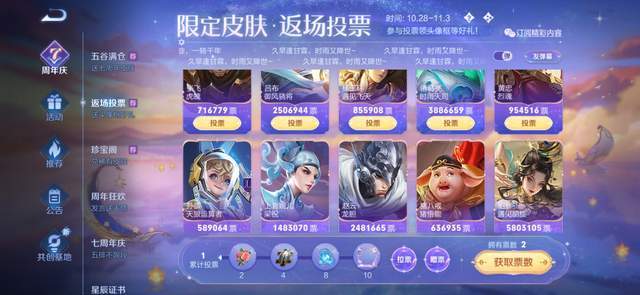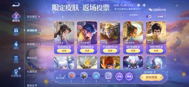 王者光彩正式服已经全面开启了返场投票运动,这次的返场数量和客岁一样,票数靠前的五款皮肤将在11月12日返场,排名靠后的三款皮肤只能选择一款入手。下面一起来看看最新排名和票数:(停止至10月28日晚上8点整) 排名第一的依然是猴子的孙行者,票数高达1130W,远超其他皮肤; 排名第二的是貂蝉的遇见胡旋,票数高达580WW,只有猴子皮肤一半的票数; 排名第三的是孙尚香的异界灵契,票数高达482W; 排名第四的是典韦的岱宗,票数高达388.9W; 排名第五的是诸葛亮的时雨天司,票数高达388.6W; 排名第六的是公孙离的祈雪灵祝,票数高达311W(韩信的飞衡紧随厥后,拥有290W票) 从最新的数据上来看,猴子的孙行者最有大概夺冠,而貂蝉的遇见胡旋是背面追上来的,票数涨幅高于除猴子之外的其他皮肤,以是遇见胡旋的终极票数很大概会是第二名。祈雪灵祝的涨幅很小,乃至不如第七名的飞衡,以是这款皮肤很大概不会返场。 综上,本年的返场投票猜测结果为:孙行者、遇见胡旋、异界灵契、岱宗、时雨天司(排名从左至右),此中孙行者售价888点券、遇见胡旋售价1788点券,异界灵契售价1788点券、岱宗售价888点券、时雨天司售价1788点券,这次返场的皮肤代价偏高,将在11月12日全部上架。更多王者光彩最新资讯,请关注玉面小白狐! |