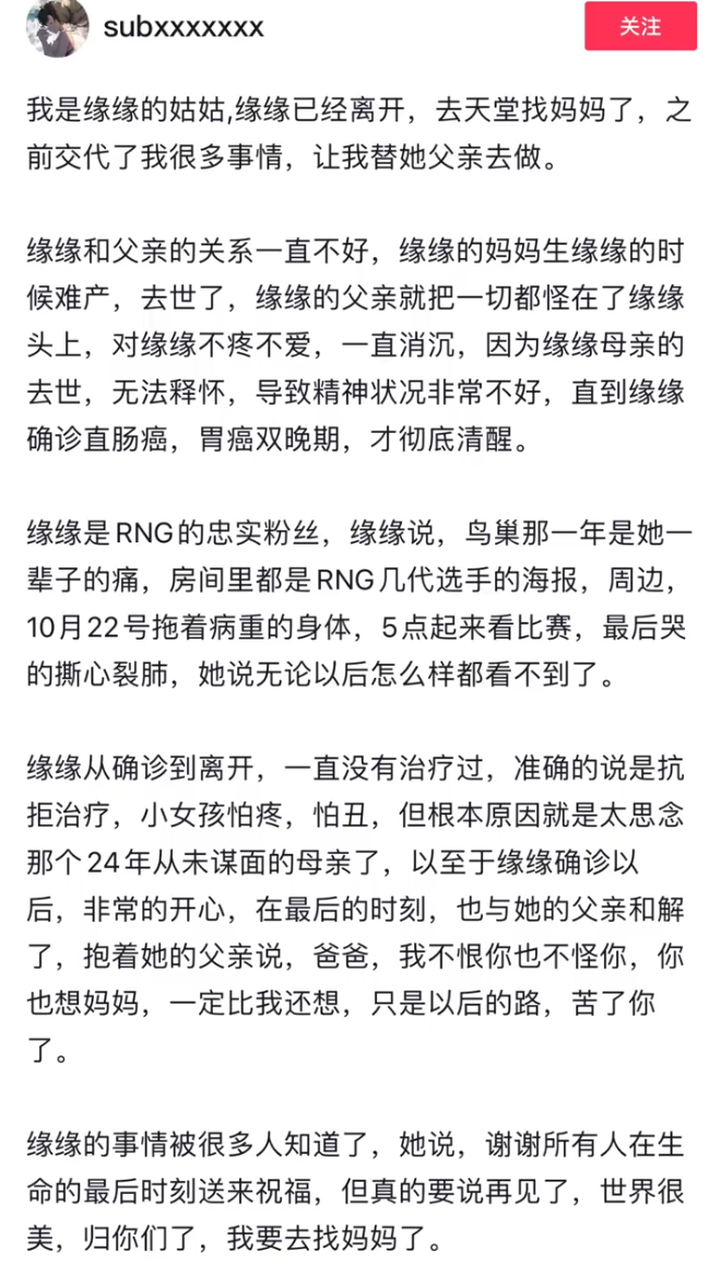 【关注残影游戏,看LOL最新资讯,本日咱们聊聊RNG粉丝缘缘一事】 “我还能陪你继续剑指,但她呢?”,信任RNG的粉丝们近期都看到一位名为“缘缘”病逝的消息了,很遗憾,末了知晓如许一名粉丝会是以如许的方式。在RNG再次对阵T1的那一刻,有粉丝以为这会是复仇,复仇多年S赛败给SKT的汗青,而且尚有不少粉丝以为这会是RNG有力夺取冠军席位的一次。然而终极的效果却脱出了各人的推测,RNG不但没能击败T1,乃至还被他3-0零封抬走。 而在他们开战就之前,就有粉丝曾表现“赢了我狂吹,输了我装死,剑不绝指到烂”,如许的一个心态信任多数粉丝都有,而且各人的年龄也都不小了。这不,该粉丝就直言本身已经30了,但照旧可以继续等下去。可此时缘缘却复兴了他一句“倾心你还能等,我已经没来岁了”。对此,该粉丝也是一脸迷惑,便以哥们的语气扣问了下情况。缘缘也是表明白本身女粉的身份,并说出了本身的病情。 一句“没多久了,本年不夺冠,就再也看不到了”,在其时那条品评下就引发了多数粉丝的感伤,各人都纷纷关注起了RNG的这一位女粉,而且为其送去了私信祝福,在RNG开赛前,也是不停和缘缘一起为其叫嚣助势。然而第一局RNG输了,缘缘也是顿感不妙,但照旧有粉丝安慰道:RNG可以让一追三的。可终极的效果却是0-3直接出局,缘缘想看RNG夺冠的梦也是就此破裂。 对此,缘缘的姑姑也是发文透漏了情况,缘缘带病之躯,却5点对峙起来看RNG比赛,在看到RNG输后哭得撕心裂肺,而哭的缘故原由并不说是RNG输了,而是说:无论以后怎么样,她都看不到了!是啊,我还能陪你继续剑指,但她呢?只要RNG俱乐部还在,S赛还在举行,我们还能继续等S13、S14乃至是S23,但缘缘却等不了了。末了在10.25这一天,缘缘病逝了,RNG粉丝们也是一度破防。 纷纷喊话RNG:粉丝云云的等候,你们对得起谁?缘缘这件事确实令人痛心,但这也同样反应出粉丝对于本身喜欢的战队有多等候。偶尔间真的不是说肯定要RNG可以或许夺冠,但至少要积极,用尽积极就算是输了,粉丝也不会留有遗憾。就比如DK对阵GEN的BO5,他们同样是0-2开局,但是他们呢?仍旧是场场积极,乃至差点就打出了让二追三的战绩,如许的败局,粉丝又怎会怪你没积极? 同时残影也是送给LPL粉丝们一句话,无论是你哪一支战队的粉丝,都请给LPL别的战队一些宽容。你所吐槽的战队,同样也是别人所喜欢的战队,恭敬别人,同样也是恭敬本身。还想送给选手们一句话,一味地的求稳,并不是积极,大概你们的压力确实已经富足大了,但要记取,你们背后不但仅只是本身的战队,尚有浩繁粉丝的等候,肯定要做到每场比赛都用心去打,才华不辜负粉丝们的喜欢。末了再送缘缘一句,“如果有一天RNG能夺冠,我肯定会告诉你”。 PS:100%原创文章,手动打字不易,喜欢的小同伴可以关注一波哦! |