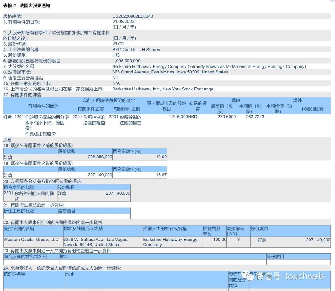 雷递网 雷建平 10月29日 比亚迪股份有限公司(证券代码:002594,证券简称:比亚迪)昨日发布财报。财报体现,比亚迪2022年前三季度营收为2676.88亿,较上年同期增长84.37%;净利为93.11亿,较上年同期增长281%;扣非后净利为83.65亿元,较上年同期增长843.66%。 比亚迪2022年第三季度营收为1170.8亿元,较上年同期增长115.59%;净利为57.16亿元,较上年同期增长350.26%;扣非后净利为53.35亿元,较上年同期增长930.48%。 比亚迪2022年前9个月计入的当局补贴为11.4亿元,此中,第三季度计入的补贴达5亿元,告急是与汽车及汽车相干产物有关的当局补贴。 比亚迪称,为满足生产策划的须要,拟向参股公司东莞市德瑞精密装备有限公司(简称“东莞德瑞”)采购锂电装备,关联生意业务金额预计不高出11.3亿元。 公司全资子公司深圳市比亚迪锂电池有限公司持有东莞德瑞32.5%的股权。 王传福表哥、公司非实验董事吕向阳世接控制东莞德瑞,其旗下融捷股份有限公司持股为55%,广州德瑞企业管理合资企业(有限合资)持股为12.5%。因此,本次生意业务构成关联生意业务。 连遭巴菲特与贝莱德减持 停止2022年9月30日,HKSCC NOMINEES LIMITED持股为37.7%,王传福直接持股为17.64%,吕向阳持股为8.22%,融捷投资控股持股为5.3%,夏佐全持股为2.84%,中央汇金资产管理有限责任公司持股为2.44%; 王念强持股为0.63%,中央汇金资产管理有限责任公司持股为0.41%,李柯持股为0.38%,王传方持股为0.3%。 HKSCC NOMINEES LIMITED 所持股份为其署理的在 HKSCC NOMINEES LIMITED 生意业务平台上生意业务的公司 H股股东账户的股份总和。 此数包罗王传福持有的1,000,000股H股和夏佐全及其控股的外洋公司SIGN INVESTMENTS LIMITED分别持有的195,000股H股和305,000股 H 股;也包罗本陈诉期WESTERN CAPITAL GROUP LLC(系原名为 MIDAMERICAN ENERGY HOLDINGS COMPANY 的 BERKSHIRE HATHAWAY ENERGY COMPANY 100%控制的公司)持有的股份转为 HKSCC NOMINEES LIMITED署理的H股; 停止2022年6月30日,HKSCC NOMINEES LIMITED持股为29.97%,王传福直接持股为17.64%,吕向阳持股为8.22%; WESTERN CAPITAL GROUP LLC (系原名为MIDAMERICAN ENERGY HOLDINGSCOMPANY 的 BERKSHIRE HATHAWAY ENERGYCOMPANY 100%控制的公司)持股为7.73%,融捷投资控股持股为5.29%; 夏佐全持股为2.84%,香港中央结算有限公司持股为2.43%,王念强持股为0.63%,中央汇金资产管理有限责任公司持股为0.41%,李柯持股为0.38%。 2022年第三季度,比亚迪遭遇股神巴菲特两次减持,此中,巴菲特旗下伯克希尔哈撒韦公司在2022年8月24日出售133万股比亚迪H股,每股均匀代价277.1港元,套现约3.69亿港元(约3.25亿元)。 巴菲特旗下伯克希尔哈撒韦公司又在8月25日到9月1日又减持了171.6万股比亚迪H股,减持均价为262.7243港元,巴菲特套现4.5亿港元。 以此盘算,巴菲特两次一共套现高出8亿港元。 2022年10月,环球最大资管机构贝莱德对比亚迪股份H股的持股比例从6.21%降至5.85%。 ——————————————— 雷递由资深媒体人雷建平开办,若转载请写明泉源。 |