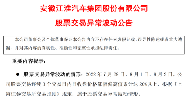 出品 | 子弹财观 作者 | 荷默 编辑 | 蛋总 “造车”原来是一个极重且沮丧的话题,但自从有了互联网科技企业的参加,好像变得非常的魔幻且时髦。“自动驾驶”和“智能座舱”已支持不起资源市场的造车故事,以至于不少造车玩家欲将汽车奉上天。 然而,迩来有祖传统到近乎要被“镌汰”的车企,没有去讲那些高精尖的汽车技能,更别说将汽车奉上天,反而老老实实地投身新能源的转型中,在资源市场却被各路机构和投资者捧上了天。 连续三天大涨20%,连续百日大涨200%……很难想象,一个沉溺至“代工厂”的四线车企,却能走出一个让浩繁偕行都惊奇的“逆天行情”。 1、逆天行情 8月3日,江淮汽车公告称,公司在2022年的7月29日、8月1日和8月2日,股票生意业务连续3个生意业务日累计涨幅超20%。按照上交所的规定,属于非常颠簸情况。对此,江淮汽车在对自身企业举行自查后表现,公司生产谋划情况正常,并没有什么影响股价颠簸的非常情况。 图 / 江淮汽车官方公告 同时,这份公告还重申了7月15日发布的“2022年半年度业绩预亏”预报。公告称2022年上半年江淮汽车归母净利润预计亏损7.07亿元,归母扣非净利润预计亏损10.75亿元,末了还不忘向投资者作风险警示。 然而,就在这份“股价非常颠簸”公告发出的第二天,江淮汽车股价不但制止了大涨走势,转而大跌4.89%,盘中一度跌至10%。 连续三天股价涨幅超20%,这种大涨在江淮汽车上市20年来算是非常少见的。但在2022年已并非第一次了。「子弹财观」发现,在稍早前的5月24日,江淮汽车同样因股价大涨而作出“股价非常颠簸”的警示公告。 若拉长时间周期来看,江淮汽车的这一轮股价大涨劈头于四月尾。数据表现,江淮汽车每股代价从4月26日的7.15元上涨至8月2日的21.74元,在不敷百天的时间里,累计涨幅达204.06%。 图 / 东方财产APP 三个月时间股价翻了三倍,别说单从江淮汽车的汗青走势看,即便是放眼国内整个汽车财产都极为少见。 固然,这一轮暴涨背后最大的推力,一方面是江淮汽车2021年较好的红利表现,另一方面则是其连合华为造车的听说。 2022年4月23日,江淮汽车发布2021年年度陈诉(修订版)。年报数据表现:江淮汽车2021年实现业务收入402.14亿元,同比降落6.11%;归母的净利润2.00亿元,同比大涨40.24%。 再加上二季度天下多地推出以“购置税减半”和“汽车下乡”为主促进汽车斲丧的政策利好,汽车股迎来了团体上涨,借势发力的江淮汽车也开启了一发不可摒挡的小牛行情。 紧接着在5月23日,华为公布“2022华为开发者大会”将于6月15日举行。当日,鸿蒙概念股团体上涨,江淮汽车忽然直接涨停。越日,江淮汽车发布了“股价非常颠簸”公告。 果不其然,在华为开发者大会的前一天6月14日,有媒体曝出“华为智选”已经在行业里大范围放开,除小康(现更名“赛力斯”)之外,已经相继与江淮汽车、奇瑞汽车以及极狐汽车等敲定智选车业务互助。对于这一听说,江淮汽车相干人士对外界的回应是“不清晰情况”,华为方面选择避而不谈。 未经证实的听说频频挑动着资源市场的感情,各路资金都试图使用江淮汽车誊写出下一个“小康”神话。 对此,「子弹财观」在7月初发表的《神坛上的问界,小康股份可否摆脱对华为的依赖?》中,曾提及江淮、奇瑞、长安等品牌相继联手华为造车,从而打乱小康连合华为造车的美梦。 现在看来,在这已往的一个月时间里,小康股价团体下行了20%,而江淮汽车在已往的7月大涨了近30%,可见投资者们对华为连合造车的企业极其敏感。 2、发力新能源 究竟上,江淮汽车连合华为造车这一传言确实未经证实,若将其股价大涨归结于连合华为造车,不免会让人以为有些过于单方面。究竟,同样连合华为造车的北汽,也不见得就能复制小康股价飙涨的神话。 在「子弹财观」看来,江淮汽车备受资源市场的追捧是在新能源市场的转型上取得了较为可喜的效果,而连合华为造车则是在这一效果上多加了一份对将来的期许。 「子弹财观」在查阅江淮汽车2021年年报发现,资产负债表中的在建工程账面代价约9.74亿元,同比大幅增长141.84%。 按照财报管帐科目的表明,在建工程是指企业新建、改建、扩建或技能改造、装备更新和大补缀工程等尚未竣工的工程付出。于车企而言,就是为汽车的生产和贩卖所做的投入预备。 过细发掘发现,在这9.74亿元的在建工程账面代价中,有4.66亿元是用在“新能源乘用车车身零部件创建项目”上,占总在建工程的近一半,是上年同期的31倍。别的有约3.25亿的账面代价用在新能源乘用车的产线搬迁和改造上,而2020年度则没有这笔付出。 图 / 江淮汽车2021年年报 云云看来,江淮汽车2021年在建工程的大增,且近八成是用在新能源乘用车的生产投入上,这一点在连合华为造车的小康和北汽身上好像也出现过。 于江淮汽车而言,2021年的归母净利润也才近2亿元,而在新能源乘用车产线的创建投入上就豪掷近10亿元。至少可以认可的是,江淮汽车在新能源汽车上的投入是大手笔的。 既然江淮汽车云云器重新能源乘用车业务,那新能源业务对江淮汽车的贡献又有多大? 「子弹财观」查阅江淮汽车比年来来的贩卖业绩公告发现:2022年前7个月江淮汽车(含底盘)累计产量达28.06万台,累计贩卖达27.90万台,此中新能源乘用车累计贩卖9.73万台,占总销量的34.88%。 从本年的前7个月贩卖数据走势来看,历月汽车总