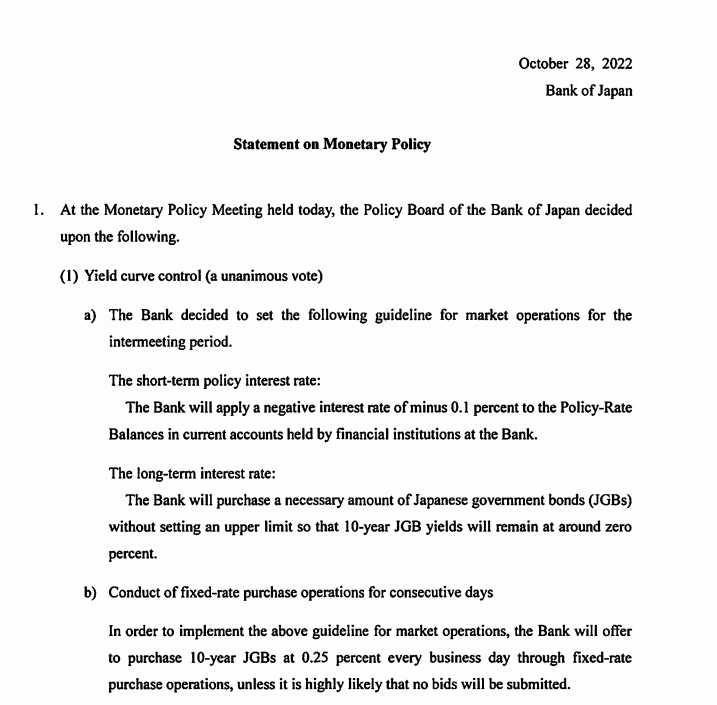 中新经纬10月28日电 据日本共同社报道,日本央行在28日的钱币政策聚会会议上,决定维持诱导短期利率在负0.1%、长期利率在0%左右的大规模钱币宽松政策。 日本央行网站截图 别的,2022年度消耗者物价上涨率预期被上调至2.9%,国内生产总值(GDP)增长率预期被下调为2.0%。 市场方面,日本两年期国债收益率跌至负0.050%,创10月18日以来最低。 日经225指数低开震荡回升,停止发稿跌0.49%,报27211.13点。(中新经纬APP) |