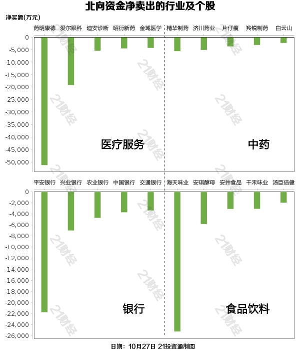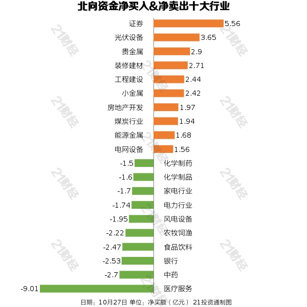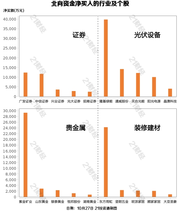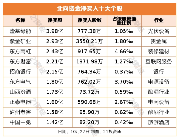 据21投资通智能监测,北向资金已一连三日净流入,10月27日,北向资金净买入9.59亿元,此中沪股通净买入14.58亿元,深股通净卖出4.99亿元。 增持证券,减持医疗服务 从净买入金额来看,北向资金增持了65个行业,此中证券居首,净买入金额达5.56亿元,其次是光伏装备行业,净买入3.65亿元。 北向资金减持了35个行业,此中医疗服务最多,净卖出金额达9.01亿元,其次是中药行业,净卖出2.70亿元。 净买入隆基绿能3.98亿元,净卖出药明康德5.11亿元 个股方面,北向资金净买入隆基绿能(601012.SH)、紫金矿业(601899.SH)、东方雨虹(002271.SZ)、东方产业(300059.SZ)、招商银行(600036.SH)居前,此中,隆基绿能被净买入3.98亿元,紫金矿业被净买入2.93亿元,东方雨虹被净买入2.43亿元,东方产业被净买入2.21亿元,招商银行被净买入2.15亿元。 北向资金净卖出药明康德(603259.SH)、贵州茅台(600519.SH)、恒瑞医药(600276.SH)、海天味业(603288.SH)、牧原股份(002714.SZ)居前,此中,药明康德被净卖出5.11亿元,贵州茅台被净卖出3.04亿元,恒瑞医药被净卖出2.61亿元,海天味业被净卖出2.52亿元,牧原股份被净卖出2.41亿元。 (声明:文章内容仅供参考,不构成投资发起。投资者据此利用,风险自担。) |