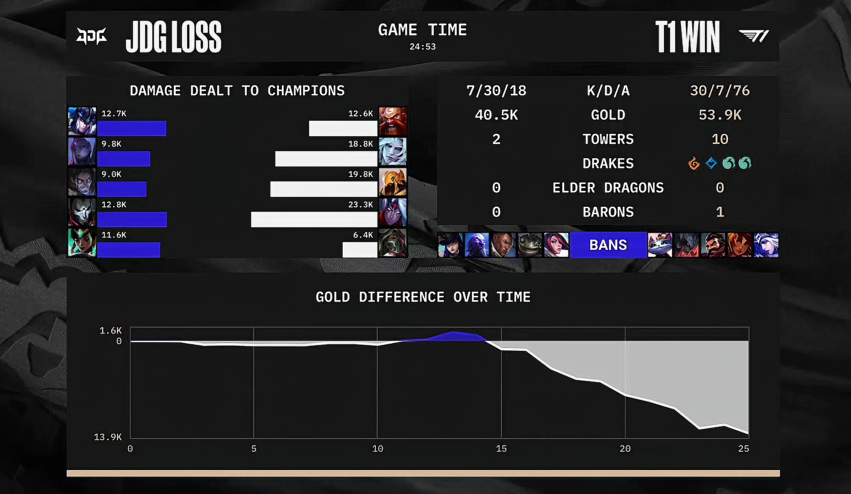 好汉同盟S12火热举行中,腾讯消息将为您带来一手赛事资讯,为您出现全方位的电竞盛宴。 本日10月30号好汉同盟S12四强赛,JDG战队面对T1下路被打爆,固然第一把角逐有队友兜底四打五险胜,但背面两把填不上AD缺口,还被瑞兹各种偷家偷大龙,两连败被逼入绝境。到了第四场角逐JDG战队不头铁,老实禁用卢锡安和瑞兹,但照旧没能赢下角逐。终极JDG战队以1比3得分不敌T1止步四强,引发LPL讲授热议,Uzi直言下路打不外,让我们来看看双方阵容! JDG战队选用猪妹、虚空女皇、塞拉斯、烬、卡尔玛;T1战队选用烈娜塔、酒桶、沙皇、佛耶戈、韦鲁斯。 前期JDG辅助走位靠前送一血,但369猪妹舍弃兵线走到下路,帮AD缓解压力,Kanavi虚空女皇也是各种刷野发育。直到14分钟T1双人组对卡尔玛动手,满血烬有闪现却在旁边原地走位,末了照旧送出双杀。同时JDG中上野也在打斗,但Faker沙皇临死前把三人推进塔里,导致JDG战队惨遭团灭。 16分钟JDG战队跟T1打先锋团,但被烈娜塔大招掷中四人,再被Faker沙皇追击回推,连死四人。18分钟JDG战队试图继续打斗,但猪妹瞬间被强杀,再被Faker沙皇推飞三人,又是一波团灭。19分钟JDG战队又在下路搞事,再送出四个人头和大龙,彻底上头送疯了。 22分钟JDG战队强行抓死沙皇,但再次迎来团灭,丢掉上路高地。24分钟T1战队抱团推进下路,轻松碾压虐泉JDG,以3-1得分赢下角逐胜利,Faker时隔五年重回S赛决赛舞台! JDG战队不敌T1止步四强,只能说技不如人甘拜下风。看得出JDG中上野已经积极,但运营战术被完爆,纵然第一把上风那么大,经济差距也是拉不开的,末了一把被打得忙乱失措,无脑打斗垃圾时间让民气累。 特殊是JDG下路被打成突破口,笑笑在二台讲授感慨本年天下赛LPL下路没赢过,本身不练女警,永世放在BAN位,LPL四队在镌汰赛阶段连禁12把女警,结果被一个没见过的好汉干死了,那还不如放一把女警出来看一看呢。Uzi也是点名下路:“我感觉JDG这个卡尔玛加烬,整个天下赛训练都不凌驾三把,但就是打不外T1下路,只能拿别的东西试一下!” 时隔五年Faker重回天下赛决赛,LPL队伍惨遭团灭,LCK内战夺取S12天下冠军,LPL讲授纷纷发文热议:米勒感慨T1有种不可克服的感觉,余霜梦回S7,管泽元和管泽元回想LPL暗中年代,笑笑一言难尽还在纠结女警,若风直言下路差距太大,WE草莓更是喊话:“对线被爆了,哎,我想Uzi了!” LPL队伍已经很久没输得那么彻底了,全部人都没想到LPL下路有活着界赛成为最大突破口的一天。只能说LPL赛区大概有进步,但LCK赛区的进步速率更快,将来两年新人的涌现、全面的技战术打法、专注的意志、积极的精力,都是我们必要提拔的! 那么各人对于JDG不敌T1止步四强的这件事有何看法?欢迎留言,分享你的看法! |