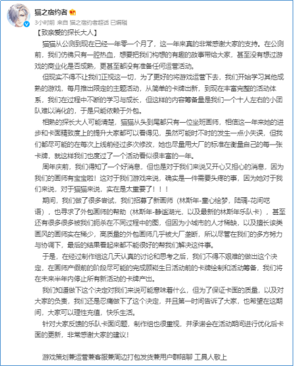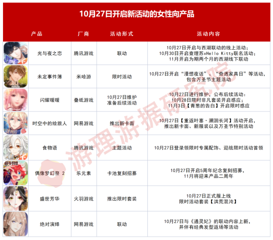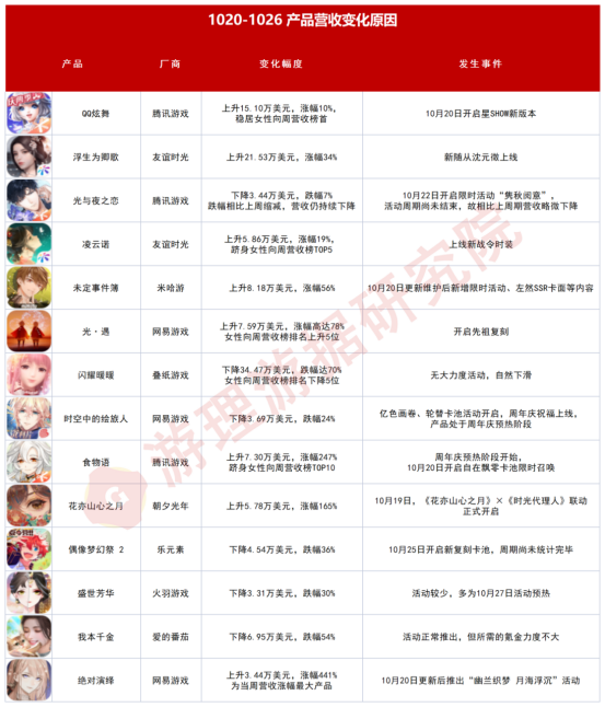 导语:女性向游戏周报是游理游据研究院基于游戏日报亿级读者和十万级从业者用户所打造的细分佳构游戏范畴系列陈诉,是相识女性向游戏市场最新动态的必备参考。 通过对市场现有的女性向产物举行长线跟进与第三方数据网络,整理出当周iOS渠道营收TOP15的女性向产物,并综合当周新增用户、预估流水以及外围讨论热度对当周女性向产物的综合热度指数举行排序,挑选当周体现优秀的产物举行分析与解读。 本期看点: 1、基于对产物内容更新活泼周期以及三方平台的运营环境汇总分析,本周新增3款非活泼产物,分别为《一千克拉女王》、《猫咪后院》、《灵猫传》。 2、多款女性向产物会合10月27日开启新活动,包罗《光与夜之恋》、《未定事故簿》、《闪灼暖暖》、《时空中的绘旅人》、《食品语》、《偶像梦幻祭2》、《绝对演绎》、《盛世芳华》等产物在内,活动情势不限于卡池招募复刻、限时活动、联动等。 3、旦夕光年《花亦山心之月》官方发布微博责怪《迷你天下》短片LOGO抄袭其游戏LOGO,该条微博被《花亦山心之月》玩家爱称为“字节嫡女复出记”;同时,《花亦山心之月》与《韶光署理人》的联动版本热度不减,日流水仍保持在较高水平。 4、拉风游戏《猫之宿约者》官方发布长文称,由于核心画师产假缘故起因以及外部因素,将在将来半年内制止全部新活动的卡牌产出。除此之外,文中官方亦对自身产物“贸易化不敷”、接纳外包方式的履历举行反思与陈诉。消息发布后,《猫之宿约者》玩家体现明白并对官方给出鼓励。 5、王牌游戏全新女性向游戏《代号:境》于10月25日发布PV并正式开启预约,根据产物先容,玩家将扮演穿越到已经死去的“王女”身材中的魂魄举行嬉戏。停止发稿产物位于TapTaop预约榜首,预约量高出5万。 一、游理游据研究院女性向范畴周报关注范围 如今游理游据研究院统计在列的女性向游戏超百款,周报关注范围内的产物更新为86款,紧张包罗游戏计划以女性玩家喜欢为紧张参考,专门针对女性开发的游戏。除主流所普通认知的乙女类游戏,别的还包罗小部门上线安稳运营后,女性玩家现实占比70%及以上,具有肯定研究代价与意义的产物。 本期对市面上大部门女性向产物举行活泼度分类,将86款产物分为活泼与非活泼范例。此中,活泼产物(指在近半年间更新较为频仍的产物)63款,非活泼产物(指半年内没有更新内容、内容更新较为痴钝、买断制以及停运产物)23款。 此中,本周活泼范例产物中新增王牌游戏新产物《代号:境》。该新游于10月25日首曝PV并开启预约,玩家将在游戏中扮演一位穿越到死去的王女身材中的魂魄举行嬉戏。 本周非活泼范例产物新增3款,包罗《一千克拉女王》、《灵猫传》、《猫咪后院》在内。此中,《一千克拉女王》、《猫咪后院》间隔前次更新时间较久,《灵猫传》处于停运阶段正等候研发方重新开启运营。 二、一周最具代价榜单环境 1、女性向游戏周热度指数TOP15 “女性向游戏热度周榜”是游理游据研究院综合超话新增贴/话题讨论度、产物周营收数据、新增用户下载数等多方面指标加权,评出终极榜单,仅供参考。本期(1020-1026)排名较上期(1013-1019)厘革大抵如下: 本周,腾讯游戏《QQ炫舞》仍稳居周热度榜首,产物开启星SHOW新版本,流水激增,团体热度受营收指数厘革影响较大;北极光工作室《光与夜之恋》于10月22日开启新活动,讨论指数、营收指数回暖,相较上期总热度指数上升16.33;米哈游《未定事故簿》开启限时活动,新增左然SSR卡面,营收指数、讨论指数均上升;网易游戏《绝对演绎》开启新活动,营收指数上升,领导产物进入本周总热度榜TOP15。 别的叠纸旗下《闪灼暖暖》活动较少,热度排名降落6位,跌出TOP3;《古迹暖暖》同样由于进入一样平常平庸期,热度指数下滑,跌出本周热度指数TOP15;《恋与制作人》本周推出新活动“风月怪谈”,并通过向玩家发送视频短信的方式举行推送,产物在iOS脱销榜排名有所回升。 在本周,多数女性向产物会合在10月27日推出对应活动,《光与夜之恋》、《未定事故簿》等8款关注范围内的产物将要开启新活动且缘故起因、情势多样,包罗但不限于联动、周年庆等情势,详情如下表: 2、女性向游戏iOS预估周营收榜单TOP15: 本周iOS预估周营收榜单TOP15总收入共计475.47万美元,相比上周上升18.62万美元,团体收入增长。固然上升幅度没有上一周期大,品类团体呈上升走势。共同即将到来的万圣节,部门产物已提前开启预热活动,预计在下周品类团体营收会更上一层楼。 本周iOS收入前三的女性向游戏依次为腾讯游戏《QQ炫舞》、友好韶光《浮生为卿歌》以及北极光工作室《光与夜之恋》,此中《光与夜之恋》10月22日开启限时活动“隽秋阅意”,迎来流水、讨论度的回暖,跻身本周周营收榜单TOP3。 值得留意的是,网易游戏《绝对演绎》推出与《通灵妃》的联动新内容,iOS渠道营收涨幅高达441%;腾讯游戏《食品语》开启限时卡池召唤,流水数据回升,环比上期增长247%,跻身本周iOS周营收榜单TOP10;旦夕光年《花亦山心之月》仍处在《韶光署理人》联动期间,活动反馈良好,流水仍维持较高水平。 本期(1020-1026)排名及与上期(1013-1019)厘革大抵如下: 三、本周舆论事故 《花亦山心之月》责怪《迷你天下》LOGO抄袭,被玩家点赞为“字节嫡女复出记” 10月25日,旦夕光年《花亦山心