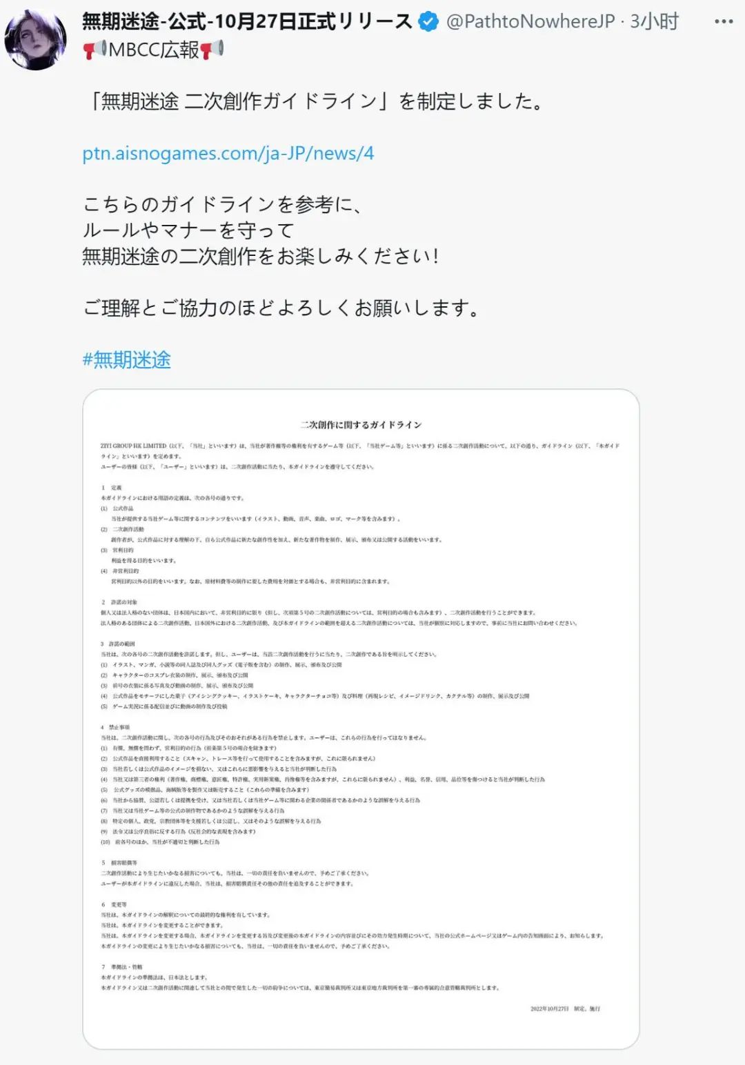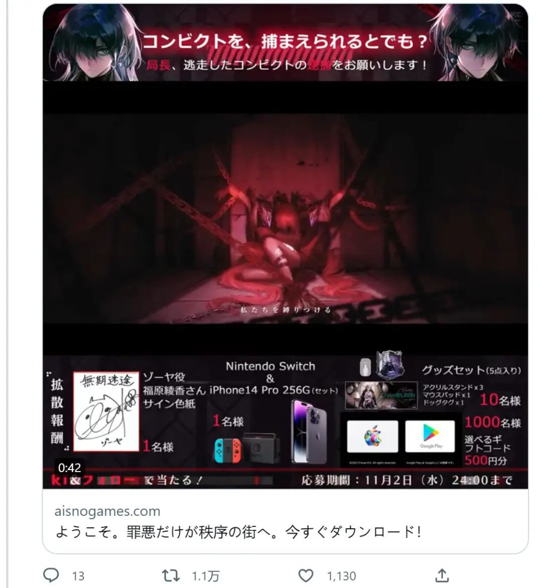 在开启环球预约一个月后,10月27日,《无期失路》正式登岸外洋市场。短短不到三个月的时间,这款游戏就完成了外道二次元从国内上市到外洋表态的又一次告急飞跃。 陪同着此次外洋上线的,则是一份颇为亮眼的答卷:在一个月的预约期内,这款游戏的环球预约量就突破了200万次。而在上线之后,《无期失路》也一举斩获多国免费榜第一,终极率先在韩国取得iOS脱销榜第7的结果。 不外《无期失路》日服上线恰好撞上了近期日本大火的《Memento Mori》、以及游族的《Echocalypse -緋紅の神約-》,在日本的结果则是位居第43位。 位居韩国iOS脱销榜第7 在数据之外,作为国产外道二次元游戏的开路前锋,《无期失路》在外洋的体现在其他维度上也仍有不少值得探究的话题,此中最焦点的便是,这套外道二次元的打法,怎样做好本地化?又可否被外洋玩家至心担当? 外洋开服怀念PV 超前社群运营,无死角的本地化包装 作为一款血统纯正的二次元游戏,在出海这件事上,将眼光起首聚焦日本市场自然是根本操纵。而从近两年GameLook对国产二次元游戏的出海报道来看,国内厂商们对于怎样在日本举行本地化运营好像也正愈发得心应手。只管预约期仅有短短的一个月,但《无期失路》在日本市场的宣发和运营却显得从容不迫,颇为成熟。 起主要说的固然是日本玩家最器重的推特运营。在游戏上线前,官方就已经开始了非常具有代入感的官推运营,不光有细致的游戏人物先容、游戏玩法科普以及例行的逐日倒计时海报,在话术包装上也颇为依照游戏内“犯罪观察”的设定,大多数文案的起笔都是赞叹号、颜笔墨或Warning(告诫)如许布满警示的表达。 同时,官方还以“谁是犯人”为主题以笔墨推理游戏的方式与玩家举行抽奖互动,变更起玩家积极性的同时,也让“与罪犯相助”的风格化游戏设定愈发深入民气。 而在线下,这种风格化的包装也“无孔不入”。好比这些出现在二次元圣地东京秋叶原地铁站的巨幅广告,从人物选择到笔墨的缝隙结果,再到阴郁的色调,尽显外道叙事的独特画风。 不外,最让GameLook感到不测的,照旧官方的超前运营意识。就在游戏上线的同时,日服官推就发布了游戏同人创作的相干规范,只管这也是头部二次元游戏的标配,但鲜少有游戏会在上线之初就发布云云体系细致的同人创作政策。特殊是思量到这款游戏的人设与剧情正是其焦点竞争力所在,同人创尴尬刁难游戏的长线运营至为告急,此次规范的发布就更具未雨绸缪的战略意义了。 固然,政策只能起到引导作用,同人生态的繁荣与否归根结底照旧取决于玩家的认可度与生动度。于是标题也随之而来,外洋玩家们对《无期失路》究竟有何见解? 帅气的悦目,也能征服外洋玩家 就在上周,风格化拉满的二次元卡牌放置手游《Memento Mori》以100万的环球预约量开服,并一度冲上日本iOS脱销榜第二位。这也意味着,同样风格化十足的《无期失路》,200万的环球预约量虽不算天量,却也拥有了足以支持其成为爆款的用户底子。 在游戏开服的第一时间,官方就发布了怀念PV,并开启了日推玩家喜闻乐见的抽选运动。除了声优福原绫香的署名色纸,iPhone 14 Pro+Switch游戏主机的豪华组合以及App Store与Google Play礼物卡等丰厚的嘉奖也引发了玩家们的转发欲。不到5小时,抽选推特的转发量就突破了1万次,这也从侧面反映出日服玩家的生动度。 而以游戏日文名为话题在推特上举行搜索,每一次革新页面,都能多出几条日本玩家的真实分享。至于这些分享的内容,自然是对人设与剧情最由衷的歌颂。 好比有玩家就体现,固然仅仅只完成了雷同序章的游戏内容,但已经以为这款游戏会很风趣,由于这些脚色的筹划太锋利了。 更多的玩家则直接晒出了游戏立绘和截图,并直言超等喜好这种立绘风格。看来,在王道叙事同样占主流的日本市场,这种不走平常路的外道画风同样能激起玩家们的游戏热情。 固然,这份对外道风格的认可,并不光来自日本玩家。在日语官推选行抽选运动的同时,《无期失路》的英文官推也开启了包罗iPad Pro、周边和礼物卡在内的抽选运动,为西欧玩家也带去了开服福利。 而对于独特的外道叙事,英文玩家同样绝不粉饰心田的喜好。好比有玩家晒出剧情截图并体现,这是又一款主角能与反派产生暧昧关系的游戏,这看起来非常酷。 尚有玩家在试玩过后直言,这款游戏有着非常吸引人的精彩美术体现,到现在为止他的游戏体验都非常风趣。 至于韩国玩家,也对游戏的人设非常着迷,一位看上去是女性的韩国玩家发推体现自己疯狂执着于抽卡,由于着实是想见到自己还未见过的全部脚色。换言之,使她着迷的已经不光单是立绘,而是与每一位“坏坏的脚色”的邂逅,以及相识他们背后的故事。 别的值得留意的一点是,日推同人创作政策的未雨绸缪也被证明黑白常有效的。由于就在游戏开服后不久,已经有来自外洋的画师分享了自己的同人插画。好比下面这位韩国画师的插画就已经劳绩了数千次点赞。 而在一位人气日本画师的插画作品批评区,玩家们批评中用到最多的不是“卡哇伊(好可爱)”,而是“卡阔伊(好帅气)”。这一细节既体现出王道与外道在风格上的明显差别,也又一次印证了二次元爱好者对这种独特的风格有着不亚于传统日式王道二次元的欣赏与喜好。 初战告捷只是开始,外道叙事仍存长线挑衅 地产圈有句名言