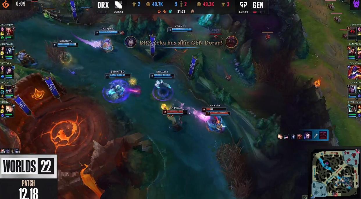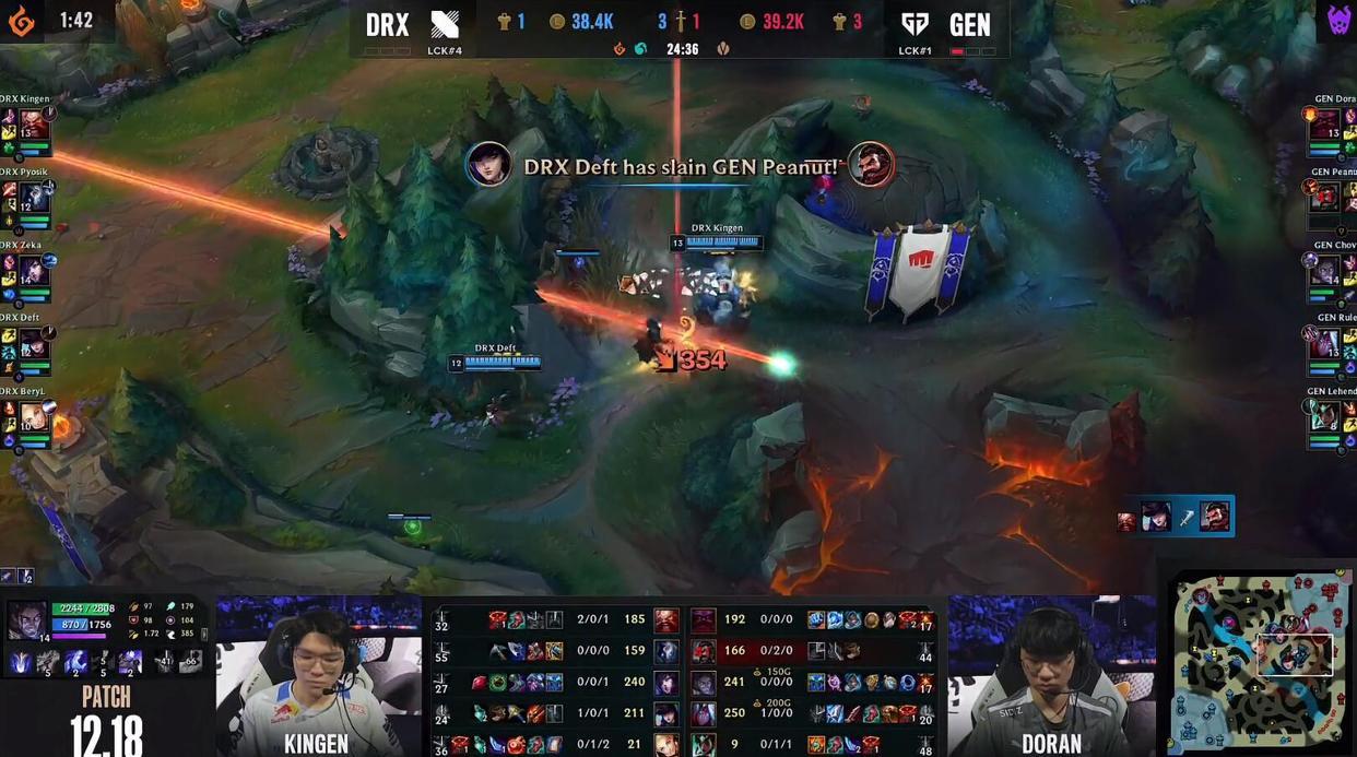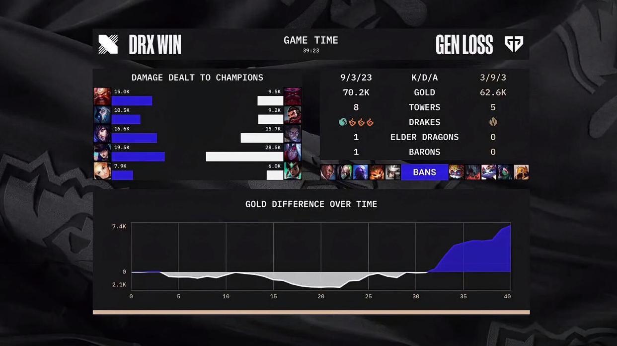 2022年10月31日,S12环球总决赛四强战第二场DRX对阵GEN,首场角逐GEN以比力大的领先碾压DRX拿下角逐。 第一局:S12四强战:GEN变奏敏捷击穿DRX!双C发力GEN先下一城 第二局BP: DRX选择按掉炼金,让GEN不得不吃下猫咪这个BAN位,同时选择按掉了卢娜以及瑞兹。本身则是一手抢下女警,在Peanut点出男枪后选出Pyosik招牌千珏作为应对,辅助则是女警的好搭档拉克丝。 GEN则是继续选择Chovy的塞拉斯,第二轮没有点出通例的EZ卡尔玛来对抗女警,而是点出上一场尺帝发挥出色的维鲁斯,双人组带出双彗星主打一个长手POKE斲丧来解女警。双方上单互出工具人抗压没有太多说法。 角逐阶段: GEN前期通过男枪的野区计划硬换野区,让女警拉克丝的前期压抑打不出来,不外DRX的应变也很敏捷,千珏换掉红BUFF后直接绕视野和男枪错开下路脱手,但Beryl的先手没能Q中卡尔玛,尺帝维鲁斯反手一套的伤害略显浮夸,彗星直接砸死了拉克丝,DRX的女警体系出大标题。 不外幸亏Zeka在中路再度对线取得对Chovy的领先,让千珏在开局倒霉的环境下一连吃到印记以及前锋,而且突然的一波集结直接拔掉了GEN中路一塔,GEN则是交换到小龙。 但是双人组的劣势照旧太大了,Deft险些是不绝在玩走位游戏,不绝被尺帝斲丧,GEN险些是平推了DRX上下两座一塔,第二轮资源DRX依赖先推中路一塔的视野上风顺遂控下小龙,前锋则是由GEN控下。 21分钟小龙团,又是Zeka!狐狸的先手直接打出尺帝双招,GEN不得不将阵型今后拉,DRX在被GEN窒息的运营节奏压抑之下拿下小龙。 22分钟,男枪进野区吃到拉克丝Q技能,直接被女警拉克丝一套打残,酒桶直接交出TP绕后,Zeka狐狸三段大招贴脸留住卡尔玛,DRX打出追击局面拿到0换2,但幸亏残局Chovy完成了兜底,先是打出千珏大招,随后又偷拉克丝大招打残DRX多人血量,让DRX没能把节奏起得更大。 后续男枪野区再度被逮,女警拉克丝的长途输出共同酒桶的一连控制拿下男枪人头。 26分半小龙团,GEN在夷由之间被DRX敏捷控下听牌火龙退却,GEN白交中上两个TP。 28分钟,GEN抓到Pyosik时机,率先打出千珏大招后依赖维鲁斯和男枪远间隔的技能收下千珏人头,GEN拿到人数上风选择动大龙,但POKE流维鲁斯Rush大龙确实有点慢,DRX四打五逼退GEN还拿下Chovy人头。 31分钟龙魂团,Zeka!又一次站了出来,先手再度打出尺帝双招,随后Kingen酒桶炸出好大炸回奥恩的同时让GEN前后排彻底割裂,DRX率先处置惩罚掉奥恩后Zeka又是精准R闪先手留住维鲁斯,资助DRX完成0换2后火龙魂大龙全收!GEN则是选择了硬换DRX下路高地。 后续DRX将经济拉开到5K,而且破掉GEN中路高地。 38分钟太古龙团,GEN选择让Chovy下路单带扳连DRX但也怎样不了酒桶,正面团战DRX处置惩罚得相称岑寂,小花生绝命进场抢龙被Pyosik千珏大招保下太古龙,正面团战也是DRX完胜,收下太古龙后DRX顺遂一波竣事角逐,扳平比分! 赛后数据,固然GEN前中期长时间保持领先,但Zeka的发挥着实太出色了,硬是把濒临崩盘的女警体系带活了过来。 MVP毫无牵挂的给到了Zeka发挥惊艳的狐狸,正如赛前宣传片Zeka所提到的那样,让天下记取了他。 |