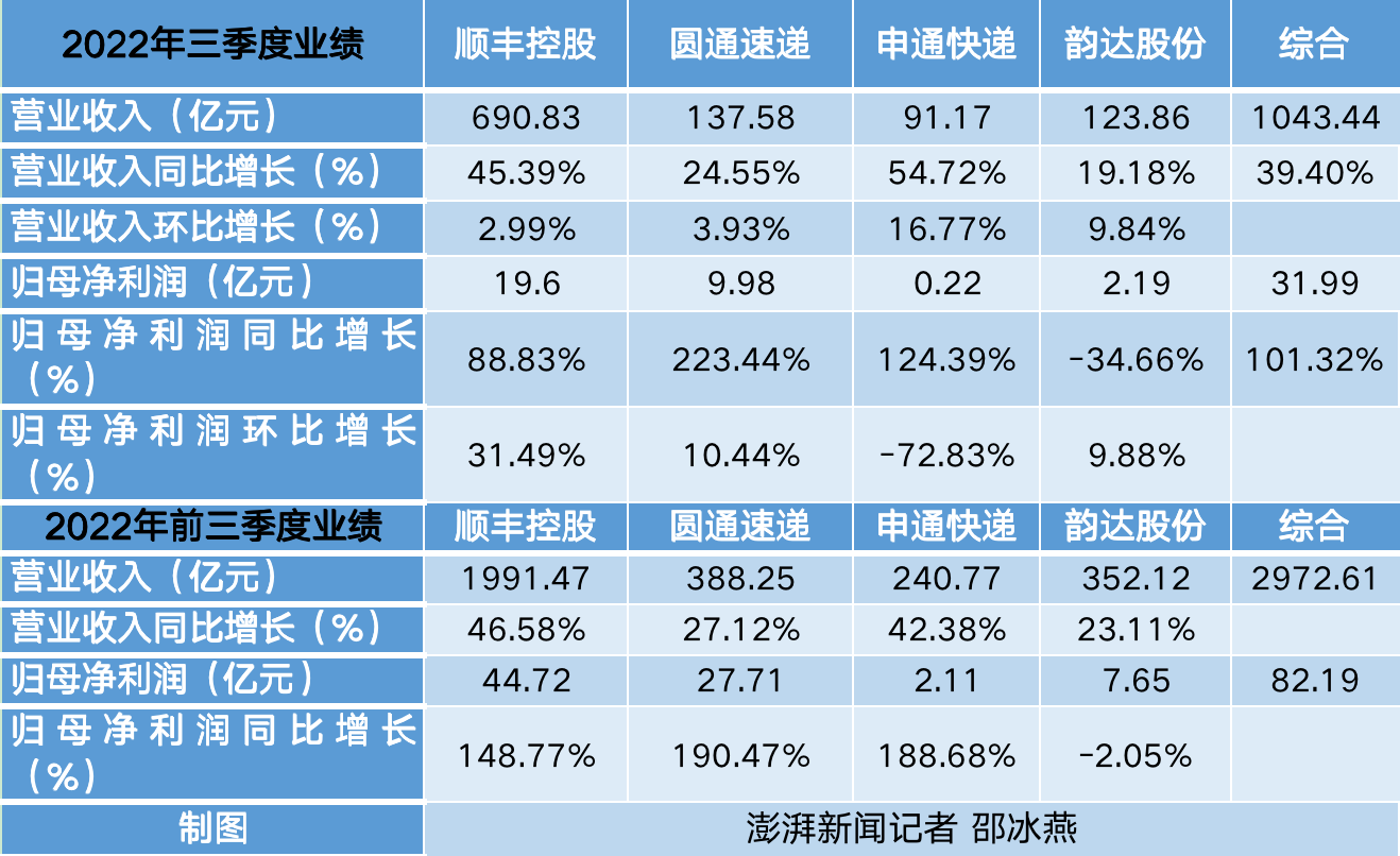 视觉中国 图 本年第三季度四家快递A股公司业绩连续向好,净利总额实现同比翻番。 停止10月30日晚间,顺丰控股(002352.SZ)、圆通速递(600233.SH)、申通快递(002468.SZ)、韵达股份(002120.SZ)四家A股快递公司均连续发布完2022年第三季度陈诉。本年第三季度四家快递公司总营收1043.44亿元,同比增长39.4%,净利润总计31.99亿元,同比增长101.32%。前三季度,四家快递公司总营收2972.61亿元,归母净利润为82.19亿元。 顺丰依然是最赢利的快递公司。其三季度19.6亿元的归母净利润,也占到了四大快递巨头利润总额的六成。 四家快递公司第三季度业绩 汹涌消息记者制图 根据上市公司公告体现,第三快递企业业绩增长告急总结为快递代价及业务量同比增长,产物订价本领提升,并叠加谋划环境改善所致。 此中,顺丰称,业绩实现快速增长,告急由于在收入端增速实现回升,通过不停进步服务质量与差异化产物竞争力,实现康健的产物布局与收入增长。在资源端,精益化资源规划与资源管控的效果稳固,陪同业务量回升,网络规模效益连续改善。别的,前三季度业绩提升还由于自2021年第四序度起,归并嘉里物流联网有限公司的业绩。 停止10月28日收盘,顺丰控股报49.88元,跌1.95%;圆通速递报19.41元,跌4.29%;申通快递报12.44元,跌4.45%;韵达股份报14.64元,跌6.15%。 三季度圆通净利增逾两倍,市场份额超韵达 详细来看,第三季度顺丰营收仍旧遥遥领先。四家快递公司按营收高低排名,分别为顺丰控股、圆通速递、韵达股份和申通快递,营收分别为690.83亿元、137.58亿元、123.86亿元、91.17亿元。 此中申通快递温顺丰控股第三季度营收同比增速靠前,在五成上下。四家公司按营收同比增速高低排名分别为申通快递、顺丰控股、圆通速递和韵达股份,营收同比增速分别为54.72%、45.39%、24.55%、19.18%。而营收环比均有所增长,此中申通快递营收同比增幅最高,达16.77%。 净利润方面,第三季度四家快递公司广泛实现了更强的红利本领。顺丰控股、圆通速递、韵达股份、申通快递归母净利润分别为19.6亿元、9.98亿元、2.19亿元、0.22亿元。 此中,圆通净利润同比增幅最高,超两倍。申通实现同比扭亏为盈,净利润同比增超1倍,顺丰净利润同比增长近九成。而韵达股份净利润则同比下滑,降幅达34.66%。 与第二季度业绩相比,顺丰净利润环比增超三成,圆通、韵达净利润环比增速较为靠近,在一成上下。而申通三季度净利环比降落超七成。 据顺丰控股三季报体现,第三季度完成业务量(不包罗嘉里物流快递件量,也不包罗公司国际货运及署理、供应链的业务量)为28.37亿票,同比增长8.91%。据圆通速递、申通快递和韵达股份7月至9月谋划简报的“完成业务量”数据盘算,第三季度圆通速递完成业务量45.90亿件,同比增长8.51%;申通快递完成业务量36.47亿票,同比增长29.93%;韵达股份完成业务量45.74亿票,同比降落2.8%。 据国家邮政局数据体现,1月至9月天下快递服务企业业务量累计完成800.1亿件,上半年天下快递服务企业业务量累计完成512.2亿件。由此盘算得出,第三季度天下快递服务企业业务量为287.9亿件。以上述数据为根本,盘算出的四家公司市场占据率,分别为圆通15.94%,韵达15.89%,申通12.67%,顺丰9.85%。四家快递公司的业务量总计达156.48亿件,市场份额总计超一半。 随着代价竞争放缓,扩大市场份额成快递业务发展的告急方向。此前,8月中旬申通快递副总裁秦磊继承汹涌消息记者采访时体现,申通快递正在做一些战略开线。“申通也可以做利润,但对公司而言,本年目的更多是进步市场份额。有更多的份额,才气发更多的直发班线。通过镌汰搬运周转来低沉包裹的粉碎率,并进步时效性。” 据汹涌消息记者盘算出的数据体现,本年第三季度圆通速递市场份额凌驾韵达股份,在上述四家公司中排名第一。就在本年上半年及客岁第三季度,韵达股份市场占据率还均高于圆通速递。别的,申通快递市场份额同比提升最多,提升了2.42个百分点。而四家中,仅韵达股份市场份额同比微微下滑,下滑1.3个百分点。 对于来岁快递行业业务量增速的猜测,圆通速递管理层在10月16日的投资者交换中体现,本年以来受多重因素影响,行业团体件量规模增长处于较低水平。随着新兴外交电商平台、直播带货等模式发达发展,网购排泄率进一步进步,电商消耗潜力将连续开释,以及电商平台向下沉市场转移,快递服务企业深入践行“快递进村”工程,服务网络不停向农村消耗市场深度拓展,农村等下沉市场的消耗潜力连续开释,行业增长仍具备较强韧性。 四序度旺季,行业景心胸有望进一步修复和提升 随着快递市场进入四序度传统旺季,市场以为在客岁低根本及前期疫情渐渐消散的配景下,行业景心胸有望进一步修复和提升。而在行业单价毛利提升和规模效应下,头部企业业绩有望率先辈入修复期。 对于快递行业2022年旺季代价环境,圆通速递管理层10月16日在投资者交换时体现,现阶段,快递行业代价处于相对公道水平,头部快递服务企业的红利本领得到较大提升。2022年旺季,快递服务企业将综合季候因素、市场环境、货品布局和重量等对代价举行阶段性的动态调解,但团体将保持相对稳固态势。 据国泰君安10月11日研报,当下羁系层态度清晰,且头部企业四序度红利目的明白,预计2022年旺季代价战略仍将依照行业季候性规律,有望在10至11月渐渐针对“双十一”大促期间举