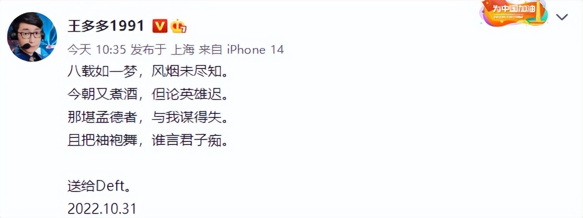 在S12八强开始前,网上乃至为GEN,DK和EDG谁能晋级而争论不休。但现实给了全部人一个大比兜,一场宛若童话故事的史诗出现于观众面前。四号种子,Deft,DRX,这些词语放在一起,没有人会和S12决赛举行关联。正因云云,逆袭的故事才华震撼民气。 带着生活末了一场角逐的觉悟,Deft如同S11的可汗一样平常走到了末了。他在入围赛上击败了RNG,小组赛中斩下了TES,八强对局里让二追三掐灭了卫冕冠军EDG末了的渴望。又在半决赛舞台上对S12夺冠最大的热门GEN重拳出击,让好兄弟Chovy成了永久的CJB。 当抱负照进现实,当八年宿将突破心魔,当Deft人生第一次站在决赛舞台。无论国籍,每一个赛区的观众都为他末了的一舞而感动,亦如当年日本甲子园传奇登顶国内热搜。 电竞书生王多多也因此动容,在微博写下一首诗送给这位万众尊重的宿将。他直抒胸臆,体现出了一名宿将追梦的不易,以及突破众人私见后的畅快淋漓,和对于末了一战的等候,整首诗美满的表达出电子竞技带给作者的风雅感动和向往。 八载如一梦,风烟未尽知。如今又煮酒,但论好汉迟。那堪孟德者,与我谋得失。且把袖袍舞,谁言君子痴。过后,王多多亲身翻译此中真意,再次让观众们感同身受。 八年恍如一梦,另有没见过的风景。如今又开赛了,好汉也迟暮了。那些自以为是曹操的人 就别跟我一顿分析了,打GenG就没人看好我,背面打T1还没人看好我。说得还头头是道。就让我好好享受末了一舞吧。 不知道屏幕前的各位看官可否感受到王多多老师的真情实意,Deft的末了一舞会迎来怎样的了局,就拭目以待吧。 |