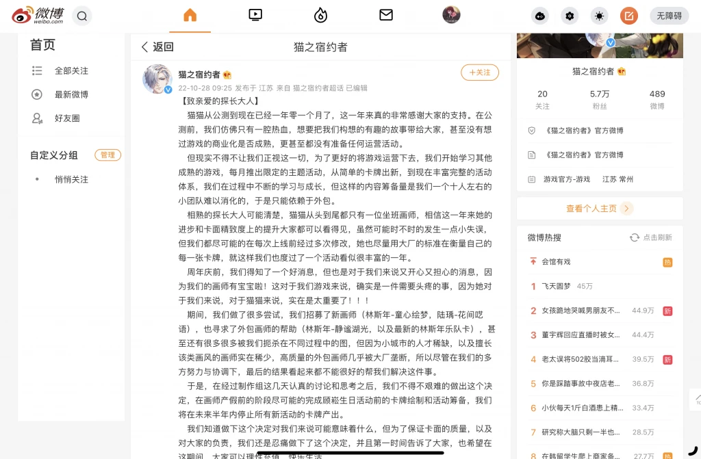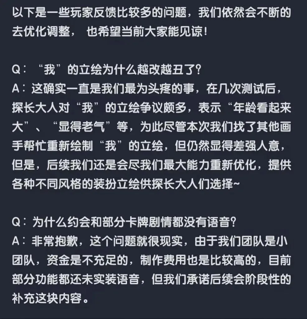 在大量二次元、女性向游戏公布停服,且此中不乏大厂上线还未高出一年的产物的2022年游戏行业竞争的暴虐性可谓被体现得极尽形貌,一款游戏能安全度过第一年就已经相称不易了。 克日,一款名为《猫之宿约者》的宠物题材女性向游戏,在前不久,游戏上线的一周年零一个月之际,却在官方微博等渠道发布长文称,“我们将在未来半年内克制全部新运动的卡牌产出。” 根据TapTap上的信息,《猫之宿约者》由拉风游戏开发,游戏的开发团队早在2018年“一拍即合”,在打磨三年后,于客岁上线了游戏的公测版本。如今整个游戏团队仅有11人,固然该产物可以说是不折不扣的小团队作品 ,但游戏在TapTap上依然得到了8.1分,玩家评价还算不错。 《猫之宿约者》的特殊之处之一就在于它将乙女游戏里完尤物设的男主,与猫咪这一互联网上广受欢迎的物种接洽了起来,再加上部门小团队上比力常见的本心运营,游戏纵然前前后后存在过一些标题,玩家也给予了相称宽容的态度。 就比如在此之前,游戏就由于作为主角的“我”立绘不绝在发生厘革、部门卡牌没有实装语言等标题引发过玩家的不满。对此,开发者的答复也很实诚,大多来由都是没有履历或资金不富足。 在本次的声明中,《猫之宿约者》的开发团队起首坦承地承认了自己在客岁游戏上线之前,以致都没有预备任何运营运动、思考过游戏的商业模式是否成熟。而已往一年里,大量游戏内容的更新和预备,对于11人的团队而言实属不易,因别的包也就成为了包管游戏内容更新的紧张本事。 但作为这类游戏最紧张的美术部门的职员,《猫之宿约者》的团队却不绝只有一名坐班画师,在已往一年里,她负责了游戏内大量运动卡面的绘制,固然从品评区玩家分享的图片来看,在已往的更新中,该游戏并非每次都美满无缺,但可以或许一己之力支持一个商业项目标关键部门,也足以阐明画师的水平。 而在周年庆前夕,该画师也迎来了自己生掷中的紧张时候,有身,固然新生命的诞生总是让人惊喜,但对于云云高度依靠她的团队而言,这也是对后续游戏内容怎样更新提出了困难。开发团队表现,他们也试图通过雇用新人、探求外包等方式弥补空缺,但受限于美术风格以及小都会(据企查查信息,该公司疑似位于常州)人才的限定,终极结果都没有到达团队的尺度。 “期间,我们做了许多实验……但由于小都会的人才稀缺,以及善于该画风的画师着实稀疏,高质量的外包画师险些被大厂把持以是只管在我们的多方积极和调和下,末了的结果看起来都不能很好地帮我们办理这件事。” 作为一款可以或许在当下存活一年有余的小厂女性向游戏,还劳绩了8.1的玩家评分,《猫之宿约者》肯定有其闪光之处,但在团队的最新声明中,无论是被迫放弃出新卡这种维系游戏生存的紧张途径,照旧末了落款的“游戏筹谋兼运营兼客服兼周边打包发货兼用户群陪聊”,实在都不难发现小团队在游戏质量和商业化上的无奈和拉扯。 “我们知道做下这个决定对我们来说大概意味着什么,但为了包管卡面的质量,以及对各人的负责我们照旧忍痛做下了这个决定。” |
