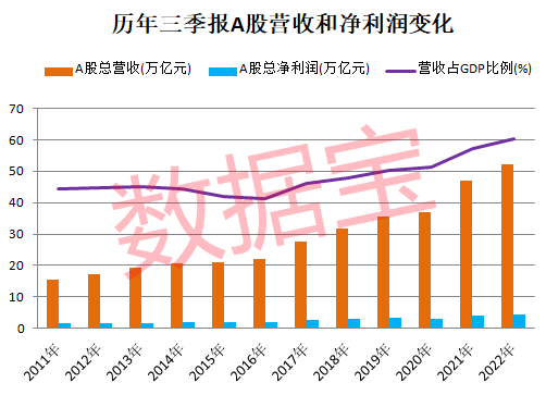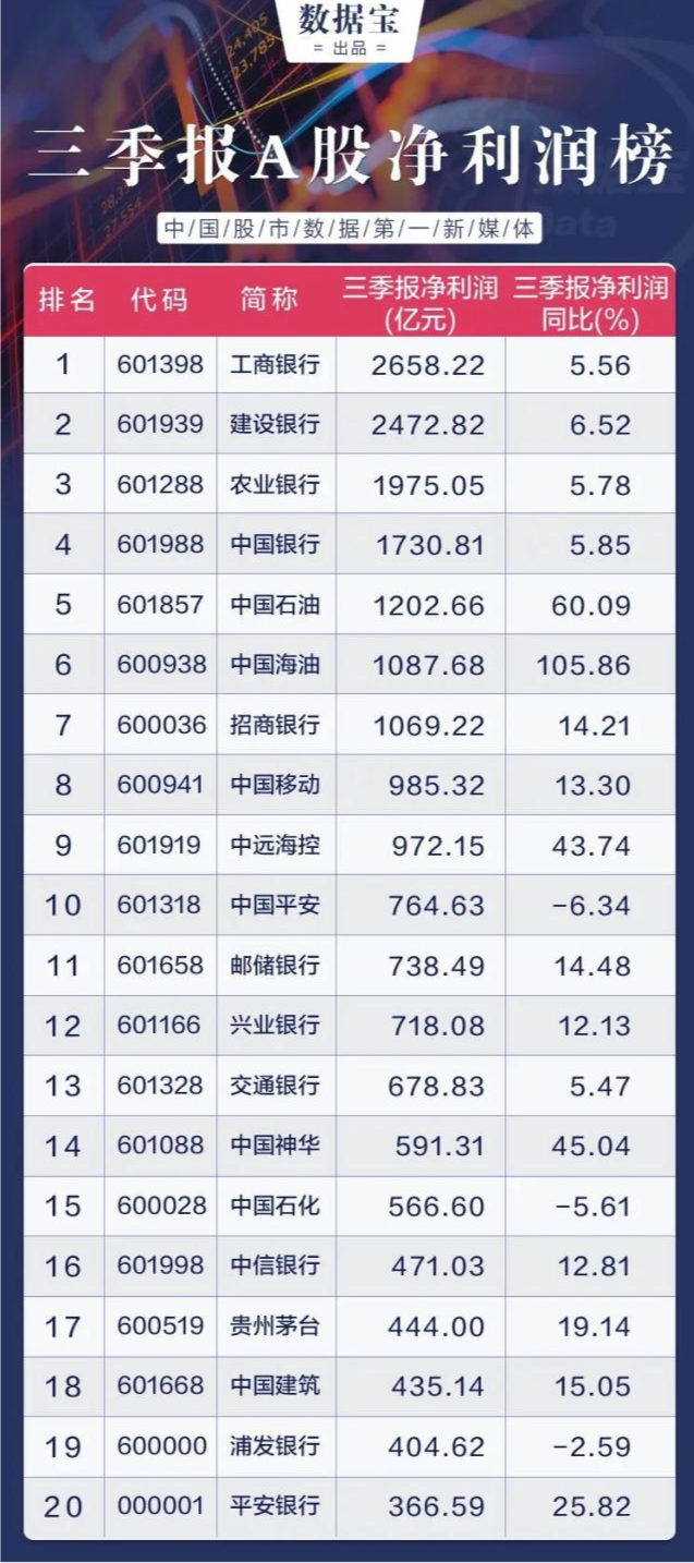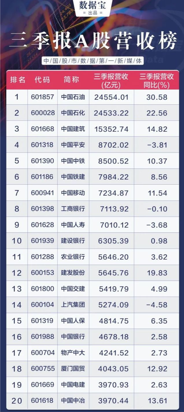 作者:数据宝 梁谦刚 三季报收官,A股上市公司前三季度实现营收和净利双双正增长,显现中流砥柱的韧性。证券时报·数据宝推出《A股冲刺季》系列策划,本篇系首文,发布2022年《三季报A股营收榜》和《三季报A股净利润榜》。 A股三季报营收突破50万亿 占GDP比重首超六成 三季报收官,上市公司策划状态浮出水面。数据宝统计,本年前三季度,A股超4900家上市公司已披露三季报,实现总营收52.34万亿,同比增长8.11%;实现归母净利润4.39万亿,同比增长0.93%。与汗青对比,A股三季报营收和净利润均创汗青新高,此中营收占GDP比例初次突破60%,为汗青最高水平。 分行业来看,18个申万一级行业前三季度营收突破万亿,相比客岁商贸零售行业退出万亿营收之列。石油石化、修建装饰、银行、交通运输、非银金融五大传统行业均贡献了凌驾3万亿的营收。石油石化行业总营收6.26万亿拔得头筹,该行业营收同比增速到达26.65%。美容照顾护士、综合、社会服务三大行业垫底,营收均不敷千亿。 与客岁同期相比,电力装备营收实现大幅提拔,同比增速45.17%排名第一。由于聚集光伏、风电、锂电池、燃料电池、特高压等高景气赛道公司,电力装备行业已往几年来营收连续扩大,本年前三季度营收到达2.19万亿,创汗青新高。石油石化、公用奇迹、底子化工、有色金属、煤炭等与能源相干的行业营收均有10%以上的增速。 单家公司来看,前三季度营收超千亿公司有84家,数目创汗青新高。数据宝发布2022年《三季报A股营收榜》,进入排行榜前50的门槛小幅提拔至1712亿元。修建装饰、银行、交通运输、非银金融四大行业入围公司最多,合计占比凌驾一半。营收排名前7位的公司被“中字头”包揽,中国石油、中国石化及中国修建3家央企营收超万亿元。 银行业对A股净利润贡献超三成 前50强门槛进步 数据宝统计,本年前三季度银行业贡献了A股最多的净利润,行业净利润到达1.59万亿,占A股总净利润比例到达36.3%,是唯逐一个净利润破万亿的行业,同比增长8.02%。除此之外,石油石化、非银金融、煤炭、医药生物、电力装备等行业净利润总额靠前。与客岁相比,钢铁、电子行业退出千亿之列,有色金属、电力装备、公用奇迹行业入围。 社会服务行业是唯逐一个净利润亏损的行业,本年前三季度该行业净利润亏损9.67亿元,创十年来新低。该行业聚集了一大批旅馆、旅游、餐饮、辅导培训等公司。数据宝统计,社会服务行业公司中,七成营收出现下滑,净利润亏损大概同比下滑的也占到七成左右。 数据宝发布2022年《三季报A股净利润榜》,进入排行榜前50的门槛进步至150.85亿,较客岁同期提拔幅度到达27%。金融类企业入围数目最多,此中银行业、非银金融行业各有18家、5家入围。百亿净利润公司有63家,数目创汗青之最。千亿净利润公司数目有7家,除了工建农中国有四大行,另有中国石油、中国海油、招商银行。 三季报业绩创新高股名单 北上资金匿伏超跌龙头 数据宝统计,上市时间在五年以上,且本年三季报营收和净利润均创汗青新高的公司凌驾600家。按照区间成交均价盘算,北上资金10月以来增持超亿元,且最新滚动市盈率低于20倍的公司仅31家。 上述31家公司重要为权巨大盘股,均匀A股市值到达754亿元。二级市场表现来看,本年以来这些公司股价均匀跌幅5.03%,大幅跑赢同期上证指数。中矿资源、陕西煤业、广汇能源、华发股份等4股累计涨幅凌驾50%。博腾股份、正泰电器、兆易创新、凯莱英回撤幅度较深,年内跌幅均凌驾50%。 声明:数据宝全部资讯内容不构成投资发起,股市有风险,投资需审慎。 |