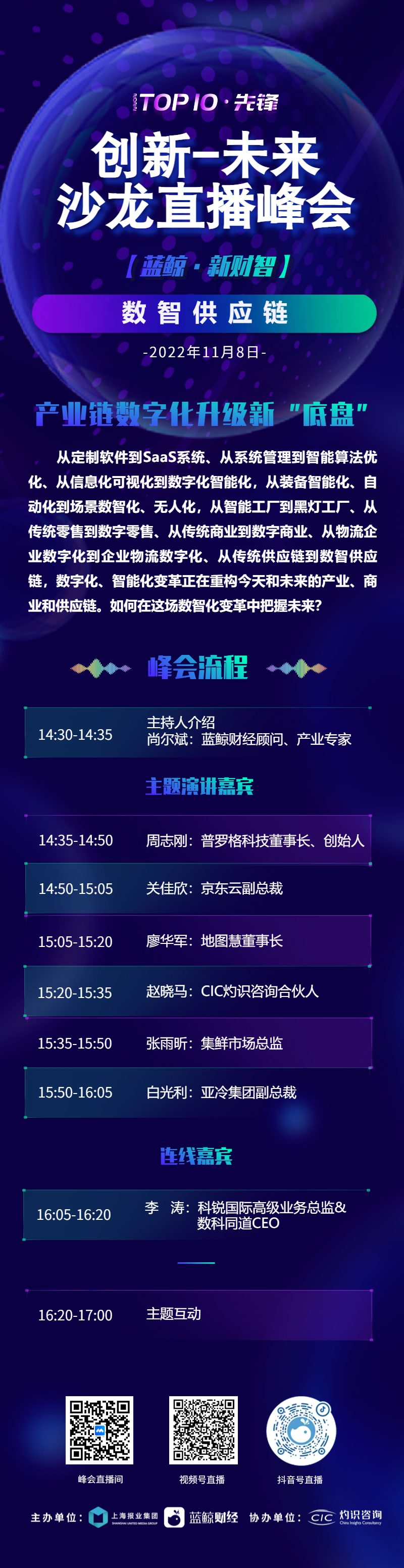 由上海报业团体|蓝鲸财经主理、CIC灼识咨询协办、中国信息协会智慧物流分会为引导单元的【蓝鲸新财智】“创新-将来”之【数智供应链 —— 产业链数字化升级新“底盘”】沙龙直播峰会将于11月8日正式开启! 数字产业与传统产业的界限正在徐徐溶解。 从定制软件到SaaS体系、从体系管理到智能算法优化、从信息化可视化到数字化智能化,从装备智能化、自动化参加景数智化、无人化,从智能工厂到黑灯工厂、从传统零售到数字零售、从传统商业到数字商业、从物流企业数字化到企业物流数字化、从传统供应链到数智供应链,数字化、智能化厘革正在重构本日和将来的产业、商业和供应链。 艾瑞咨询的陈诉表现,预计2022 年国内AI 赋能实体经济的市场规模将到达1573亿。 与此同时,科技部等六部分印发《关于加速场景创新以人工智能高程度应用促进经济高质量发展的引导意见》,提进场景创新是以新技能的创造性应用为导向,以供需联动为路径,实现新技能迭代升级和产业快速增长的过程,推动人工智能场景创新对于促进人工智能更高程度应用。 产业融合已是局势所趋,但也并非易事。艾瑞咨询在2022年中国制造业数字化转型研究陈诉中表现,在繁芜生产参加要素中梳理并明白自身需求难、定位清晰自己的数字化程度难;企业怎样从诸多同质化的供应商中找到恰当的相助对象难。 那么,产业链路上的浩繁玩家怎样才华在这场数智化厘革中把握将来? 我们盼望通过举行系列主题运动,全产业链凝聚资源、多视角洞察产业创新发展之道,发挥财经新媒体平台上风,创建产业精良企业、创新企业、新锐企业互换相助的桥梁。 “跨界+创新”特色,“财经新媒体+主题运动+【Top10先锋】奖+蓝皮书”四位一体,创建财经新媒体与产业深度互动、融合发展新模式,深入发掘、多渠道传播产业发展中模范的气力、创新的气力、开辟将来的气力! |