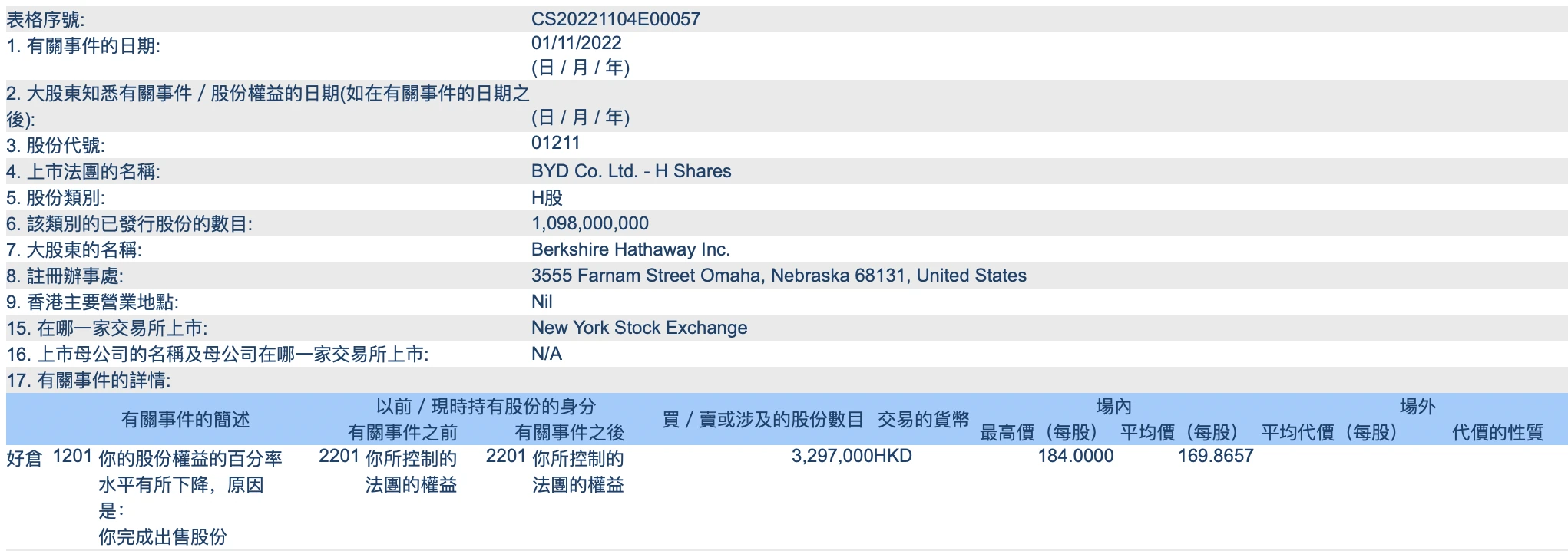 “股神”巴菲特仍在继续减持比亚迪(002594,01211.HK)。 11月4日,港交所网站表现,巴菲特旗下的伯克希尔哈撒韦在11月1日卖出329.7万股比亚迪H股股份,生意业务均价为每股169.8657港元,套现5.6亿港元。伯克希尔哈撒韦仍持有1.96765亿股比亚迪H股股份,持股比例降至17.92%。 自8月以来,伯克希尔哈撒韦已多次减持比亚迪。 初次披露是在8月30日,据港交所网站,伯克希尔哈撒韦公司在8月24日出售了133万股比亚迪H股,均价277.1016港元,套现3.69亿港元,仍持有2.18719亿股,占已发行的有投票权的比例降至19.92%。 9月2日,港交所文件表现,伯克希尔哈撒韦公司9月1日减持171.6万股比亚迪股份H股,均价262.72港元,代价4.5亿港元,剩余持股数2.0714亿股,持股比例从19.02%下调至18.87%。 据证券时报报道,根据港交所披露易规定,大股东增减持股票只有高出某个整数百分比时,才须要作出披露。从持股数量来看,在已披露的信息之外,伯克希尔哈撒韦尚有过多次减持活动。 比亚迪2022年半年报表现,停止本年6月尾,伯克希尔哈撒韦持股数量仍为2.25亿股,以此盘算,伯克希尔哈撒韦近期已抛售比亚迪H股2823.5万股。 在此之前,巴菲特已持有比亚迪超14年,按照170港元的出售均价盘算,出售赢利凌驾20倍。 2008年9月29日,巴菲特旗下伯克希尔哈撒韦斥资18亿港元以每股8港元的代价,在港股认购比亚迪2.25亿股股票。以后,巴菲特不绝重仓着比亚迪,还曾出席过比亚迪的新车发布等运动,为比亚迪站台。因此,伯克希尔哈撒韦的减持也引发过一轮比亚迪的股价大跌。 日前,比亚迪刚刚交出一份非常亮眼的三季报,营收、净利均超预期。财报表现,比亚迪本年第三季度实现营收1170.81亿元,同比增115.59%;净利润57.16亿元,同比增350.26%。 销量快报表现,比亚迪10月共计贩卖新能源乘用车21.75万辆,同比增长171.89%,这也是比亚迪一连第二个月销量突破20万辆。本年1-10月,比亚迪新能源乘用车累计贩卖139.28万辆,同比增长239.05%。 11月4日收盘,港股比亚迪股份(01211.HK)涨5.12%,报197港元/股;A股比亚迪(002594)涨4.56%,报280.2元/股。 |