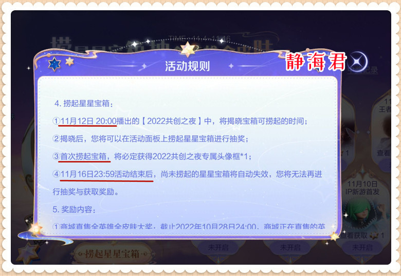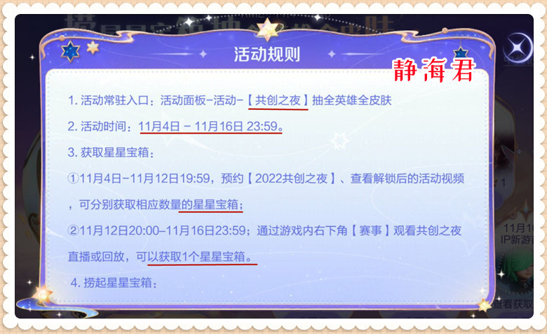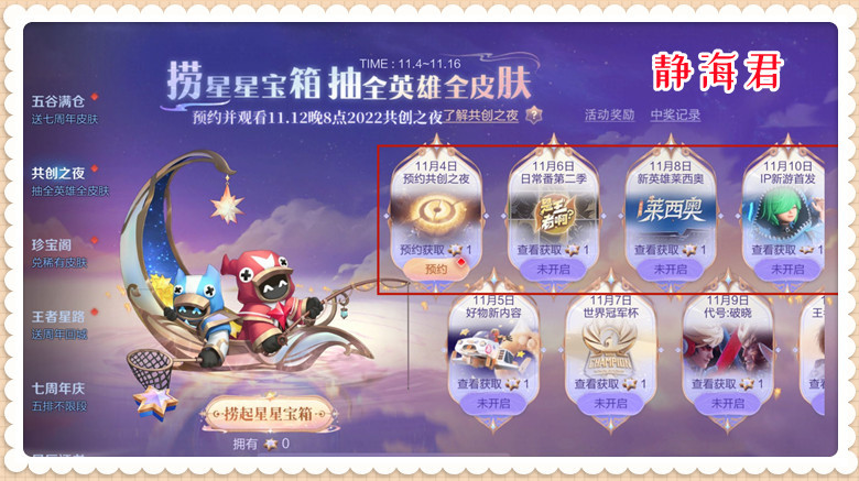文/静海君 随着全豪杰全皮肤大奖的获取方式公开,王者光彩7周年庆的末了一个高潮正式拉开帷幕。本年的共创之夜有什么特殊,全豪杰全皮肤大奖又该怎样获取呢? 共创之夜运动的细节本年的共创之夜的运动有什么细节,又有哪些奖品呢? ⑴夸奖 共创之夜的夸奖一共分为三部门:观看、宝箱抽奖以及弹幕抽奖。 观看夸奖特殊好拿,只要在共创之夜当天点开运动就可以得到非常美丽的灿若星河击败殊效(就冲这个击败殊效我都要去看一下这个共创大会)。 通过宝箱抽奖抽奖,玩家肯定得到2022共创之夜专属头像框,有肯定的概率得到: 特大奖:商城直售全豪杰全皮肤(须要留意的是,这里皮肤特指在2022年10月28日之前上线的直售皮肤,像什么星元皮肤是不算的哦)。 游戏内奖品:蔷薇情人(孙尚香)、优雅情人(嬴政)、史诗风致皮肤。 实物奖品:洗地机、护肤品、洽洽互助瓜子、大米兑换卡。 通过弹幕抽奖,玩家有肯定的概率得到: 蔷薇情人(孙尚香)、优雅情人(嬴政)、特工魅影(百里守约)、热力盘旋(百里玄策)、箭雨风息(伽罗)、隐刃(兰陵王)、万圣前夜(小乔)、特种队伍(李元芳)等。 固然了,假如运气好的话,另有肯定的概率得到王者大礼包,这个礼包里包罗了17个牌子的各种奖品。 奖品许多,福利满满,以是接下来的重点就是——怎样得到得到这些夸奖。 ⑵底子规则 固然共创之夜在12日晚上举行,但这个运动实在从11月4日就已经开始了。观看夸奖直接拿,弹幕抽奖概率较低,真正能确保每个人都有的实在是第二个宝箱抽奖,我们应该怎样确保本身得到宝箱呢? 起首,我们要知道共创之夜这个运动的一连时间是从11月4日开始,到11月16日才竣事的。 其次,我们要知道最多可以得到几个宝箱,以及每个宝箱的详细得到方式。 (好不想和各人分享这些,我觉着知道的人越多,我中奖的概率就越低。) 怎样获取星星宝箱获取星星宝箱的途径有哪些呢? ⑴获取星星宝箱的9个途径 从现在筹谋公布的消息来看,玩家一共有9个途径来得到星星宝箱,分别是: 11月4日的预约运动,在完成预约后,玩家可以得到1个星星宝箱。 11月5日的好物新内容,在完成检察后,玩家可以得到1个星星宝箱。 11月6日的一样平常番第二季,在检察后,玩家可以得到1个星星宝箱。 11月7日的天下冠军杯,在加入后,玩家可以得到1个星星宝箱。 11月8日的新豪杰莱西奥上线体验服,在检察干系信息后,玩家可以得到1个星星宝箱。 11月9日是代号破晓的信息公布,玩家在相识环境后可以得到1个星星宝箱。 11月10日是IP新游的首发运动(看头像是个绿藻头,没看出来是谁),加入后,玩家可得到1个星星宝箱。 11月11日是王者光彩天下的信息公布,玩家在检察后可以得到1个星星宝箱。 11月12日是共创之夜的举行日,玩家加入后可以得到1个星星宝箱。 这么看的话确实有些不恳切,究竟要想增长本身得到大奖的概率,就只能每天上线并关注游戏里的消息了,这对于工作、学业很忙的小同伴来说并不友爱。 ⑵关于星星宝箱开启的规则 在11月12日晚8点共创之夜开始后,天美会正式公布什么时间可以开启星星宝箱。关于宝箱的开启: 第一个宝箱在开启后肯定会得到共创之夜的专属头像框,其他的8个才有机遇去搏大奖。 Ps:假如你运气够好的话,只要共创之夜当天上下线就有大概全皮肤大奖。假如你运气不好的话,我估计90个宝箱都不肯定开得出来。 以上,我是静海君,江湖不大,有缘下次再见。 |