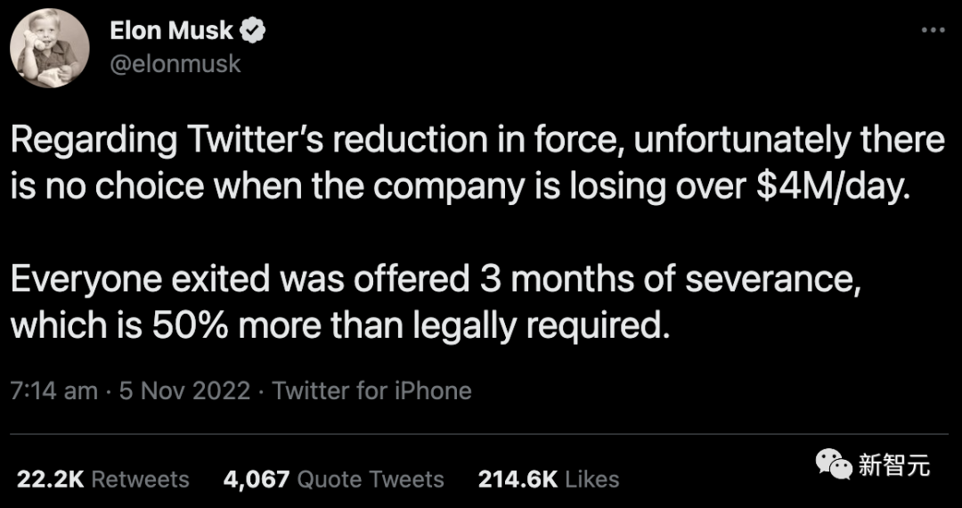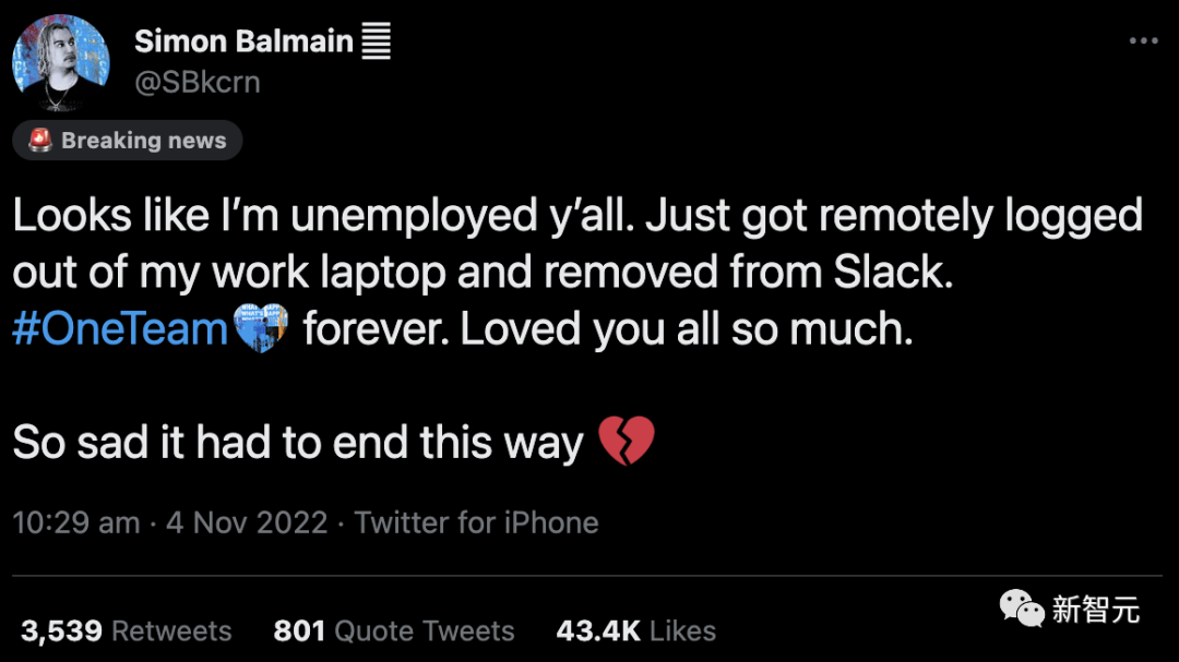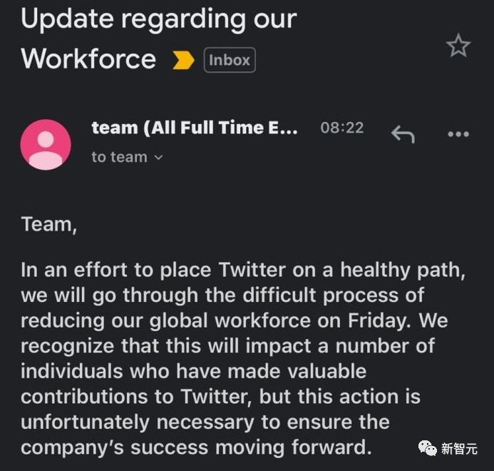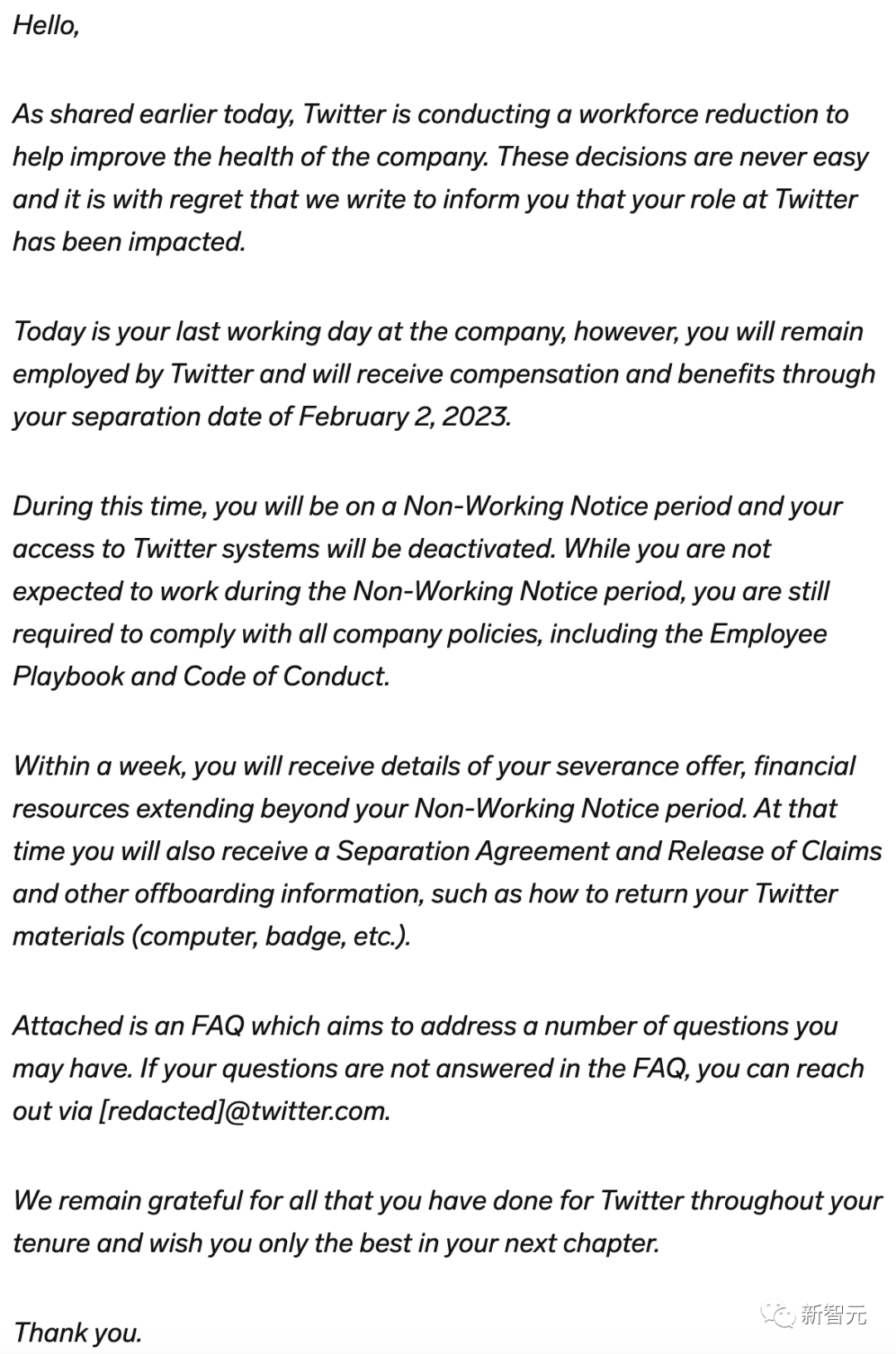 新智元报道 编辑:编辑部 【新智元导读】马氏推特裁人迎来大了局!员工相互告别,「血色星期五」来了。 周五,推特大裁人正式开始! 据称已经有3700多名员工卷铺盖走人了。按照推特7500人左右的员工数量来看,看起来猜50%的人赌对了。 各人,再见了! 马院士:「不盛意思,当公司天天都会丧失高出400万美元时,我别无选择。」 话说,你们说我是暴力裁人,那就暴力吧,而且我又不是不给赔偿。 每人都会得到3个月的驱逐费,这可比法律规定的多了50%呢。 真·灭霸:传呆板学习裁人90%,团队直接遣散 上周,马斯克春风得意地抱着水槽走进推特大楼时,一些推特员工已经敏锐地感觉到自己「危」了。 此前曾有听说称,马斯克将化身灭霸,裁掉75%的员工。固然马斯克在推特总部时似乎对此举行了否认,但该来的照旧来了。 如今,推特的7500名员工已经提前感受到了冷气:他们的邮箱账户在周四晚上被关闭了,这是被裁人的第一个信号。 更折磨的是,马斯克话说得不清不楚,裁人也裁得云里雾里。这7500个人固然被关闭了email,但始终没有收到官方消息,他们的slack账户仍旧有用,这又不禁让人生出一丝念想。 如今,在推特的爱尔兰和英国的办公室里,员工们正在熬夜等待着旧金山总部的关照。 英国的员工被锁定在工作帐户之外,静静等待着开除的消息 有些人比及了:在半夜时分,他们得知自己赋闲了。 据知恋人士透露,推特裁人的方式是云云随意,以至于在一次内部的产物会上,有员工无法加入电话集会会议,由于自己被锁在了公司的体系之外。 推特的员工们正在推特上痛骂自家公司。伦敦的合资人团队成员Chris Younie在半夜时查抄了公司的条记本电脑和电子邮件账户,发现无法访问内部体系,这时他才知道自己被开除了。 「非常感谢,让这事发生在破晓3点,」Younie在推特上讽刺地写道。「火线职员还真是体贴呢。」 员工们怀着忐忑不安、忐忑不安的心情捱到周五,马斯克的裁人筹划徐徐清楚起来:据知恋人士透露,推特约莫一半的员工,即3700个岗位已被裁掉。 很多部门都遭受了「血洗」 ,包罗工程和呆板学习团队、管理内容稽核的信托和安全团队,贩卖和广告部门以及通讯团队。 此中,居家办公的人是重点开刀对象。 好比负责推动算法透明度的团队,就直接「团灭」了。 别的,高管们也没能幸免于难,负责斲丧者产物工程的副总裁Arnaud Weber和监视Twitter与消息出书商相助的高级产物总监Tony Haile,也纷纷遭到开除。 可以说,很少会有科技公司一下子举行云云深度的裁人。 殒命预告邮件 而在这统统开始之前,马院士还非常知心地给全员发了一份「预告」: 在平静洋标定时间11月4日上午9点之前,你将收到一封主题为「Your Role at Twitter」电子邮件,相识自己以后在推特的脚色。 别的,为了防止有人「删库跑路」(确保每个员工以及体系和客户数据的安全),推特暂时关闭了办公室并停息了badge的使用,直到下周一,也就是11月7日。 而假如你不幸被裁,那么你收到的「Your Role at Twitter」长下面这个样子: 正如今天早些时间所分享的,推特正在举行裁人以资助改善公司的康健状态。这些决定从来都不容易,我们很遗憾地写信关照你,你在推特的脚色已继续到影响。 本日是你在公司的末了一个工作日,然而,你将继续受雇于推特,并将在2023年2月2日的去职日期前得到赔偿和福利。 在此期间,你将处于非工作关照(Non-Working Notice)期,你对推特体系的访问将被停用。固然你不须要工作,但你仍旧须要服从全部公司政策,包罗《员工手册》和《举动准则》。 |