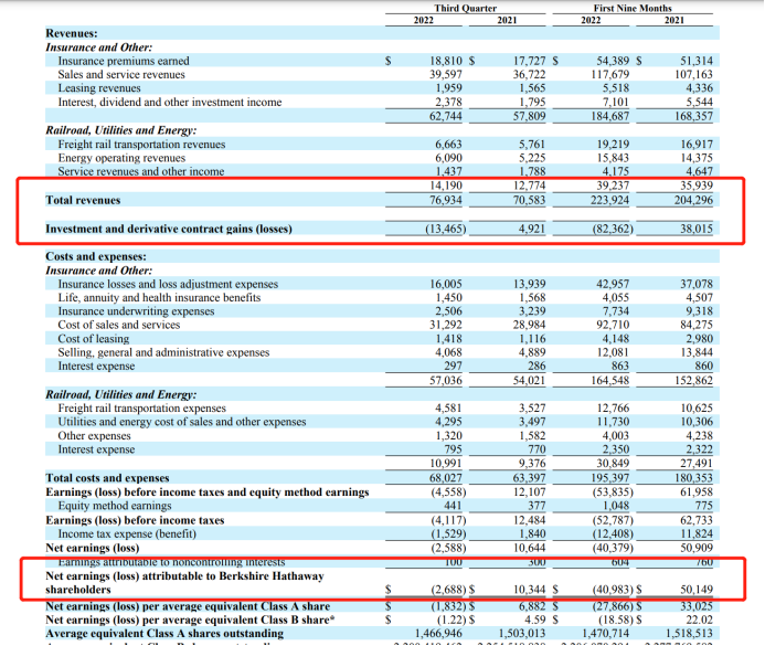 本地时间11月5日,巴菲特旗下伯克希尔·哈撒韦公司公布了三季度(2022.07-2022.09)陈诉。由于重仓持有的股票继承下跌,伯克希尔该季度再次出现了亏损,但相比二季度的亏损金额已大幅收窄。别的,公司三季度继承举行回购,并披露了收购西方石油的最新希望。 营收增长 亏损收窄 陈诉表现,伯克希尔·哈撒韦第三季度营收769.34亿美元,客岁同期705.83亿美元;净亏损26.88亿美元(折合人民币193亿元),客岁同期红利103.44亿美元。相比二季度761.8亿美元的营收,437.55亿美元的亏损,公司本季度体现有所好转。 别的,公司前三季度收入2239.24亿美元,客岁同期收入2042.96亿美元;前三季度亏损409.83亿美元,客岁同期红利501.49亿美元。 详细来看,公司第三季度投资和衍生品净亏损104.49亿美元,客岁同期红利38.78亿美元,本年前三季度亏损650.67亿美元,客岁同期红利299.79亿美元。而巴菲特更看重的运营利润,第三季度为77.61亿美元,客岁同期为64.66亿美元;前三季度运营利润240.84亿美元,客岁同期为201.70亿美元。 从伯克希尔持仓情况看,客岁同期的股票总持仓为3507.19亿美元,一年时间,持仓市值镌汰了500亿美元。制止2022年9月30日,伯克希尔股票持仓里,金融行业的市值为689.65亿美元,消耗行业的持股市值为1577.21亿美元,工商业及其他行业持股市值为794.81亿美元,三者合共持股市值为3061.67亿美元。 持仓前五位的股票依然没有改变,分别为苹果公司(1265亿美元)、美国银行(312亿美元)、雪佛龙(244亿美元)、适口可乐(224亿美元)和美国运通(205亿美元)。别的,伯克希尔还持有卡夫亨氏的代价为109亿美元,西方石油的代价为119亿美元。 伯克希尔·哈撒韦公司五大重仓股市值变革 本年第三季度,公司斥资10.5亿美元回购股票,使本年前9个月的回购总额到达52.5亿美元。别的,制止9月尾,公司账面仍然有近1090亿美元的现金,而6月尾的现金总额为1054亿美元。 对于外界关心的收购西方石油的希望,三季报披露,2022年前六个月,伯克希尔·哈撒韦收购了西方石油公司约17%的流通平凡股,2022年第三季度,又继承收购了额外股份,使得总投票权在2022年8月4日高出20%。伯克希尔对西方石油优先股的投资代价为100亿美元。别的,对西方石油认股权证的投资使公司可以或许以每股59.62美元的利用价购买8386万股西方石油平凡股。优先股以每年8%的利率累积股息,并可选择于2029年开始赎回。 对于将来,伯克希尔公司以为,新冠疫情在差别水平上将继承影响着公司各项经业务务。自2020年以来,政府和企业都接纳了办法,以控制病毒及其变种的流传并减轻其经济影响。但天下各地暂时关闭或限定商业运动也导致了经济恶化。在2021年,环球供应链出现庞大停止,本钱上升,并连续到2022年。而2022年发作的军事辩说导致供应链继承恶化。在美国和其他地方,政府正在实验旨在减缓代价通胀的办法。但如今无法公道估计这些变乱对恒久的经济影响。 又减持比亚迪 克日,港交所文件表现,巴菲特旗下伯克希尔·哈撒韦公司于11月1日以每股169.87港元的代价卖出329.7万股比亚迪H股,持股比例降至17.92%。这已是第三次减持,累计套现14亿港元(约合人民币12.88亿元)。 本年三季度以来,巴菲特一起减持比亚迪。8月份开始,伯克希尔·哈撒韦启动了其对比亚迪的减持,在8月24日出售了133万股比亚迪股份,匀称出售价为每股277.1016港元,套现3.69亿港元。 随后在9月1日,伯克希尔·哈撒韦出售了171.6万股比亚迪股份,匀称减持代价为每股262.7243港元,套现超4.5亿港元。两度减持之后,伯克希尔·哈撒韦公司在比亚迪H股的持股比例从20.49%降至18.87%。 随着11月1日的第三次减持,持股比例降至17.92%,伯克希尔·哈撒韦累计套现金额靠近14亿港元。业内人士以为,当下伯克希尔·哈撒韦的连续减持,是在美联储加息强预期连续扰动、汇率贬值压力的影响下的正常调解。 责编:万健祎 校对:姚远 版权声明 证券时报各平台全部原创内容,未经书面授权,任何单位及个人不得转载。我社生存追究相干举动主体法律责任的权利。 |