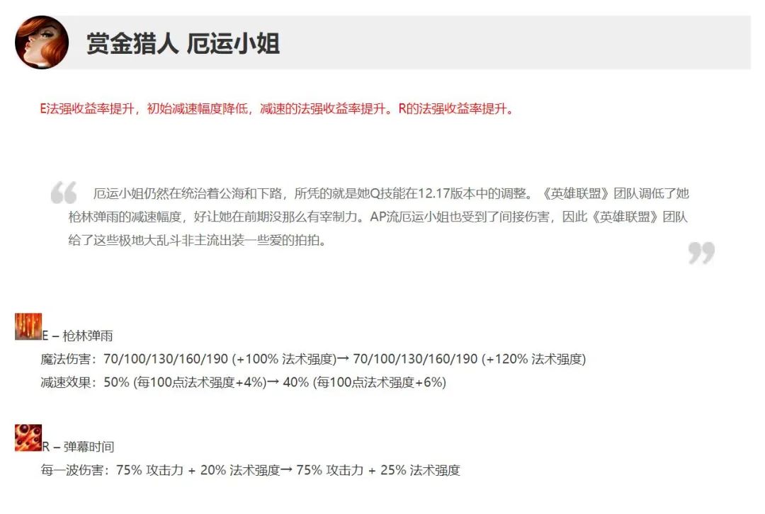 之前AP女枪在大乱斗非常盛行,不外自从12.17版本增强AD女枪,增长女枪满级E技能4秒CD后,国服大乱斗AP女枪越来越少,胜率也不如传统AD女枪大概穿甲女枪。但是!12.21版本筹划师增强了女枪AP玩法,这波增强能不能让女枪重新回归AP出装呢? 【好汉分析】 女枪大乱斗有“输出伤害 -10%、遭受伤害 +15%”的debuff。 女枪由于大招在大乱斗地形的加持下毁灭性太强,导致受到的debuff有点狠,这也不难明白为什么AP女枪不停有人玩了:太脆了还不如出AP折磨对面爽一爽。 我们再来看看12.21版本女枪的改动。 很显着12.21版本改动削弱AD女枪,增强AP女枪,筹划师还特地夸大给大乱斗非主流出装一些爱的拍拍! E技能1.2的AP加成非常恶心。 固然凌驾500法强减速效果才与之前持平,但是ER增强得着实太多了。 请不要忘记,女枪满级E根本CD被削为14秒一次。 出AP伤害高了,不外技能频率还是较低,容易被对头捉住技能真空期。 以是AP女枪玩法更方向功能性,利用E技能的范围减速去恶心对头把他们都打残。 至于斲丧后的收割题目,那都是队友的事,抢人头收割这种爽活,玩大乱斗的人最善于了。 【符文】 AP女枪大乱斗符文分享 主系符文:彗星+法力流系带+超然+风暴聚集 副系符文:恶意诽谤+终极猎人 符文分析:之前说了,AP女枪的任务是压低对头血线,以是点彗星最大化女枪斲丧本领。 法力流系带包管蓝量够用。 超然提供技能急速,放出更多技能。 风暴聚集买一手后期保险,不至于伤害拉跨。 女枪E稳固触发恶意诽谤伤害,一局下来伤害很可观。 终极猎人淘汰大招CD。 【出装和加点】 出装:兰德里的悲凉+恶魔之拥+视界专注+帽子+法穿棒 加点:主E副Q,有大点大。 出装分析:纯AP女枪主取斲丧,以是出双面具能刮就刮,突出一个恶心。 视界专注还能增长ER后的伤害,另有技能急速和肯定血量,恰当女枪。 帽子+法穿棒也是为了进步女枪ER伤害以及E技能减速效果。 AP女枪局一样平常不会拖到六神装,假如对面阵容AP女枪不好打,那怎么办呢?接着往下看! 玩法简介 AP女枪固然简单好上手,但非常吃阵容,尤其是对面的阵容。 对面一旦突脸好汉多,纯AP女枪很难发挥其斲丧作用,AP女枪打脆皮阵容比力爽,以是进游戏后可根据两边阵容改变出装玩法。 比方双修女枪。 双修女枪AP装只出大面具, 剩下都出AD装(魔切+网络者+赛瑞尔达的悔恨等),如许既有斲丧本领,在中期团战QA也有伤害,把折磨对手的本领最大化。 不管是AP女枪还是双修女枪,前中期玩法都差不多,利用W移速加成在最远间隔放E斲丧对头。 除了双修女枪,AP女枪只管不要QA人,伤害太刮痧也太伤害,A人有被人抓时机换血的风险,得不偿失。 由于AP女枪操纵简单,本领上没有过多可以赘述的,只须要留意一点:放大招前肯定要先丢E减速对头,大概跟在队友控制后放大,把大招伤害最大化,裸放大招伤害很低。 总之,斲丧对头压低血线是AP女枪的事故,至于收人头就交给其他人吧! |