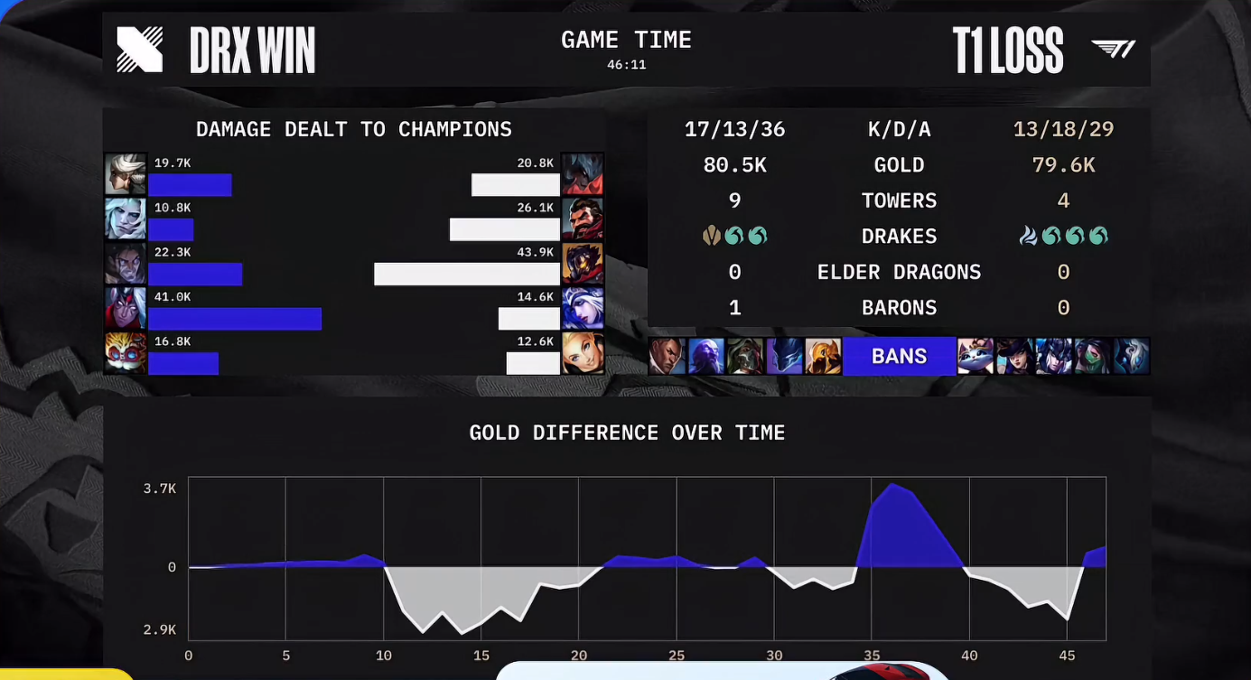 S12天下赛总决赛DRX和T1的角逐,两边大战5局之后,DRX以3-2的战绩击败T1,拿下了本年天下赛的冠军。 第一局T1上单永恩,打野盲僧,中单沙皇,下路韦鲁斯加烈娜塔;DRX上单剑魔,打野佛耶戈,中单塞拉斯,下路希维尔加大头。4分钟pyosik佛耶戈抓中,击杀了Faker沙皇,Zeka塞拉斯拿下了一血。前期T1经济领先1K。中期17分钟T1包团推掉了中路一血塔。18分钟T1拿下了听牌龙,而且打出了一波1换3。20分钟T1击杀DRX野辅两人后,拿下了第一条大龙。27分钟T1拿下第二条大龙。终极31分钟T1在高地击杀DRX四人后,拿下了第一局的胜利。MVP给到了zeus永恩。 第二局DRX上单青钢影,打野佛耶戈,中单塞拉斯,下路韦鲁斯假大头;T1上单剑魔,打野男枪,中单维克托,下路艾希加拉克丝。10分钟DRX野辅抓上,刚好T1野辅也在反蹲,一波3V3后,T1击杀了DRX三人。前期T1经济领先2K。中期16分钟T1推掉了上路一血塔。27分钟DRX拿下听牌龙。后期34分钟两边争取小龙,T1固然拿下了小龙,但是DRX包夹开团团灭T1后,拿下了第一条大龙。但是38分钟,Kingen青钢影失误被秒,随后Pyosik又失误被秒,T1拿下听牌龙。44分钟T1拿下水龙魂,但是之后T1选择打大龙的时间,Faker被秒,DRX击杀T1四人后,乐成追回了一局。 第三局T1上单酒桶,打野男枪,中单沙皇,下路韦鲁斯加扇子妈;DRX上单奥恩,打野佛耶戈,中单塞拉斯,下路滑板鞋加烈娜塔。3分钟pyosik佛耶戈抓下,击杀Gumayusi韦鲁斯,Deft滑板鞋拿下了一血,但是本身也被换掉。10分钟T1推掉了系啊撸一血塔。13分钟两边中路突然大乱斗,DRX打出了一波2换3。前期两边经济持平。中期23分钟Zeka塞拉斯绕后抓死Faker沙皇,随后DRX选择打大龙,结果oner男枪从滑板鞋手中抢下了大龙。30分钟两边争取小龙,DRX抢下小龙后,击杀Oner男枪,随后DRX在野区抓死Faker沙皇后,选择打大龙,结果gumayusi韦鲁斯抢下第二条大龙,T1一波竣事了角逐。 第四局DRX上单剑魔,打野大树,中单沙皇,下路韦鲁斯加烈娜塔;T1上单剑姬,打野猪妹,中单阿卡丽,下路滑板鞋加奶妈。3分钟下路2V2对拼,Deft韦鲁斯被击杀,T1拿下了一血。12分钟两边争取小龙,DRX击杀T1双C后,拿下了小龙。15分钟两边争取峡谷先锋,DRX四打五击杀T1野辅两人,拿下了先锋,同时Deft在下路推掉下路一血塔,前期DRX经济领先4K。中期25分钟DRX光速拿下第一条大龙。终极28分钟,DRX使用大龙buff,推掉T1下路高地后一波竣事了角逐。 第五局T1上单格温,打野佛耶戈,中单维克托,下路韦鲁斯加扇子妈;DRX上单剑魔,打野人马,中单沙皇,下路女警加巴德。3分钟oner佛耶戈抓中,击杀Zeka沙皇,T1拿下了一血。6分钟Kingen剑魔在上路单杀Zeus格温。14分钟T1推掉了下路一血塔。前期两边经济持平。中期20分钟两边中路混战,DRX中路包夹打出完善团战,击杀T1四人后,选择打大龙,结果Gumayusi韦鲁斯赶来抢下了第一条大龙。32分钟,DRX在上路抓死Zeus后,选择打大龙,之后接连击杀T1中辅,DRX拿下了土龙魂,而T1复活后抓死Kingen剑魔,拿下了第二条大龙。40分钟DRX抢下太古龙,DRX团灭T1后,拿下了角逐的胜利。 那么,对于这场角逐,你们有什么想说的吗? |