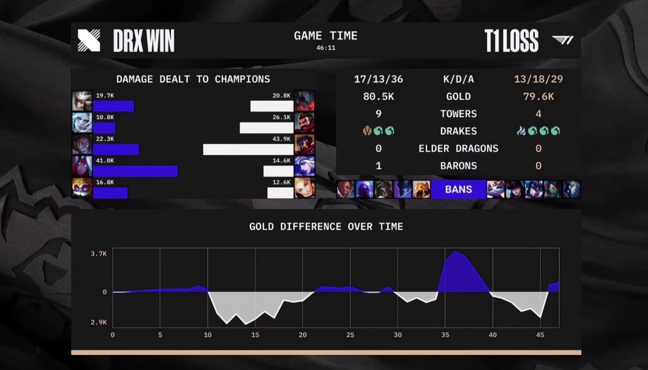 各位LPL的观众和好汉同盟召唤师各人好,这里是天卑鄙戏汇。 S12总决赛第二局角逐上演了翻中翻的出色反转剧情,T1继承选择放大头以拉克丝应对,前期打出很大上风的环境下被DRX连续反击,Faker连死三次节奏崩盘,但Faker将功补过击告竣钢影资助T1重新掌控局面,末了Kingen完成对Faker的复仇。 大龙团战见血封喉,Kingen一波先手共同队友击杀Faker,资助DRX杀死角逐。 拉克丝发力,T1人头领先第二局BP,DRX蓝色方也选择先抢下路韦鲁斯大头,然后以青钢影对线剑魔,T1这边的计谋是第一轮对位选,选出艾希拉克丝应对,二轮各人都选中野,DRX是继承塞拉斯佛耶戈了,T1则是换成了维克托男枪。 胜负关键还是看下路对线,T1这个阵容前期打斗本事比力差,后期手长拉扯本事抢,DRX须要抓前期上风的打斗运营。 开局DRX下路推线,Oner来Gank逼出一个闪现,T1下路压力被缓解,BeryL对线是抓了一波时机打残对面,后选择游走中路共同Zeka打了Faker一套但未能击杀,后Keria也开始游走,双方开始前锋争取。 T1是率先落位开打,DRX试图出场被Faker力场+大招共同队友Poke打残DRX两人。 T1拿下前锋,DRX上路抓时机青钢影先手结果不好,一拥而上Keria支援赶到T1直接反打出0换3,这波关键在于青钢影技能分散给对面的剑魔和男枪,没有会合一人打。 回到对线后,Keria下路一波先手QER打残塔下的Deft,之后越塔闪现Q中两人共同男枪击杀Deft,Faker过来支援被野辅拦截,强行闪现和队友回合,DRX交技能强换Faker,BeryL阵亡,T1总计打出1换2。 大头青钢影发力,DRX扳平比分DRX陷入劣势之后,上路单挑,大头支援,乐成击杀剑魔,大头被换掉,1换1。 随后DRX再次以青钢影先手发力,捉住时机先手Faker击杀,随后上单Zeus也没跑掉被击杀,T1支援无用,这一波DRX战队直接拿下前锋后直接拆中路,BeryL大头先手RE掷中男枪,DRX击杀拿到赏金,后Zeus忽然上头逼出BeryL闪Q闪没砸到,本身阵亡。 简朴说一下局面,DRX中路发育黑白常好的,Faker前期补刀落伍许多,同时Zeus剑魔发育也崩了。21分钟DRX三人困绕下塔,垂纶愿者中计,Faker选择TP守塔被DRX击杀,Faker连续阵亡三次。 运营局面开始,T1开始避战,边线劣势比力大,选择放掉第四条龙,DRX拿到听牌龙,Zeka单带是被T1强行抓死拿了750,但是中路二塔告破。 31分钟中路在中戮营启拉扯团战,双方狂按闪现,终极无人阵亡,DRX掉了秒表和全部闪现。 五龙团战DRX决议是放龙,青钢影绕后打团,T1拿龙后撤青钢影绕后出场,T1阵型被打乱后Guma位置摆脱被击杀,DRX追击团战双方疯狂拉扯,但T1被逐个击破,终极DRX击杀四人,Keria送塔,T1全员阵亡,DRX拆二塔拿大龙。 大龙推进过程中青钢影中路抓时机,Faker以进为退反而一套技能共同队友击告竣钢影,化解了DRX的攻势,并形成反推,逼出了Deft全部的技能,反面的六龙争取中,T1辅助Keria忽然一波神级的先手闪现Q,Q中了野区的佛耶戈,共同队友完成击杀。 DRX选择强行拿水龙魂,但没有惩戒被T1拿到小龙,后续T1击告竣钢影但不能一波。 七龙珠争取拼惩戒,T1拿下龙魂,拉克丝和塞拉斯分别摆脱被击杀,T1选择强打大龙,DRX逆境Kingen强行出场掷中Faker,DRX率先秒杀Faker,佛耶戈抢魂DRX一波团战得胜,后选择以人数上风强行一波,T1防守失败,DRX乐成竣事角逐。 DRX对峙选大头,T1付出代价个人以为这一局角逐可以说是本届S赛最出色的对局之一,T1率先打出了很大的人头上风,然后DRX是通过连续的打击打了返来而且掌控局面,本以为DRX要竣事角逐的环境下,Kingen出现失误被T1反击,T1拿下水龙魂又掌控了局面。 本以为T1要赢的环境下,一波强行打大龙是被DRX一波闭幕,角逐戛然而止。 个人以为这一局角逐DRX对峙选择大头,算是证明确本身,T1选择用拉克丝打大头,本局拉克丝的表现也非常出色,但两个辅助都有发挥的环境下,还是DRX更胜一筹,下一局角逐T1大概要思量好怎么应对大头这个点了。 角逐内容方面,本局角逐的迁移转变点有许多,前期拉克丝的支援资助T1创建上风,然后青钢影的先手资助DRX完成局面逆转,后青钢影阵亡被T1反击,末了又是青钢影找时机击杀Faker竣事角逐,这局角逐当之无愧的主角就是青钢影,成也Kingen,败也Kingen。 |
