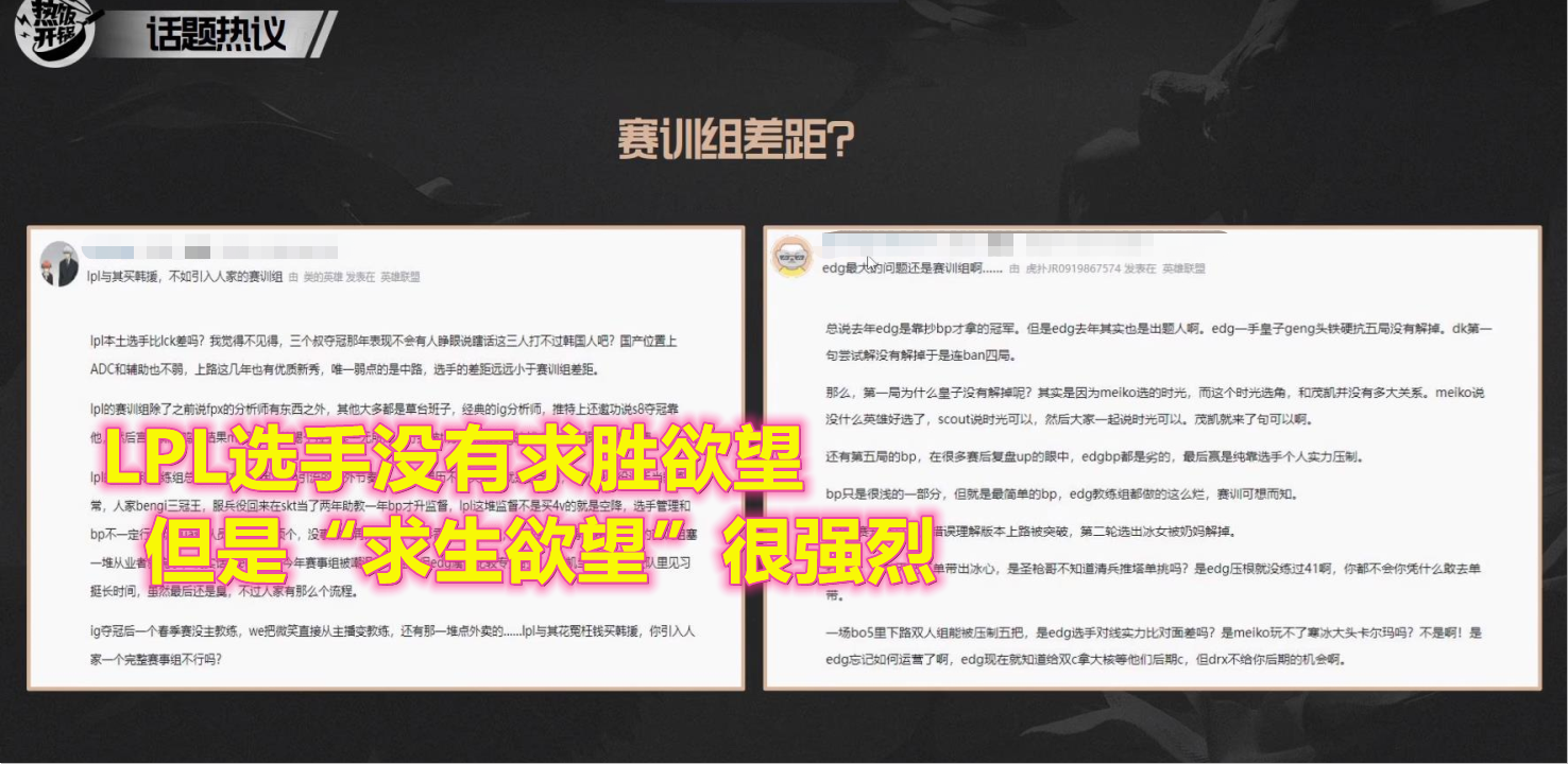 本年环球总决赛上面的各支队伍,在团体的发挥上面,让很多网友都感觉到不尽人意,在面对到我们的老对手LCK赛区的时间,险些被打的没有什么还手之力。这种局面,不是各人想要看到的事变。但怎样我们的战术储备,比起LCK的少了太多太多,这一次的败北,信任也会给到LPL锻练组一个警觉。 LPL队伍风气出现大标题?娃娃和米勒刀刀见血;各人都怕背锅! 近期,LPL两位着名的教学,也开始接着本次天下赛的败北,开始讨论起了缘故起因,究竟当我们失败之后,一昧的诅咒是没故意义的,必要找到我们跟其他赛区的不敷,这里娃娃和米勒,就根据如许的一个话题,在直播当中聊起来了。在这个话题当中,给出了四个选项,分别是;赛训团队差距显着,不注意人才梯队建立、选手明星化以及没有富足的求买卖志。 这四个根本上是本次环球总决赛上面,网友讨论最多的几个点了,娃娃跟米勒两个人开始借此话题,跟各人探究了起来。起首娃娃在这里提到了一点,那就是“选手明星化”,并不是一个所谓的坏事。很多体育界的人,就像C罗、梅西等等,他们都是明星呀,影响到他们了吗? 很显然,这是不建立的。米勒指出;但就是怕一些选手在成名之后,就开始膨胀了,他并不以树立榜样,以夺取冠军为自己的目的,而是肆意的享受这些流量。如许一来,自然就会败坏整个风气,这个擦?鲱关键的。而前面提到的“赛训差距”,这个并不是米勒以及娃娃可以或许品评的事变。 游戏环境太差,没有新星选手出现?LPL必要沉淀! 由于他们表现,自己没有LPL锻练组大概是LCK锻练组那么具有话语权,这些东西只有锻练组能分析白,假如说他们自己承认没有别人打得好的话,那么才是真正的赛训组差距。而第二条,也就是不注意人才梯队和建立,这一点米勒和娃娃就有点打马虎眼了,明里暗里就是再说,国服的环境并不是特殊的好,让一些有天赋的选手去打电一?着实也是没原理的事变。 最紧张的缘故起因,米勒以为是如今LPL的选手,都没有了所谓的“斗志”,他们没有求胜欲望,只有“求胜欲望”,各人似乎都不想要背锅,以是在选角以及打法上面,都过于守旧了。固然说米勒这么说,但仍旧有很多网友以为,在BP上面随处被压抑,纵然想要去打,也没有办法打出上风啊。 总的来看,这四个标题多多少少都占据了,只有在来岁举行改动,才可以走的更远,但米勒和娃娃说道,近几年时间内里,LPL已经没有出现过那种“超等新星”了,就是出道就夺冠的那种选手,除了阿水之外,LPL就再也没有本事做到这一点,看来LPL大概仍旧必要沉淀一下,才可以做得更好呀! |