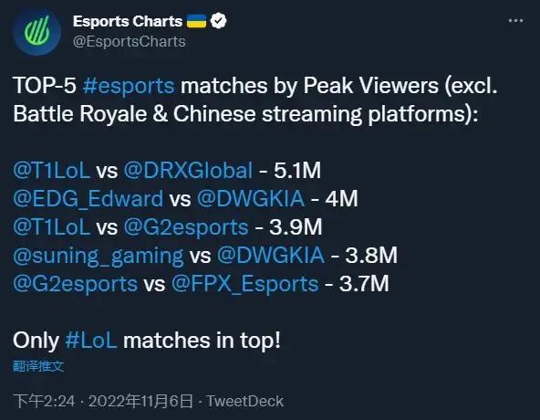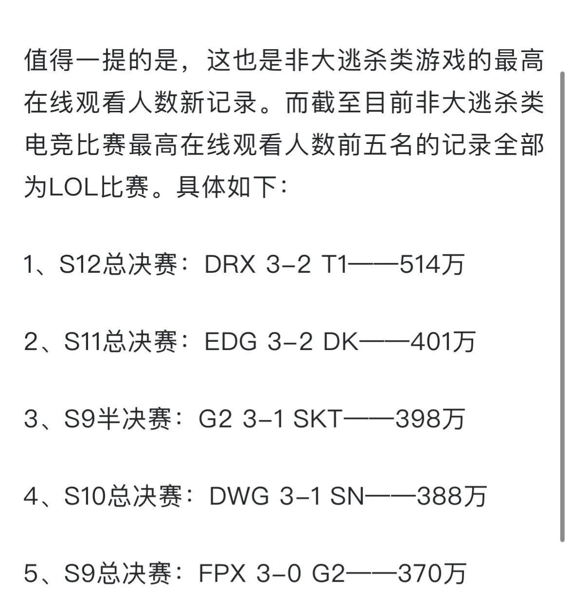 媒介:S12赛季的比赛已经全部竣事了,信托绝大多数的玩家都关注了这一次的天下赛。Drx战队在终极的决赛中以3比2乐成击败了T1战队,拿到了本次天下赛的冠军。如许的结果让许多的粉丝都非常的不测,尤其是drx战队的韧性,在多次的对抗中,他们都陷入劣势,但是他们却可以大概依附自己的操纵将局面扳返来,尤其是在末了一局的对抗中,连续被抢了那么多次龙,仍旧可以大概稳住心态,确实是让我没想到的。这场比赛竣事之后,一张观赛数据图也是火了起来,峰值数据到达了510w,成为了积年天下赛以来观赛数值最高的比赛。 S12决赛峰值数据图火了信托绝大多数的玩家对于本次的天下赛决赛还是比力关注的,T1战队作为lck赛区的老牌强队,他们拿到过三次天下总决赛的冠军,时隔五年又重新回到了决赛的舞台,faker好坏常渴望拿到自己的四个冠军奖杯的,而且在赛前,绝大多数的玩家也都以为T1战队是有本领去拿到这个荣誉的。毕竟他们本年的状态非常的稳固,春季赛的时间就已经得到了lck赛区的冠军,相比之下,drx战队的夏日赛结果非常的拉胯,如果不是依附着春季赛积分的话,他们以致连天下赛的名额都拿不到。 正如上面所说,DRX战队本年确实是一匹黑马,夏日赛的排名非常的靠后,依附着春季赛的积分,拿到了冒泡赛的名额,而且击败了多支战队,得到了lck赛区的四号种子。从入围赛开始,他们的状态就让许多的粉丝非常的受惊,一起得胜,终极来到了决赛的舞台。尤其是击败了gen战队之后,全部的玩家开始对这支战队有了差异的见解,以致以为可以大概和T1战队有一战之力。终极的结果也是让粉丝们感到不测,3比2,Deft拿到了自己的第一个天下赛冠军。 比赛竣事之后,国外的媒体也是第一时间统计,除了观赛数据,结果发现,这场比赛乐成革新了这么多年以来天下赛的峰值。不包罗lpl赛区的数据,整个的观赛人数已经到达了514万,这个数据已经革新了S11天下赛的人数了,而且远远凌驾了第二的数值。现在的排名是如许的,1、S12总决赛:DRX 3-2 T1——514万。2、S11总决赛:EDG 3-2 DK——401万。3、S9半决赛:G2 3-1 SKT——398万。4、S10总决赛:DWG 3-1 SN——388万。5、S9总决赛:FPX 3-0 G2——370万。 根本上每一年的观赛峰值都会有所上涨,但是幅度不是特别大,会在十万左右,而这一次的决赛人数直接暴涨了113万,这也充实表明确本年天下赛的热度,而且T1战队和drx战队的这场BO 5对决打得确实非常精彩,以致有一点凌驾和edg战队的让二追三了。不得不认可,drx战队的韧性真的太强了,感觉他们不陷入劣势,就不会打比赛,只要被对方克制,就可以大概找出机遇反开一波竣事。 再见以为虽说许多的玩家都在讨论好汉同盟的热度降落,但是从这一次的天下赛观赛数据来看,着实好汉同盟每一年的观赛人数还是非常多的,而且这还不包罗在lpl赛区看比赛的玩家,如果参加进去的话,我感觉千万大概挡不住。只能说本年drx战队的发挥更为精彩吧,上路的宙斯在末了两局比赛中打得确实太差了。 各位观众老爷们怎么看这个变乱呢? |