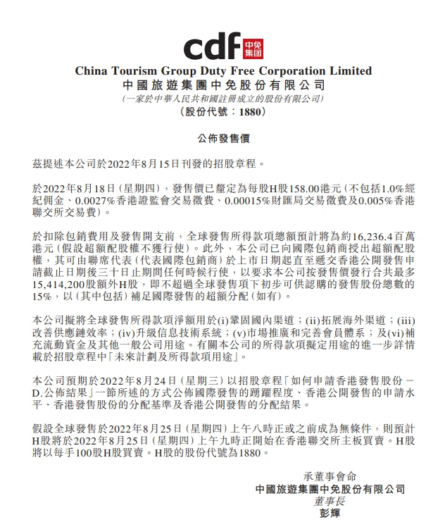 每经编辑:杜宇 中国中免(HK1880)8月19日在港交所发布公告,香港IPO发行价已定为每H股158.00港元。举世发售所得款子总额预计将为约162.36亿港元(假设超额配股权不获利用)。预计将于8月25日(星期四)上午九时开始在香港联交所主板交易。 公告体现,中国中免已向国际包销商授出超额配股权,其可由联席代表(代表国际包销商)于上市日期起直至递交香港公开发售申请停止日期后三十日止期间任何时间利用,以要求本公司按发售价发行合共最多15,414,200股额外H股,即不凌驾举世发售项下开端可供认购的发售股份总数的15%,以补足国际发售的超额分配。 公告称,中国中免拟将举世发售所得款子净额用于巩固国内渠道、拓展外洋渠道、改善供应链服从、升级信息技能体系、市场推广和完满会员体系。及增补活动资金及其他一样平常公司用途。 “赞”深读 100 好文,下载逐日经济消息 APP 瓜分 10000 元现金 逐日经济消息 |