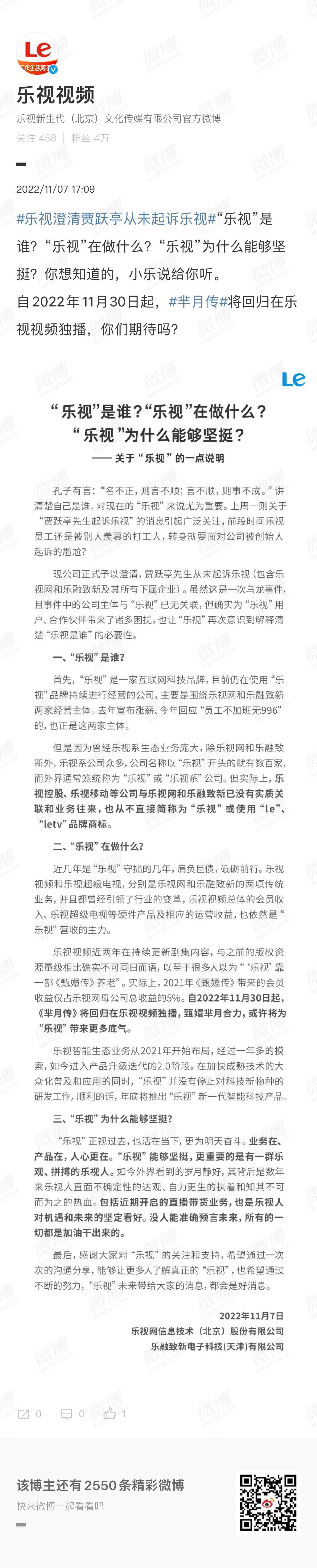 鞭牛士 11月7日消息,克日,贾跃亭因乞贷纠纷告状乐视登上热搜引发网友热议。本日,乐视网信息技能(北京)股份有限公司与乐融致新电子科技(天津)有限公司发布声明。 声明称:现公司正式予以澄清,贾跃亭老师从未告状乐视(包罗乐视网和乐融致新及其全部下属企业)。这是一次乌龙变乱,且变乱中的公司主体与“乐视”已无关联。 |