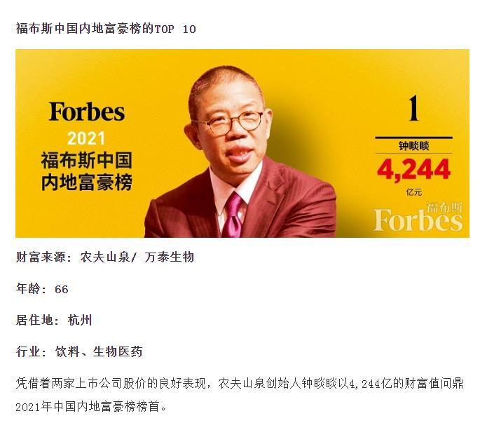 每经编辑:黄胜 11月8日,2022胡润百富榜发布。 农夫山泉68岁的浙商钟睒睒产业比客岁增长650亿元,即17%,以4,550亿元第二次成为中国首富。钟睒睒创造了二十多年来中国首富产业的最高记载。 图片泉源:胡润百富公众号 字节跳动39岁的张一鸣产业比客岁降落950亿元,即28%,以2,450亿元位列第二,排名稳固。宁德期间54岁的曾毓群产业比客岁降落900亿元,即28%,以2,300亿元位列第三,排名稳固。 网易51岁的丁磊产业比客岁增长14%至1,950亿元,排名上升8位至第六,重返前十;牧原的秦英林、钱瑛夫妇产业比客岁增长9%至1,850亿元,排名上升7位至第八。 总体上,1,305位个人产业50亿元人民币以上的企业家登上本年胡润百富榜,比客岁镌汰11%(160人)。上榜企业家总产业比客岁降落18%,至24.5万亿元。千亿级企业家比客岁镌汰11人,至34人。十亿美金级企业家比客岁镌汰239人,至946人。 值得留意的是,17位“90后”上榜,比客岁多3位。此中3位是白手发迹的:喜茶31岁的聂云宸产业85亿元蝉联90后白手发迹首富;Manner咖啡29岁的陆剑霞,韩玉龙、陆剑霞夫妇产业比客岁增长一倍至70亿元;出生北京,在美国建立了人力资源服务公司Deel的32岁王硕以50亿元产业初次上榜。 图片泉源:胡润百富公众号 2021年11月4日,福布斯发布年度中国本地富豪榜。农夫山泉首创人钟睒睒以4,244亿的产业值首度登顶2021年中国本地富豪榜榜首。 图片泉源:福布斯网站截图 据农夫山泉官网先容,钟睒睒老师出生于1954年。于1996年9月建立农夫山泉,农夫山泉现任董事长、实验董事及总司理,紧张负责公司团体发展战略,业务操持、巨大谋划决定并直担当理品牌、贩卖和人力资源工作。在农夫山泉创建前,钟睒睒老师于1993年3月创办养生堂。钟老师于食品及软饮料行业拥有近30年的丰富履历。 图片泉源:农夫山泉网站截图 福布斯网站2020年12月31日发文《逾越马云 农夫山泉钟睒睒成为亚洲首富》。文中称,12月31日,据福布斯实时亿万富豪榜表现,钟睒睒身家780亿美元,成为中国第一,环球第八的富豪。 图片泉源:福布斯中国网站截图 逐日经济消息综合自胡润百富公众号、福布斯中国网站、农夫山泉官网 逐日经济消息 |