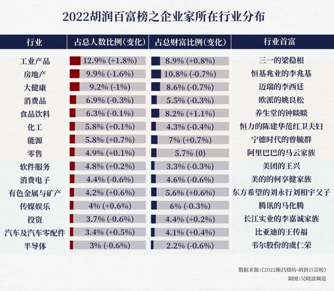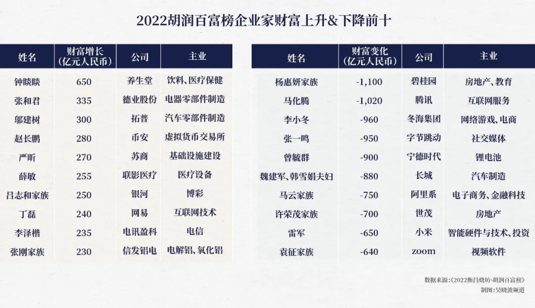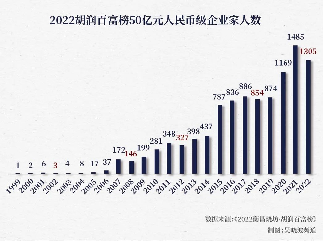 一年一度,对产业野心的记载。 文 / 巴九灵(微信公众号:吴晓波频道) 2005年,《中国企业家》发布创刊20周年特刊,记载了20个他们以为足以“改变中国商业史”的关键时候。 内里都是些耳熟能详的经典故事——“张瑞敏砸冰箱”“国美连锁出世”“遐想交交班”等等。 在一众中国人的商海沉浮里,一个顶着中文名字的外国人混入此中,成了另类的存在: 胡润首创富豪榜。 不知不觉中,从1999年第一次帮中国富人数钱(吴老师语)开始,胡润已经数到了第24年。 本日(11月8日),吴晓波频道与胡润研究院同步首发《2022衡昌烧坊·胡润百富榜》。 说是百富榜,实在发展到现在,上榜人数早已上千。好比本年就有1305位企业家登上榜单。 不外为了呼应“百”这个数字,小巴先揭秘本年的前100名企业家供各人先睹为快。 接下来,小巴重点提炼下本次榜单中的三个关键词: 从白手发迹到“继续” 1999年,当胡润向中国扔出第一张富豪榜单时,掀起的波涛是巨大的。 在一个对产业认知还严厉不敷、以致将产业视作原罪的年代,这份榜单一开始没能通报多少正能量。 体感到身边的人先富起来是一回事,被直接赤裸裸地同产业金字塔塔尖的人比,则是别的一回事。 于是,猛烈地发问直指上榜企业家:“他们的钱到底是从那里来的?”“有钱人都是靠关系致富的吧!” 就连企业家本人都不乐意被胡润记载在册。 丁磊就曾直言说不喜好被冠名“首富”,他是在2003年被胡润放到了“榜一大哥”的位置。 (只管云云,现在已经51岁的丁磊依然是百富榜的常客,本年排名提拔8位重回前十) 但很快,胡润就迎来了观念的迁移变化点——富豪榜上这批民营企业家白手发迹拼搏创富的故事,改变了很多中国人对富人的见解。 1990年,胡润和中国同砚们开顽笑说“你们以后都操持开疾驰吧”,同砚们纷纷体现惊奇,以致以为这是一件“侮辱性极强”的打趣,这令胡润大感不测。 而到了他称为“关键时候”的2005年,校园里已经到处可见“对产业的野心”——“我们就想开疾驰”。能进入胡润的榜单,也成了很多年轻人的将来空想。 更况且,数据不停以来也都是励志的。 2016年的榜单里,68位80后企业家上榜,21位白手发迹(其时还没有90后上榜),占比30%; 2019年胡润举世富豪榜里体现,中国白手发迹的富豪占比达65%,无父母任何经济支持的创富人数更是高达74%。 在2022年的榜单中,40岁以下(包罗40岁)企业家有94位,仍有36位是白手发迹的,以张一鸣为首。 但形势也在寂静发生厘革。 17位90后出现在2022年的榜单中,但白手发迹的就只剩下3位,占比仅为17%。他们分别是31岁的聂云宸(喜茶)、29岁的陆剑霞(Manner咖啡)以及32岁出生北京、在美国建立了人力资源服务公司Deel的王硕。 靠继续产业上榜的比例也有所增长,本年上榜者中7%是继续产业的,客岁为6%。 据胡润推算,中国将来20年将有51万亿产业传给下一代,相当于本年110个钟睒睒的产业。 与之相对应的是,人们对榜单也变自得兴阑珊。 每年解读榜单,常常会在品评区看到如许的小幽默:看完了,我的位置没啥厘革,谢谢小巴。 单说这十年,首富从宗庆后换成王健林,从王健林到马云,从马云到许家印,从许家印又到马云,随后直到2021年钟睒睒成为新首富冲破循环,又到本年连任中国首富。 人们见证着产业的变迁,也见证着本身的不怎么变。 冷气入侵胡润榜 冷气确实也入侵了榜单,造富本领的减弱在2022年尤为显着。 2022年的榜单里,共有1305位个人产业50亿元人民币以上的企业家上榜,比客岁淘汰11%(共计160人);上榜企业家总产业比客岁降落18%。 此中,只有411位企业家产业比客岁增长,1187位企业家产业比客岁缩水或保持稳定,293位本年落榜。 本年产业数额增长最多的前十名企业家一共增长了3000多亿,仅为客岁的26%。 企业家们的产业厘革与股市的升沉高度干系。 首富钟睒睒产业比客岁增长了17%,对应的是农夫山泉股价较客岁同期增长20%。 第三富的曾毓群产业比客岁降落28%,对应的是宁德期间已往一年股价下跌高出20%。 马化腾产业比客岁降落32%,被李嘉诚高出位列第五,得到十年来最差排名,这一年腾讯的股价较客岁同期跌幅高出30%。 值得一提的是,胡润本次的股价盘算停止时间为2022年9月15日,小巴算了下9月15日到现在的腾讯股价,又跌了18%。 80岁的何享健及其眷属产业降落11%位列第七,美的市值较客岁同期下跌15%。 马云产业降落29%位列第九,比客岁降落4位,阿里巴巴股价较客岁同期跌幅靠近50%。 不外胡润也不渴望各人越看越emo,他特意提示各人,眼光要放远一些: 本年上榜的企业家中,有70%是十年前没上榜的,只有30%是十年前上榜的;二十年前的前十名本年一个都没在前十,十年前的前十名只有马化腾一人本年还在前十,五年前的前十名有马化腾、马云、何享健和丁磊4人本年还在前十。 这意味着,产业布局并未固化,动荡也就意味着时机仍旧存在。 总量上看,只管本年50亿元人民币级企业家人数固然淘汰了很多,但照旧比五年前增长了近50%,是十年前的4倍,二十年前的400多倍。 守旧的趋势 从一开始,胡润的操持实在不是数钱。他想研究一些乐成的中国人,50个或100个,产业不外是权衡商业效果的便利指标。 正如他曾对《中国企业家》说的那样: 各人关注的重点并不但仅在数据。我感觉更告急的是趋势,不偕行业得到产业的大概,一个人相对与其他人的差异。假如单谈数字大概关注的人群