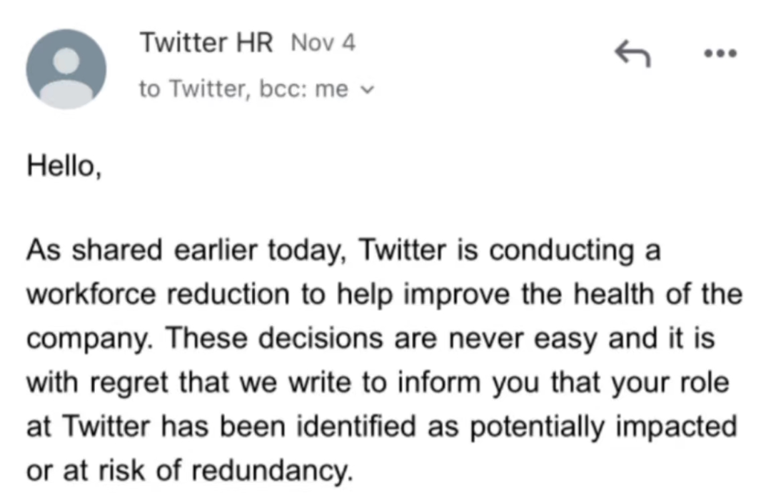 “疯狂”的马斯克,“善变”的马斯克,发动了一场剧烈而随机的大裁人,让推特员工履历了一个“玄色星期四”,而这只是“改造”的开始,他还要“开释”美国前总统特朗普,在硅谷卷起996风潮,乃至把推特打造成微信一样的超等全能APP,将他的理念转到达全天下。 文 |薛永玮 编辑 |赵磊 运营 |栗子 呆板人式的淡漠裁人 裁人的阴影困绕着旧金山,但推特员工艾米怎么也没想到,裁人到来的方式云云暴虐。平静洋时间11月3日,周四晚10:59,在有31位同事的部门外部大群里,第一位登不上去Slack(推特内部办公软件)的同事发出了疑问:“岂非这是被裁了?” 正躺在床上看小说的艾米收到这条消息,心田一颤。 她放动手中的Kindle,立刻打开Slack。还好,能登上去。小说讲的是一个女人死去活来的故事,艾米看上两行字,就划两动手机,有点看不下去。0:09,艾米睡前末了一次点开自己的Slack,页面还是正常谈天页面,好像可以安心去睡了。 缓存的页面差点诱骗了她,再下滑革新一下,立刻,页面跳转到了登录的界面,但输入个人信息已经无法再乐成登录——“我也被踢出去了!”艾米成了所在华人小组里,第二个确认被裁的员工。 艾米在周五破晓收到的被裁邮件。图 / 受访者提供 这种随机的、粗暴的、不包涵面的体验,犹如没有宣告和安抚的“枪决”,谁也不知道自己会不会挨上一枪,这让员工们难以继承。头像还在Slack群组里,别人还能给你发信息,你乃至还能吸收到新消息的弹窗,但就是没有权限查察。同事们使用这个软件bug来确认自己的同事是否已经被裁,“如果你发了消息,但对面很久没回,根本可以确定也是被log out了”。 那几个小时里,上千人的蓝鸟Slack大群里,不绝有员工宣告被“layoff(裁人)”,其他员工们刷起了“敬礼”的emoji,借此向那些已被踢出公司的人表达“敬意”。消息已经刷了上百条,艾米原来也想跟一个,但还没来得及发送,就已经失去权限。 艾米不停在家里远程办公,比及周五早上醒来,她开始拆卸桌面上的体现器,拔掉主机,“既然已经被踢出去了,还留着公司电脑干什么”。她想找个时间去办公室还电脑,“但连权限都没了,公司门禁也进不去的”。更为遗憾的是,她至今还没有去过公司,“以后想去也去不了了”。 艾米是一位加拿大籍的华人,2016年结业于加拿大一所高校的统计学专业,本年2月收到了来自推特美国总部HR的邀约,颠末了4轮的口试才入职了推特。她非常爱惜这份工作,在她的工作履历里,这是第一次进入硅谷大厂,千万没想到还没来得及顺应,就已经被踢出了公司。 来自公司的官方消息只有一封关于被裁的邮件,发送到了她的个人邮箱,收件所在是gmail.com,补偿金、离职日期等事项通通没有提,只写“有了消息告诉你”——发送时间是破晓3点,“当时间我已经睡了”。 在旧金山总部工作的工程司理弗兰克收到邮件的时间则更早一些,是破晓2点。他忐忑了很久,不停坐在办公桌前盯着电脑,没敢睡觉。但幸好,收件所在是twitter.com——这是公司邮箱的后缀,阐明他的工作没有受到影响。 弗兰克终于松了一口吻。在周四晚,全部推特员工都收到的那封裁人预告说道,接下来全部员工会再收到一个邮件,如果工作没有受到影响,那么将是通过公司邮件吸收;如果工作受到了影响,则是通过个人电子邮件吸收。至于裁人的来由,邮件说是“旨在让公司走上康健的发展门路”。 “全程无真人交换。”弗兰克说道。对他而言,裁人不光是一个人的事故,它背后还涉及到工签、家庭等等标题。 谁人周五,弗兰克看着自己的Slack channel里只剩自己一个人“还在世”,由于也不知道到底是谁被裁了,“根本无法工作”。弗兰克打开Google 文档,内里的协作者已经是不在线的状态,有的同事头像还在Slack群组中,但发出去的消息已经无人复兴。 那天,推特位于旧金山的总部大楼也空空荡荡,全部员工的门禁卡都临时失灵,无法进入公司。 弗兰克博士结业后,已经在推特工作三年,那一瞬间,他忽然感觉“悲从中来”,“有点像是一个战斗队伍减员了50%,但还是要负重前行”。 这次裁人,数据岗是重灾区,艾米所在的小组有7人,末了只剩下3人,裁人比例近60%。另有一些部门则是三军尽没,好比“AI伦理”部门,以及“权利部门”。 不外,和北美差别的是,英国员工厥后又补发了一封邮件。邮件中提到,要票选10个员工和公司举行会商,并承认了“裁人50%左右,但具体每个组百分比不一样”的究竟。 “我意料是定了一个同一的裁人日,但马斯克必要知道到底怎么做才华不违背英国法律,以是必要一些时间来办理。”艾米说。 一波三折的收购 裁人背后的始作俑者是马斯克,特斯拉的CEO,SpaceX的CEO,一个空想带着全人类移民火星的科技狂人。在10月28日收购正式完成前,马斯克将裁人75%的消息已经在推特内伸伸开来。 艾米也在当时就听闻了裁人的消息,但在几天前,她还和主管举行了一对一视频发言,主管肯定了艾米的工作,给她的评价是“on track(符合等待)”。“当时更加以为,不会裁到自己头上。”直到周四,主管说“来日诰日大概要裁人”时,艾米的第一反应是:“来日诰日?”她难以置信。 究竟上,10月26日,穿着一身玄色的马斯克曾到访推特在旧金山的总部大楼,公司给员工们发了邮件,预告了马斯克的到来,体现感爱好的员工可以去和马斯克“say Hi”。但当时,员工们更关心的依然是裁人,前往围观的员