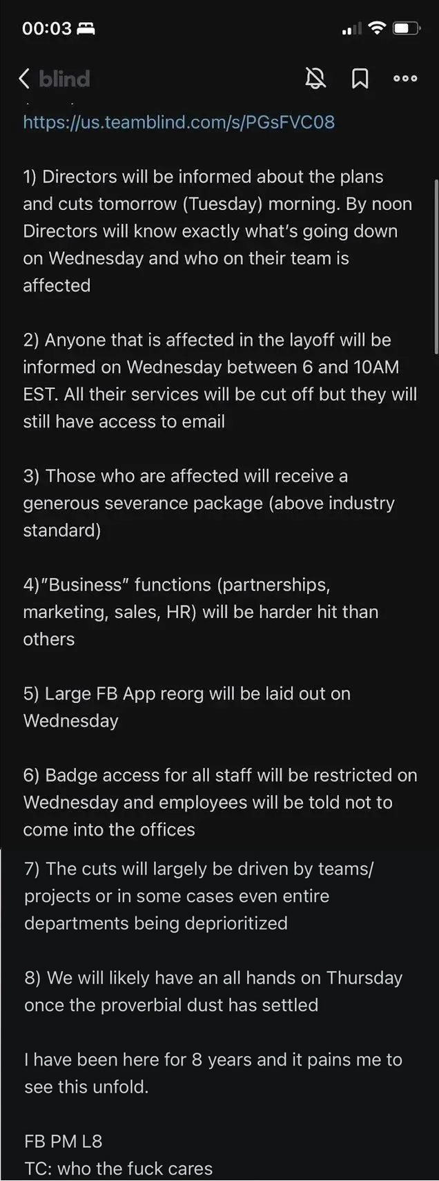 Tech星球11月9日消息,此前Meta将启动史上初次大规模裁人的消息引发热议,据报道,Facebook母公司Meta大概最早从周三开始大规模裁人。 报道称,此次裁人预计将影响数千名员工,这将标志着Meta公司汗青上初次大规模裁人。9月尾,该公司陈诉称其员工总数凌驾8.7万名。 对于裁人的消息,Meta的一位发言人拒绝置评,并让媒体参考扎克伯格在上个月公司最新收益电话集会会议上的批评。 “2023年,我们将把投资重点放在少数重点增长范畴,” 扎克伯格其时说,“这意味着一些团队将意义地得到增长,但其他大多数团队将在未来一年保持稳固或萎缩。总的来说,我们预计到2023年,公司的规模将与如今大抵类似,以致略小于如今。” 如今有了最新消息,据“一亩三分地Warald”报道,详细的裁人过程,如今被一个号称是 L8(Director、总监级别)的人在网上匿名爆了出来: 一、周二,部分总监们会收到详细的裁人名单和周三裁人细节、注意事项。 二、员工会在东海岸清晨6-10点一连收到裁人关照。 三、 裁人赔偿丰厚。 四、非技能岗是重灾区,技能岗相对来说,裁人幅度小。 五、公司许多部分会重组。 六、周三员工无法刷卡进入办公室,各人都在家办公。 七、裁人重要看项目和组决定,有的组丧失惨重。 八、周四有all hands(全公司大会)。 据“一亩三分地Warald”,Meta工作压力很大,纵然在正常年份,每年都得用绩效评估赶走2-3%的员工。假如这次只是5%大概略高比例裁人,那继续用绩效稽核作为捏词即可。如今既然号称是 large scale layoff,那比例应该是双位数。有媒体推测,此次裁人有大概高达15%,相称于13000人。 别的,尚有消息称,Meta或将调解资源付出作为下一步的目的。据《巴伦周刊》消息,只管Meta方面并没有对裁人和资源付出的举行直接点评,但是Meta首席战略官Dave Wehner称,资源付出的控制将形成竞争上风。 |