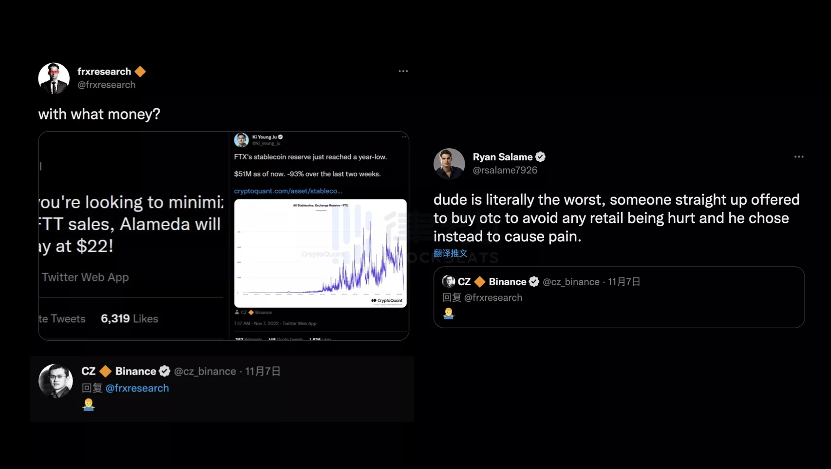 11 月 9 日破晓 0 点,SBF 在本身的社媒账号发布推文: 「各人好,我有几件事要公布。 事变兜了个圈子,我们已经与 FTX 的第一个投资者,也是末了一个 Binance 告竣了战略生意业务协议(正等待举行尽职观察)。我们的团队正在按原有的环境清算提款积贮,这将消除活动性紧缩;全部资产将 1:1 覆盖。这是我们要求 Binance 到场的紧张缘故起因之一。这大概必要一些时间才华完全办理,我们对此体现歉意。 非常感谢 CZ、Binance 和我们全部的支持者。这是一项以用户为中央的开辟,有利于整个行业。CZ 在构建环球加密生态体系和创造一个更自由的经济天下方面已经做出了难以置信的工作,将来也将继承云云。我知道,媒体上不绝有传言称我们两家生意业务平台之间存在辩说,但 Binance 反复表明,他们致力于打造更加去中央化的环球经济,同时积极改善与羁系机构的关系。他会将齐备办理好。(请留意 FTX.us 和 Binance.us 这两家独立公司现在不受此影响。FTX.us 的提款不绝是可用的,资产完全支持 1:1 覆盖,而且运行正常。)」 10 分钟后,CZ 紧随发文: 「本日下战书,FTX 因活动性出现严峻紧缩向我们寻求资助。为了掩护用户,我们签署了一份不具束缚力的意向书,(Binance)计划完全收购(FTX)。我们将在将来几天对这件事举行完备的观察。有很多内容要涵盖,而且必要一些时间。这是一个高度动态的环境,我们正在实时对其举行评估。Binance 有权随时退出生意业务。随着局势的发展,我们预计将来几天 FTT 的代价将大幅颠簸」。 这场牵动数十亿美元、轰动行业表里的空前对决,就如许以一两条轻描淡写的推文,在不到 48 小时的时间里戛然闭幕。时隔 1 年零 3 个月,FTX 重新回归 Binance 度量。消息一公布,FTT、BNB 短时飞涨,15 分钟内最大涨幅超 40%。 实在 FTX 与 Binance 的恩怨泉源已久,两家于 2021 年 7 月正式公布分道扬镳后,便摩擦不绝(BlockBeats 注,详细内容见《FTX 与 Binance 战役升级,从勾肩搭背到针锋相对》)。从杠杆 Token 的推出,到 Voyager 等加密机构的收购夺取战,再到前不久 CZ 回应本身身份国籍等变乱,背后都影射出两个加密巨鳄的拉锯与对抗。本日这场以 Binance 收购 FTX,SBF 玩币归赵收尾的正面临抗,给加密行业画上了又一个「雷曼分节符」。 惊魂 48 小时本次变乱起自 CoinDesk 于 11 月 2 日发布的一篇文章。这篇名为《Divisions in Sam Bankman-Fried's Crypto Empire Blur on His Trading Titan Alameda's Balance Sheet》的文章,披露了一份私人财政文件,指出 SBF 的加密生意业务巨头 Alameda Research 现在大概存在的资债环境。 文章指出,Alameda 的资产负债表大部分资产为 FTX 平台 Token FTT。制止 6 月 30 日,Alameda 资产达 146 亿美元,此中最大的单一资产为代价 36.6 亿美元的 FTT,其他紧张资产包罗 33.7 亿美元的 SOL 和 Solana 生态 Token。负债则有 80 亿美元,紧张是 74 亿美元的贷款。 文章一经发出便开始在社区连续发酵,FUD 感情不绝堆积。6 日破晓,名为 Autism Capital 的推特用户发文体现,FTX 的「死敌」Binance 已将本身账上剩余代价 2300 万枚 FTT 转移至好易平台。消息传出后再次引起社区反映,FTT 代价出现下跌。 6 日晚,Alameda 做出正面回应,CEO Caroline Ellison 在交际媒体上针对近期「Alameda/FTX 或将资不抵债」的传言发布回应体现,网传版资产负债表实在仅列出了 Alameda 部分资产,Alameda 有高出 100 亿美元的资金未能在该负债表中列出。 Caroline 增补体现,网传版资产负债表仅列出了 Alameda 几个最大的多头头寸,但 Alameda 显然有其他对冲资产。鉴于本年加密信贷空间的收紧,Alameda 现已归还大部分贷款。推文发出后,FTT 代价回升至 24 美元附近。 不久后,CZ 发文,体现 Binance 客岁退出 FTX 股权后,收到了约莫 21 亿美元等值的现金(由 BUSD 和 FTT 构成)。由于迩来曝光的消息,Binance 决定整理其账面上全部剩余 FTT。Binance 将实行以最小化市场影响的方式去做。由于市场条件和活动性有限,预计抛售活动必要几个月才华完成。Binance 始终鼓励行业到场者之间的相助,本次抛售活动与「针对竞争对手」无关。CZ 推文发出后,FTT 代价灵敏从 24 美元附近下跌至 21 美元附近。 紧接着,Alameda CEO Caroline Ellison 在交际媒体上回应「Binance 清仓 FTT」,她体现假如 Binance 首创人 CZ 想让清仓对二级市场的影响降到最低,Alameda 现在非常乐意以 22 美元的代价收入。推文发出后,FTT 代价回升至 22 美元。 短短一天内,受社区信息和 Binance 出售 FTT 引发的连环效应,已经有近 10 亿美元的资产从 FTX 和 Alameda 的相干钱包所在流出。SBF 于 8 日下战书做出回应,责怪有竞争对手蓄意抹黑,并夸大平台有本事覆盖全部效户的资产,试图安抚市场和 FTX 用户。然而 SBF 的回应没有起到太大的作用,平台上仍有大量客户在转出资金,FTX 上的稳固币更是在灵敏枯竭,以致刚进入平台的稳固币也险些是立即耗尽(图二、图三)。 现在,FTX 和 Alameda 不光必要付出用户提款,还要摆设资源保卫 FTT 的代价,Alameda 的相干钱包所在也开始反复从各大生意业务所转移资产进入 FTX。与此同时,CZ 却在推波助澜,在一条质疑 Alameda 22 美元回购答应的推文下复兴了一个耸肩心情。这也直接激怒了 FTX 数字市场 CEORyan Salame,他在推特上直接引用 CZ 推文,表达了对其在公开市场抛售 FTT 的不满。 随着恐慌感情堆积,大量谋利者开始通过合约市场涌入,数小时内,FTTUSDT 永续合约在 Binance 上的生意业务量从 2000 万美元激