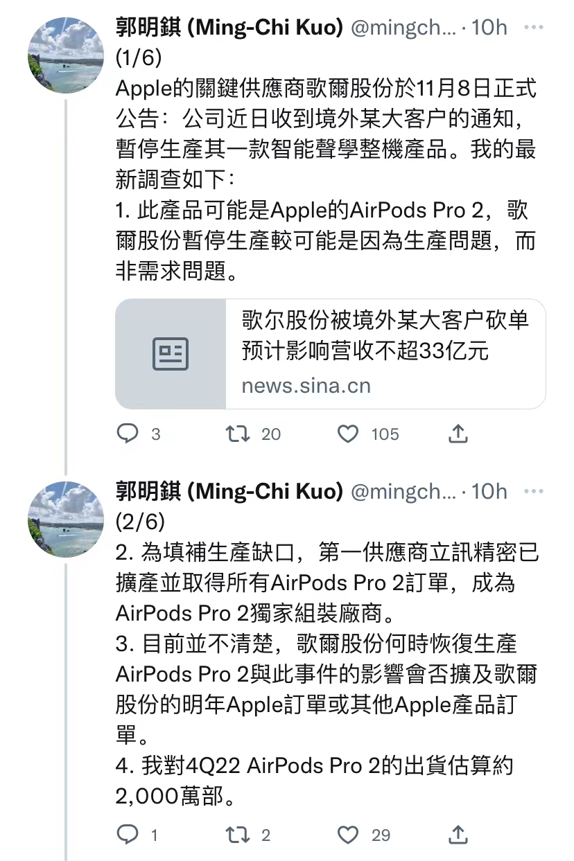 中新经纬11月9日电 9日,700亿白马股歌尔股份整日跌停,制止收盘,该股跌停报20.72元/股,创2020年中旬来新低,有高出299万手资金折合人民币超62亿元挂跌停价伺机离场,成交量萎缩至6.04亿元。 8日晚间,歌尔股份发布风险提示性公告称,公司克日收到境外某大客户的关照,停息生产其一款智能声学整机产物。本次业务变动预计影响2022年度业务收入不高出人民币33亿元,约占公司2021年度经审计业务收入的4.2%。 为相识该变乱详情,中新经纬与歌尔股份取得接洽。 对变乱影响,该公司在回应中夸大,现在公司与该客户的别的产物项目相助仍在正常开展,网络上的不实传言请留意甄别。 缘故因由众说纷纭 对于歌尔股份产物突遭停产,市场纷纷将眼光聚焦在缘故因由上。 据汹涌消息,有市场听说称,歌尔股份代工的苹果耳机因良率不高,短期订单被调解。听说还称,歌尔涉嫌良率造假被发现,被客户罚款。 天风国际证券分析师郭明錤9日破晓也体现,此产物大概是苹果的AirPods Pro 2,歌尔股份停息生产较大概是由于生产标题,而非须要标题。为弥补生产缺口,第一供应商立讯精密已扩产并取得全部AirPods Pro 2订单,成为AirPods Pro 2独家组装厂商。 截图泉源:郭明錤交际账号 耐人寻味的是,据财联社,针对歌尔股份停息生产的智能声学整机产物,订单流入立讯精密的消息,立讯精密证券部人士回应称“这我们不方便品评”。 别的,一位歌尔被裁人工向媒体证明,被歌尔裁人之后可以由中介安排选择转厂去昆山立讯以及泰州蓝思。 值得留意的是,对于变乱缘故因由,中新经纬在与歌尔股份沟通过程中,该公司并未就此作出正面回应,但夸大,现在公司与该客户的别的产物项目相助仍在正常开展,网络上的不实传言请留意甄别。 过百只基金“踩雷” iFinD数据体现,在2021年末,有450只基金持有歌尔股份,彼时在元宇宙概念的高潮下,该股一度站上50元/股的关口。进入2022年,歌尔股份基金持股数在一季度降至243只、二季度降至157只、三季度进一步降至120只,公司股价也频频下探至20元至30元区间。 歌尔股份股价日走势图 泉源:Wind 详细来看,易方达基金旗下三只基金易方达中盘发展肴杂、易方达研究精选股票、易方达行业领先企业肴杂在2022年第三季度分别减持23.05%、32.77%、13.87%。制止三季度,上述三只基金仍持有歌尔股份超2800万股。 别的,华宝基金旗下华宝行业精选肴杂、华宝先辈发展肴杂在第三季度也有显着减持动作。 国泰基金、宝盈基金等基金公司在第三季度则对歌尔股份有差别水平的增持。 业绩方面,因乐成切入苹果财产链,歌尔股份比年来业绩呈“井喷式”增长,据Wind数据,该公司营收从2012年的72.53亿元增长至2021年的782.21亿元及2022年前三季度741.53亿元,同期,公司净利润也从9.23亿元增至43.07亿元及38.72亿元。 此次,歌尔股份突遭境外大客户关照,停息生产其一款智能声学整机产物,变乱后续影响仍无法盘算。 郭明錤分析称,现在并不清晰,歌尔股份何时规复生产AirPods Pro 2以及该变乱的影响会否扩及歌尔股份的来岁苹果订单或别的苹果产物订单。 歌尔股份在公告中也体现,该事项对公司经业务绩的影响仍在评估中。 值得一提的是,此前歌尔股份曾在10月27日晚间交出一份颇为亮眼的三季报,公司第三季度实现营收305.49亿元,同比增35.77%;归属于上市公司股东的净利润17.61亿元,同比增9.98%。 同日,该公司发布2022年年度业绩预告,预计2022年归属于上市公司股东的净利润40.61亿元至47.02亿元,较上年同期变动-5%至10%。歌尔股份对此体现,受宏观经济和行业因素的影响,公司智能声学整机业务红利略有降落。 对于此次境外大客户的决定,歌尔股份回应中新经纬称,公司对峙零整联合的战略,积极推动声学、光学、微电子和精密布局件精密零组件产物和VR/AR、智能可穿着和智能家居等智能硬件整机产物业务发展,还在积极拓展的一些汽车电子、触觉等新业务方向。(中新经纬APP) |