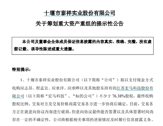创造A股首家“北转创”纪录刚满一周,克日泰祥股份又“快马加鞭”官宣将操持庞大资产重组,再次革新了市场纪录。 只管此次拟收购标的业绩处于亏损状态,但泰祥股份夸大了标的产物布局和优质的客户资源,以及公司布局汽车轻量化范畴的战略。受此消息提振,8月18日公司股价涨停,转板以来5个买卖业务日内涨幅超74%。本日早盘,泰祥股份股价走低,制止午间收盘,跌6.37%。 公布操持庞大资产重组 8月17日晚间,刚转板一周的泰祥股份就发布了关于操持庞大资产重组的提示性公告。 根据公告,为了优化公司产物和客户布局,拓宽公司业务范围,加速公司在新能源汽车零部件及汽车轻量化范畴的布局,增强公司综合竞争力,泰祥股份拟以付出现金方式,收购应志昂、程孟宜、答允洋、答允晔以及其他股东持有的宏马科技不少于 76.38% 股权,终极收购股权比例、买卖业务对方及买卖业务代价由买卖业务各方协商后确定。 泰祥股份体现,经开端测算,本次买卖业务预计将构成《上市公司庞大资产重组管理办法》规定的庞大资产重组,具体情况尚待审计工作完成后方能确定。本次买卖业务不涉及发行股份,不构成关联买卖业务,也不会导致公司控制权的变更。 标的公司2021年亏损万万 根据公告,标的江苏宏马科技股份有限公司建立于2011年11月,注册资源7072.8万元,策划范围包罗:生产、加工、研发、贩卖汽车零部件及配件、平凡呆板装备及零部件、铝铸件、传动部件;自营和署理各类商品及技能的收支口业务。 主业务务上,宏马科技重要致力于汽车铝合金细密压铸件的研发、生产和贩卖,重要产物 包罗发动机缸盖罩壳、油底壳、发动机支架以及伺服壳体、泵体泵盖等。重要客户包罗整车厂和零部件供应商。如一汽大众、上汽大众、一汽车股份、博世、麦格纳、采埃孚等。 不外根据宏马科技未经未经审计的财政数据,该公司客岁还是亏损状态。2021年,该公司实现业务收入2.29亿元,净利润-1573.54 万元,制止 2021 年末,其资产总额为 3.86亿元,净资产为 2.21亿元。 对此,泰祥股份体现,只管标的公司 2021 年处于亏损状态,但公司重要看中宏马科技具有丰富的产物布局和优质的客户资源,与公司之间具有良好的协同效应,且本次买卖业务有利于推动公司从玄色金属铸造向有色金属铸造范畴延伸这一发展战略,资助公司尽快实现在汽车轻量化范畴的布局。 转板以来涨超74% 官网资料体现,泰祥股份建立于1997年,重要从事汽车零部件的研发、生产和贩卖,是德国大众汽车团体的举世供应商。主营产物汽车发动机主轴承盖广泛用于奥迪、大众、斯柯达等品牌的主力车型上,并远销德国、匈牙利、巴西、墨西哥、俄罗斯、印度等国。 制止2022年,泰祥股份拥有发明专利4项,实用新型专利30余项,庞大科技结果转化1项,是国家高新技能企业、湖北省细分范畴隐形冠军企业。2021年先后被湖北省经信厅、工信部认定为“专精特新”小巨人企业。 业绩方面,近三年公司累计营收约5亿元;归母净利润方面,2020年及2021年未有太大厘革,均在7万万左右;扣非净利润方面,则呈下滑趋势,2021年扣非净利润为6149万元,同比上年降落了6.21%。制止2021年底,公司策划运动现金净流量为7322万元。 2015年,泰祥股份在新三板挂牌,2017年晋级“新三板创新层”,2020年实现IPO,并晋级“新三板精选层”,2021年成为北交所首批上市公司。8月11日,泰祥股份乐成登岸厚交所创业板,成为天下北交所转板创业板第一股。当日,泰祥股份开盘1分钟就触及暂时停牌,盘中一度涨涨逾100%,终极收涨80.34%,总市值涨了15亿元。 而在官宣操持资产重组消息后,8月18日泰祥股份收报34.22元,当日涨幅19.99%,8月11日以来涨幅超74%,公司最新市值为34.2亿元。 股吧里,投资者也是颇为高兴,纷纷体现还会涨停,乃至有投资者直言是“牛股出世”。 从8月18日龙湖榜单来看,当日业务部席位合计净买入2679.29万元。此中,卖出前五里,游资累计卖出了1186.4万元。 泉源:中国基金报(ID:chinafundnews) 编辑:万健祎 版权声明 证券时报各平台全部原创内容,未经书面授权,任何单元及个人不得转载。我社生存追究相干运动主体法律责任的权利。 END |