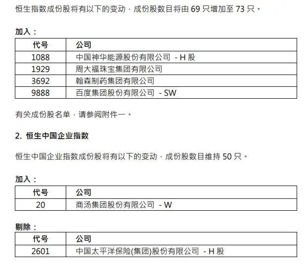8月19日,据恒指公司消息,恒指公司将百度、中国神华、周大福、瀚森制药等4家公司纳入恒生指数,恒生指数成份股将由69只增长至73只。 将商汤纳入恒生中国企业指数,成份股数量维持50只。恒生科技指数成份股没有变动,成份股数量维持30只。 |