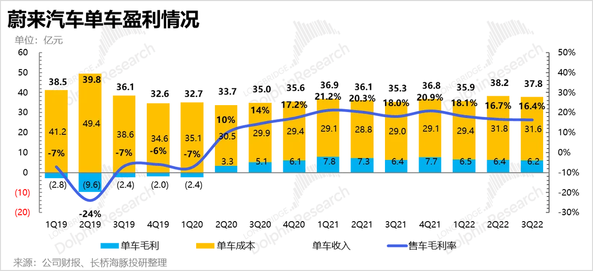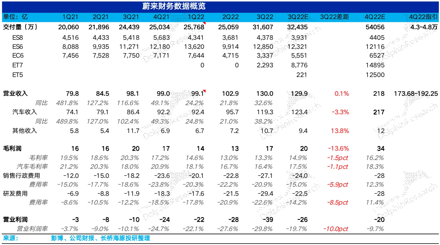 蔚来汽车(NIO.N)于北京时间11月10日长桥美股盘前发布了2022年第三季度财报。要点如下: 1、低销量明牌下,收入委曲合格:三季度收入130亿元,与市场根本同等,在销量已知的环境下,汽车单价和其他服务性业务收入不算埋雷,收入端无功无过。 2、亏损拉爆,毛利率是原罪:这个季度的谋划亏损靠近40亿,远远超出了市场预期的26亿,背后是毛利率、研发和贩卖费用的全面失守。假如说研发和贩卖是连续之前的刚性增长趋势,最多就是比市场预期得还多的话,这个季度焦点的题目照旧在卖车毛利率没有预期中的改善,反而还在环比下滑中,尤其是汽车毛利率和销量指引作为每季度两大重点指标,毛利率严肃不及预期似乎非常严肃。 3、四序度指引又让人扫兴了?四序度销量指引是4.3-4.8万辆,似乎远低于彭博上的卖方预期5.4万辆,也由于销量指引差,收入指引同样远远低于市场预期。 海豚君团体观点: 三季度业绩跟市场上的卖方预期相比,在关键指标上似乎全面失守,尤其是毛利率和汽车销量指引这两个最大的关键跟踪指标,坍塌相当严肃。 要知道,毛利率上,三季度初市场本来的判断是涨价全面打入交付车辆且走出二季度疫情打击,应该环比上升;而销量上,市场以为ET5批量交付+其他新车的放量,销量怎么也得上5万,但结果似乎与当初的预期差距竟然这么大,之前海豚君对于蔚来的判断也出现显着瑕疵。 但如许烂的业绩上,海豚君以为实在已经早已在十一假期特斯拉销量公布+特斯拉贬价过程中+疫情反复当中,已经被打入的定价当中(期间蔚来跌幅50%左右),以致有太过灰心定价的怀疑。 本季度所谓的低于预期,是卖方在9月之前的“旧预期”,关注预期差意义不大。从现实结果来看,毛利率下行确实是个比力大的题目,而且趋势上大概率照旧连续下行;但从销量指引上来看,蔚来给出4.3-4.8万的销量指引相比之前市场5.4万辆的预期并不算大幅坍塌。 在来岁推测上,随着各大车厂产量开释,龙头带头贬价、政策补贴退出,代价恶战已在所难免。这种阶段战粮储备第一,如今蔚来账上514亿的战粮储备(包罗现金与等价物、受限定现金、短期投资和恒久定存),再加上蔚来的高端品牌定位势能,以及错层显着的产物矩阵,应对来岁的厮杀底气是在国内一众造车新权势当中,应该是最富足的。 从这个角度出发,海豚君以为蔚来已经很难再现2019年现金流几近断裂、存亡一线间的非常估值。假如把当时1.6倍的PS作为蔚来的保底估值的话,而如今股价到9美元+,联合来岁收入预期900-1100亿人民币左右,纵然2023年只能兑现预期的75折,当前股价对应的2023年700亿收入的PS也就不外1.6倍而已。 因此,在造车新权势股价充实下泄之后,在海豚君看来,蔚来应该是开始可以关注起来的一支新权势。 一、扫兴的销量推测? 当前,车辆交付量是新能源车品牌最关键指标。但车企每月初公布上月销量,每次财报销量上关键是看指引。 四序度销量推测:蔚来预计四序度车辆交付在4.3万辆到4.8万辆之间,由于十月交付是一万辆多一点,隐含新能源补贴退坡钱,12月尾单月销量有大概冲刺两万。 固然,销量走上4-5万的区间相比之前季度3万左右是个显着进步,但在ET 5进入交付阶段,之前市场有着更高的等待。 譬如,彭博上对四序度的同等预期是5.4万辆。不外,这个预期数据在海豚君看来,应该更多是十月之前或特斯拉贬价之前的预期,思量特斯拉贬价+近期疫情反复,市场应已经下调了四序度销量预期,海豚君看到大行一些较为近期的预期根本约莫是在4.8万辆左右,从现实预期差的角度,蔚来的销量指引实在并不算非常扫兴。 从换代车型上,2022年是蔚来从SUV/轿跑866(ES8、ES6、EC6)到NT2.0平台的775(ET7、ES7、ET5) 过渡年份。 此中,新款轿车ET7三月开始交付,团体水花不大,单月销量如今根本停顿在三千辆上下;新款SUV ES7 从八月开始交付了几百辆,到十月靠近3000辆。 市场最为关注的ET5 9月开始交付,不外到10月才刚过千辆,真正放量应该是到四序度,取决于产能开释速率,估计有渴望冲刺万辆。 三季度现实交付量:公司2022年三季度实现交付量3.16万辆,根本在指引3.1-3.3万辆之内,同比增长29%,随着新车渐渐进入交付状态,蔚来确实走出了青黄不接的换代季,团体销量渐渐回暖,只是回暖速率大概并没有市场预期得那么乐观。 二、单价准期边际下行 单车代价:公司三季度单车收入37.75万元/辆,同比单车代价上行了2.4万,环比下行4400元,环比下行紧张是由于定价较为自制的ET5销量占比提拔,这个下行幅度算是在预期之内,因此单车代价并不是题目。 三、单车红利一起向下? 二季度小幅规复后,三季度毛利率再次有失守的趋势,只有16.4%。原来走出疫情影响,三季度根本上全部交付涨价后的新订单,市场预期的汽车毛利率高达17.5%,卖车业务毛利率没有提拔,海豚君估大概与新平台车的毛利率还未上来有肯定关系。三季度,卖一辆车毛赚6.2万,比上季度下滑了1800元。 而当前的题目是,毛利率下行的趋势恐怕还得连续,当前蔚来主销国内,但国内竞争已经急剧变差,特斯拉国内直接贬价(1-3万之间)+变相贬价(买保险减车价)。 而毛利率恶化题目接下来大概率只会继续:海豚君留意到蔚来的部门车型已经开始贬价,比如诵韵平台生产的EC 6,如今的贬价幅度根本在一万上下,同时近期锂矿代价又往60万/吨的代价迈进,而12月竣事之后,新能源补贴进一步退坡,在特斯拉主导的贬价周期