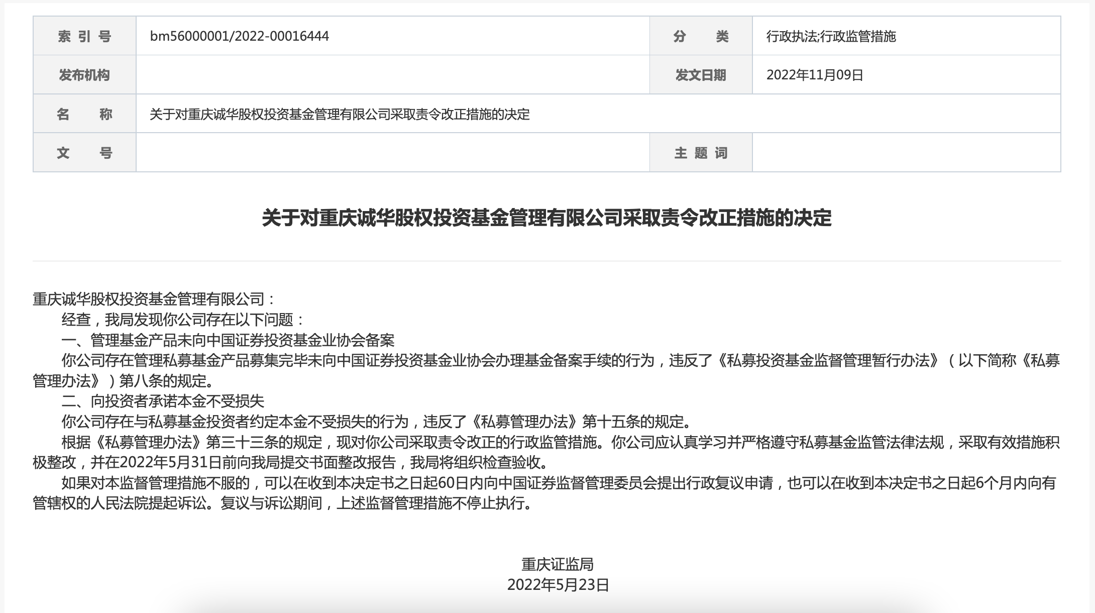 每经记者:任飞每经编辑:肖芮冬 11月9日,重庆证监局公布了此前对辖内重庆诚华股权投资基金管理有限公司(以下简称重庆诚华股权投资基金)的处罚决定。根据查证,认定其存在管理基金产物未向中国证券投资基金业协会存案、向投资者允许本金不受丧失等违规标题,已被当局采取责令改正步伐。 每经记者注意到,该基金管理人近一年已无在管基金。另据羁系公示,其机构存在非常策划,现在机构全职从业职员已低于5人。 有投资界人士指出,人数的多寡或不能判定企业是否面临停业风险,但凌驾12个月无在管基金,其私募股权投资牌照或面临打消的风险。 违规事项包罗“允许本金不受丧失”又是一起允许保本被查的案例。重庆证监局11月9日公布了此前对重庆诚华股权投资基金采取责令改正步伐的决定,此中有关基金管理人的违规事项中列示,存在向投资者允许本金不受丧失。 根据重庆证监局的转达,重庆诚华股权投资基金存在与私募基金投资者约定本金不受丧失的举动;而且存在管理私募基金产物召募完毕未向中国证券投资基金业协会办理基金存案手续的举动。 上述违规举动已被查实,现羁系已对其做出采取责令改正步伐的决定。 记者注意到,重庆诚华股权投资基金是协会存案的私募股权、创业投资基金管理人,而对于此类机构范例,有关允许基金保本的违法举动其着实过往已多次发生。 总结来看,类似多以基金延期或整理后的资产处理举行二次邀约作为哟Ψ,或渴望投资人(LP)延期,或渴望转投其他范例产物。有法律界人士公开表现,还会包罗差额补足,即在预期目标与现实得到投资回报之间的差额部分,设定肯定的差额补足任务;四是包管,即由包管人负担代为推行本金亏损的部分或负担连带责任。 但必要指出的是,此类保底性子协议大多数情况下是无效的。 管理人全职从业职员已少于5人从重庆诚华股权投资基金的详细情况来看,该机构固然早在2014年8月就已在协会存案,不外本年以来却频遭法务纠纷,此中就涉及劳动争议。每经记者注意到,协会信息表现,该机构全职从业职员已少于5人。 该事项是指在协会从业职员管理人平台中注册的全职员工数量少于5人,而就启信宝公布的有关该机构民事案件当中,涉及与公司发生的劳动争议多达7起,均是2022年开庭公告纪录。 在业内人士看来,职员的多寡或不能判定其停业与否,但就策划层面的影响是有的。有投资界人士在11月10日同《逐日经济消息》记者微信交换时表现,停业的大概性与职员的多寡并没有直接的相干性,但是职员少且多有劳动纠纷,阐明其团队的稳固性较差,对策划管理本领大概造成负面的影响。 另据羁系信息纪录,重庆诚华股权投资基金现在在管私募基金全部整理后,已凌驾12个月一连无在管基金。而且有非常策划征象,非常策划期间停息受理该机构的基金存案申请、该机构相干巨大事项变更申请以及相干关联方新设私募基金管理人的登记申请。 固然是被动停息,但前述投资人指出,机构如果出现全部基金整理后,凌驾12个月没有在管基金的情况,其机构自己的牌照是有被打消的风险的。 该人士指出,允许保本是为了更好从投资者手里召募资金,但违背了风险原则,属于违规的允许,既存在羁系风险、也存在兑现风险。该人士提示,任何投资都有盈亏大概,如果投资目标是风险性的,又允许保本,这就存在抵牾辩说。 逐日经济消息 |