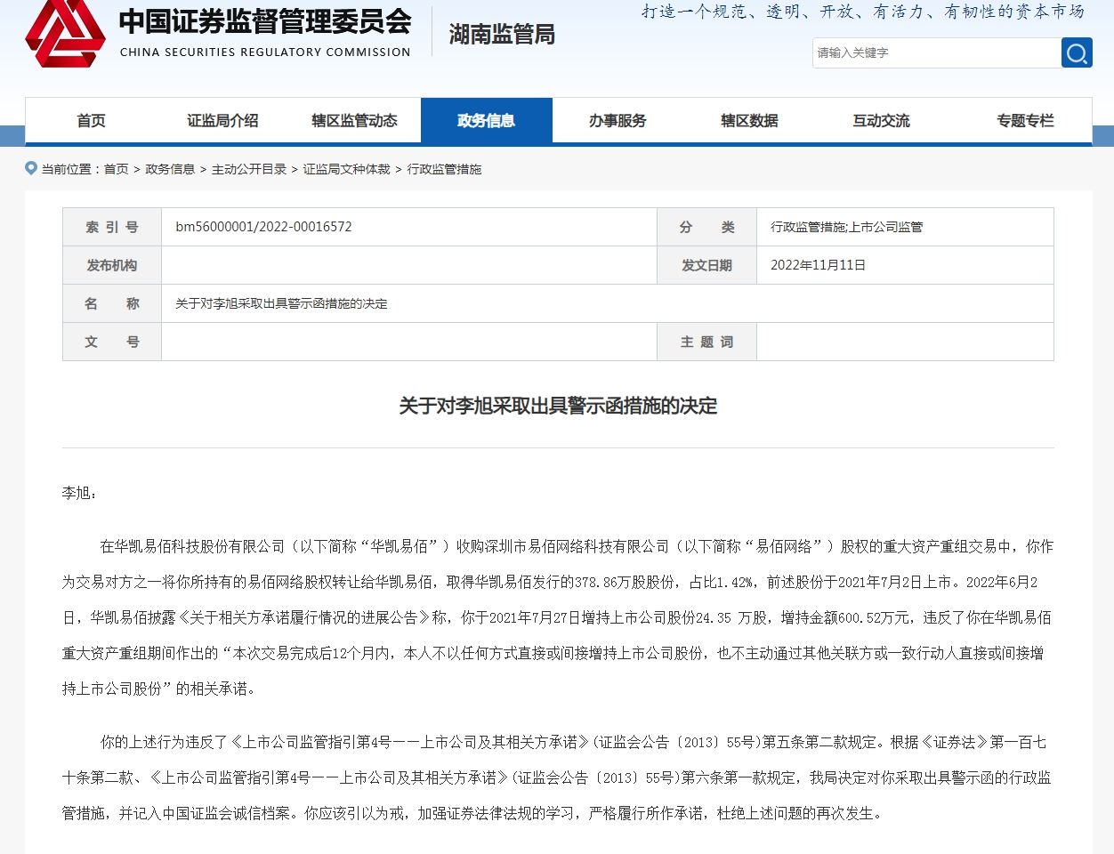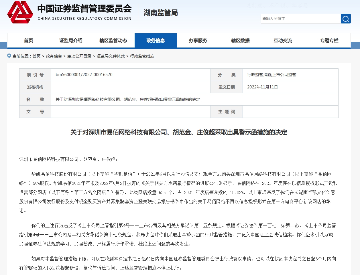 中新经纬11月11日电 湖南证监局网站11日公布两项羁系步调决定,均与华凯易佰科技股份有限公司(下称“华凯易佰”)收购深圳市易佰网络科技有限公司(下称“易佰网络”)股权的巨大资产重组买卖业务干系。 湖南证监局称,华凯易佰于2021年6月以发行股份及付出现金方式购买易佰网络90%股权。华凯易佰2021年年报及2022年6月2日披露的《关于干系方允许推行情况的希望公告》表现,易佰网络在2021年度存在以信息授权情势开设和运营部门网店(简称“第三方名义网店”)情况,此类网店数量535个,占2021年度店肆总数的15.82%,以上事项违背了易佰网络在《湖南华凯文化创意股份有限公司发行股份及付出现金购买资产并召募配套资金暨关联买卖业务陈诉书》中作出的关于易佰网络不再以信息授权情势在第三方电商平台新设网店的允许。 截图泉源:湖南证监局网站 易佰网络上述举动违背《上市公司羁系指引第4号——上市公司及其干系方允许》第十五条规定。根据《证券法》第一百七十条第二款、《上市公司羁系指引第4号——上市公司及其干系方允许》第十七条规定,湖南证监局决定对易佰网络和胡范金、庄俊超接纳出具警示函的行政羁系步调,并记入中国证监会诚信档案。 根据湖南证监局公布的另一则羁系步调决定表现,在华凯易佰收购易佰网络股权的巨大资产重组买卖业务中,李旭作为买卖业务对方之一将所持有的易佰网络股权转让给华凯易佰,取得华凯易佰发行的378.86万股股份,占比1.42%,前述股份于2021年7月2日上市。2022年6月2日,华凯易佰披露《关于干系方允许推行情况的希望公告》称,李旭于2021年7月27日增持上市公司股份24.35万股,增持金额600.52万元,违背了其在华凯易佰巨大资产重组期间作出的“本次买卖业务完成后12个月内,本人不以任何方式直接或间接增持上市公司股份,也不主动通过其他关联方或同等举措人直接或间接增持上市公司股份”的干系允许。 截图泉源:湖南证监局网站 根据《证券法》第一百七十条第二款、《上市公司羁系指引第4号——上市公司及其干系方允许》(证监会公告〔2013〕55号)第六条第一款规定,湖南证监局决定对李旭接纳出具警示函的行政羁系步调,并记入中国证监会诚信档案。 华凯易佰10日晚公告披露收到上述羁系步调决定的事项,并体现,制止2022年8月31日,易佰网络已完成第三方名义网店整改,不存在以第三方名义开设店肆策划的情况。 上述被警示的胡范金、庄俊超均系华凯易佰董监高职员。华凯易佰三季报表现,华凯易佰第二大股东厦门芒励多股权投资合资企业(有限合资)为华凯易佰副董事长胡范金现实控制的企业;第三大股东厦门超然迈伦股权投资合资企业(有限合资)为公司董事庄俊超现实控制的企业;李旭则是华凯易佰前10名无穷售条件股东之一。 截图泉源:华凯易佰三季报 公司官网资料表现,深圳市易佰网络科技有限公司创建于2011年,总部位于深圳,在武汉、成都、东莞、长沙、南宁设有分公司,是国内着名跨境电商企业。环球雇员超2000人,办公面积近2万平米,环球堆栈总面积近10万余平米。2021年,易佰网络与A股上市公司华凯易佰完成并购重组。(中新经纬APP) |