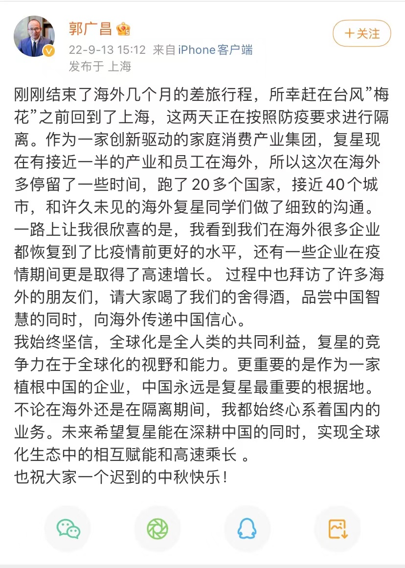 本文泉源:期间周报 作者:黄嘉祥 11月10日,郭广昌再次出现在公众眼前。作为复星话事人,他以视频方式出席了旗下公司举行团体业绩分析会。 “我笃信,我们将在将来的五到十年迎来一个全新的发展机会期。”郭广昌如是说。这离他9月13日竣事长达几个月的外洋行程回到上海,在微博公开发声已已往近60天。 本年以来,复星不绝深陷债务压顶和变卖资产回血的漩涡当中。6月14日,评级机构穆迪将复星国际Ba3的公司家属评级列入下调观察名单,直指复星存在活动性压力——制止2022年3月末,复星在控股层面的库存现金不敷以付出将来12个月到期的短期债务。 今后,一枚石子荡起的荡漾,渐成巨浪。传言四起,真假难辨。复星被质疑,郭广昌被非议,“大而不能倒”似乎已是已往式。 “我看到我们在外洋许多企业都规复到了比疫情前更好的水平,另有一些企业在疫情期间更是取得了高速增长。”郭广昌在9月13日的微博中说,并表现“中国永久是复星最紧张的根据地”。 两天后,他再次微博发文,坚称羁系部分要求摸底复星的报道“严肃背离毕竟”,“严肃误导投资者”。姿态倔强。 掌舵人回到根据地,军心是否稳固外人不得而知,但复星出售资产节奏显着加快。郭广昌返国后,在近60天的时间里,“复星系”通过出售资产和减持套现超230亿元,年内套现已超400亿元。 套现是为了回血。10月25日,摩根士丹利、花旗等机构发布陈诉称,复星国际管理层对分析师们表现,在将来12个月内,还将处置惩罚500亿至800亿元的非焦点资产,从而将其净负债减半,降至500亿至600亿元水平。 郭广昌25岁创业,至今30年,几经风雨,安然而过,复星终成高出金融和实业、结构遍布20多国,资产总量超8000亿元的巨型资源谱系。可以预见的是,出售资产是复星接下来应对活动性危急的紧张路径,继承紧缩不可制止。哪些资产可以卖?怎么卖?复星有非卖品吗?还会买哪些? 这些题目都磨练着郭广昌和复星。 归国72小时:回应质疑 11月10日下战书,面对怎样把握新发展机会,郭广昌给出回应:是聚焦主业,增强创新,做好环球化。 复星医药、豫园股份、南钢股份、海南矿业2022年第三季度业绩团结分析会现场。图片泉源:复星团体官网 曾经有一段时间,郭广昌和复星是环球市场最为活泼的买手之一。他以总能踩对节点著称,被誉为“中国的巴菲特”。“复星系”高出地产、医药、投资、时尚、保险、酒业、钢铁等范畴,在A股和港股拥有10余家上市公司。郭广昌坦言,贸易的本质是一种规模经济,假如没有规模,就没有竞争力。 从前,“买买买”是复星的扩张利器,成绩了多元化谋划。现在,“卖卖卖”成了复星的自救砝码。 制止本年6月末,复星国际包罗银行乞贷、公司债等在内的计息负债合计2611.18亿元,此中短期计息负债为1236.92亿元。彭博数据体现,复星国际现在境外债券应付本金总额约为64.65亿美元,2023年内到期债券的应付本金合计26.15亿美元。复星在境内另有巨大的债务,制止2022年底,“复星系”公司在境内将有130多亿元债券到期或回售。 评级机构提示风险,各种声音此起彼伏。9月13日,市场流传北京国资委已下发关照,要求市管企业梳理与复星团体相助情况,并研判相干相助风险。 同一天,郭广昌发布微博,表明已身在国内。他还说,复星现在有靠近一半的财产和员工在外洋,以是这次在外洋多停顿了一些时间,跑了20多个国家,靠近40个都会。郭广昌夸大:“岂论在外洋还是在隔离期间,我都始终心系着国内的业务。” 图片泉源:郭广昌微博 这是复星陷入债务危急风波3个月以来,郭广昌初次发声,直面质疑。还是在9月13日,复星团体回应称,北京国资委关照是针对热门企业和舆情做的通例信息网络,没有任何针对性,复星在北京各项业务发展正常。越日,复星国际副总裁祝文魁在北京拜会北京市国资委有关向导,就相助情况举行互换。 “复星的发展过程中,履历过许多坎,也曾经直面过许多谎言,但我们都挺过来了。”郭广昌在9月15日的微博发文中,请股东、投资人放心,他和复星的一百多位环球合资人及全部复星人会继承积极,把企业做好。 在同一天召开的投资者沟通会上,郭广昌坦言,在当下的市场情况中,复星作为一家民营企业遭受了巨大压力,一方面来自舆情影响,另一方面是公开债窗口关闭影响。面对这些压力,复星长期以来的战略是加大现金储备,加厚“安全垫”。 对复星负债6500亿元的传言,郭广昌坚称“这是谎言”。他说,复星团体层面的债务约1000亿元,“财政非常康健”。 复星并不是一味甩卖资产。9月以来,复星叫停复星医药减持、继承回购复星国际股份、团结蚂蚁团体拿下上海滩“王炸”地块、进军酱酒等。另一个玄妙的细节是,复星还制止了与穆迪就评级服务的贸易相助。 短短72小时内,复星又履历了一波舆情和股债双杀打击,这是郭广昌返国后打的第一战。 归国60天:“卖卖卖”缓抒难机,套现超230亿元 郭广昌返国后,复星减持节奏加快。 9月14日至9月30日,复星高科累计减持复星医药3910.66万股A股股票,套现资金约11.83亿元;9月15日,复星国际减持新华保险2615.95万股H股,套现约4.48亿港元;9月20日和10月10日,复星两度减持豫园股份,套现约15.5亿元。10月10日,中山公用(000685.SH)公告称,7月7日至10月6日,复星团体累计减持3403.81万股,套现约2.35亿元。 在一系列的减持中,出售南钢团结最受瞩目,所涉金额也最多。10