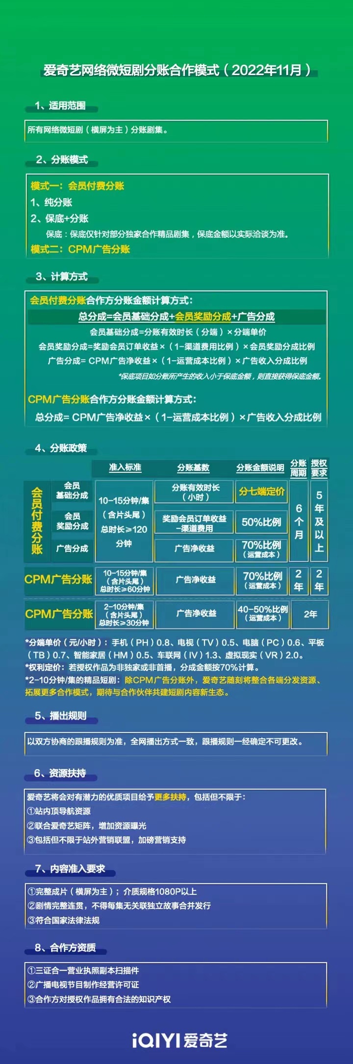 图片泉源:图虫创意 蓝鲸TMT频道11月10日讯,爱奇艺官方微信公众号体现,本日爱奇艺发布网络微短剧分账相助模式。面向上游微短剧创作方,单集时长2至15分钟且内容完备连贯的剧集,可通过会员付费分账或CPM广告分账模式上线爱奇艺平台。 此中,单集时长为2至10分钟的内容,采取CPM广告分账模式;单集时长10至15分钟的内容,采取会员付费分账模式+CPM广告分账模式。 会员付费分账收益分配上,爱奇艺连续了已在分账网剧市场应用的“会员拉新、会员有用观看时长、广告收入”三者叠加的收益统计和分成机制,同时面向片方开放七端数据。 自2012年推出分甘同味内容战略以来,爱奇艺通太过账模式与影视创作者相助已近十年。现在内容分账模式已包罗爱奇艺网络影戏、剧集、动漫、儿童、纪录片等多内容品类。 据德塔文数据体现,2022年上半年,在广电总局重点网络影视剧信息存案体系中,802家公司申报存案了微短剧项目,规划存案(即进入准备制作期)微短剧已达2859部,总集数69234集。本次爱奇艺将网络微短剧纳入平台分账模式,意味着网络微短剧片方也将可以或许应用爱奇艺平台的贸易和服务模式,把内容以便捷与低资源的发行方式出现给观众。微短剧集创作者和观众间将能实现更公平高效的内容创作与消耗支持。 |