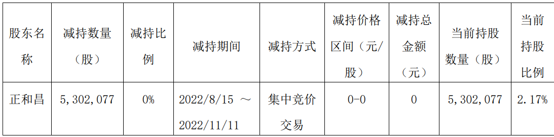 2022年11月11日,惠发食品(603536.SH)发布了股东减持股份盼望公告。 股份减持操持实行前,正和昌投资有限公司(以下简称“正和昌”)持有山东惠发食品股份有限公司(以下简称“公司”)无穷售条件的流畅股份5,302,077股,占公司总股本比例为2.17%,股份泉源于公司初次公开发行前股份以及发行上市后以利润分配及资源公积转增股本方式取得的股份。 股东因减持时间过半披露减持操持实行盼望: |