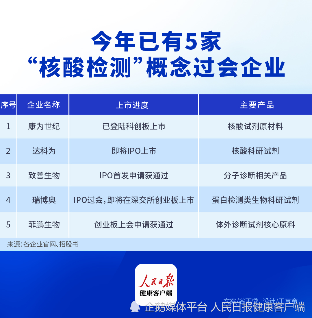 人民日报康健客户端 谷雨微 据人民日报康健客户端不完全统计,本年度克制11月12日,已有包罗菲鹏生物、康为世纪、达科为、至善生物、瑞博奥5家“核酸检测”概念过会企业,此中康为世纪于10月登岸科创板上市。 康为世纪:已登岸科创板上市 10月25日,康为世纪登岸科创板。招股书体现,康为世纪的核心产物包罗分子检测酶质料、核酸生存试剂、核酸提取纯化试剂以及分子诊断试剂盒。相较于其他试剂厂商,康为世纪的疫情相干收入紧张来自原质料。 在核酸生存试剂上,该公司开辟了市场上首个预期用途为“用于生存血液中游离核酸”的二类医疗东西产物。另据康为世纪方面预计,新冠病毒核酸检测盒产物将在2022年完成临床评价和注册审批。 达科为:即将IPO上市 10月14日,达科为提交上市注册申请,即将IPO上市。招股书体现,达科为拟发行不凌驾1998.90万股,募资约8亿元,资金用于创建研发中心、生物试剂生产中心、医疗装备制造中心等多个项目。 如今,达科为的产物紧张是科研试剂,2020年,公司研发了核酸检测病毒采样管和病毒生存液。根据招股书披露,本年上半年,达科为靠采样管业务到达4190.23万元的贩卖额,但其核酸检测病毒采样管单价仅为1.95元/支,代价降落35.15%。 致善生物:IPO首发申请获通过 9月6日,致善生物IPO首发申请获通过,即将登岸创业板。企业拟召募资金9.3亿元,用于分子诊断试剂和分子诊断仪器生产基地创建、仪器研发中心创建、运营管理及服务信息化体系、营销中心创建和增补活动资金。 致善生物是一家以分子诊断技能为核心,集分子诊断试剂和分子诊断仪器的研发、生产、贩卖于一体的生命科学企业。如今,致善生物拥有具有国际专利的“体外诊断原质料制备”“超微磁颗粒核酸提取”“均相PCR多靶标核酸检测”和“自动化仪器体系”四大技能平台,覆盖新冠检测的全过程。 瑞博奥:IPO过会,即将在厚交所创业板上市 9月27日,创业板上市委员会公布瑞博奥首发符合发行条件、上市条件和信息披露要求,成为本年第5家“核酸检测”概念过会企业。 瑞博奥是一家从事卵白检测类生物科研试剂研发、生产、贩卖并提供技能服务的生物科技公司。2021 年,公司实现主业务务收入27589.67万元,子公司瀚普医检室的检测服务收入占主业务务收入比例为41.36%,紧张系新冠核酸检测服务收入。 菲鹏生物:创业板上会申请获通过 3月3日,菲鹏生物创业板上会申请获通过。公司主业务务为体外诊断试剂核心质料的研发、生产和贩卖,为举世抗原检测试剂核心质料的紧张供应商。 菲鹏生物核酸检测平台于2010年建成,据其招股书先容,如今公司已开辟出了涵盖胶体金、化学发光、荧光、酶免、生化5大平台的新冠抗原检测试剂质料等一系列新冠相干产物,研发生产的质料产物种类达一百多种,覆盖新冠诊断相干的绝大部门应用场景。 |