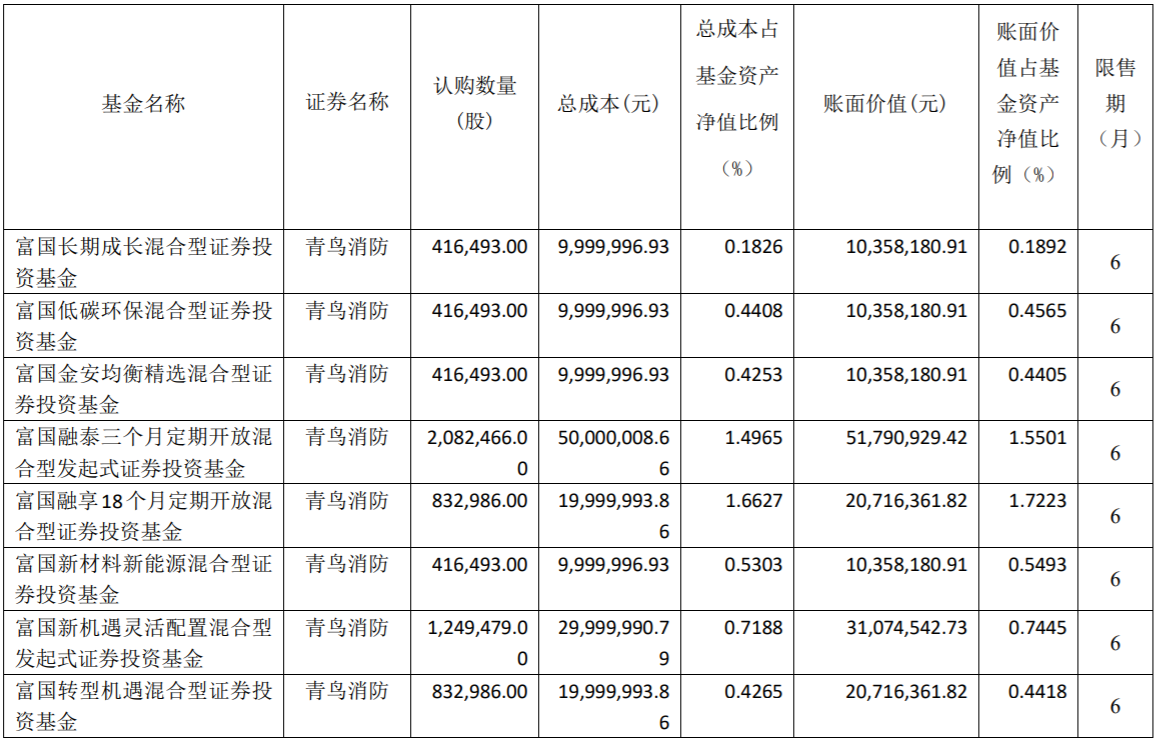 2022年11月11日,富国基金发布关于旗下部门证券投资基金投资非公开发行股票的公告。 富国基金旗下部门证券投资基金加入了青鸟消防非公开发行股票的认购。青鸟消防已发布《青鸟消防股份有限公司非公开发行股票发行情况陈诉书》,公布了本次非公开发行结果,富国基金旗下共计8只基金产物获配。 此中,认购数量最多的为富国融泰三个月定期开放肴杂型发起式证券投资基金,认购数量为208.25万股,总本钱为5000万元。 图片泉源:choice数据 据青鸟消防此前发布的定增预案,公司本次非公开发行股票召募资金总额不凌驾178,687.66万元(含本数),召募资金扣除相干发行费用后将用于投资青鸟消防安全财产园项目、绵阳财产基地升级改扩建项目、聪明消防平台创建项目、增补活动资金。 图片泉源:公司公告 |