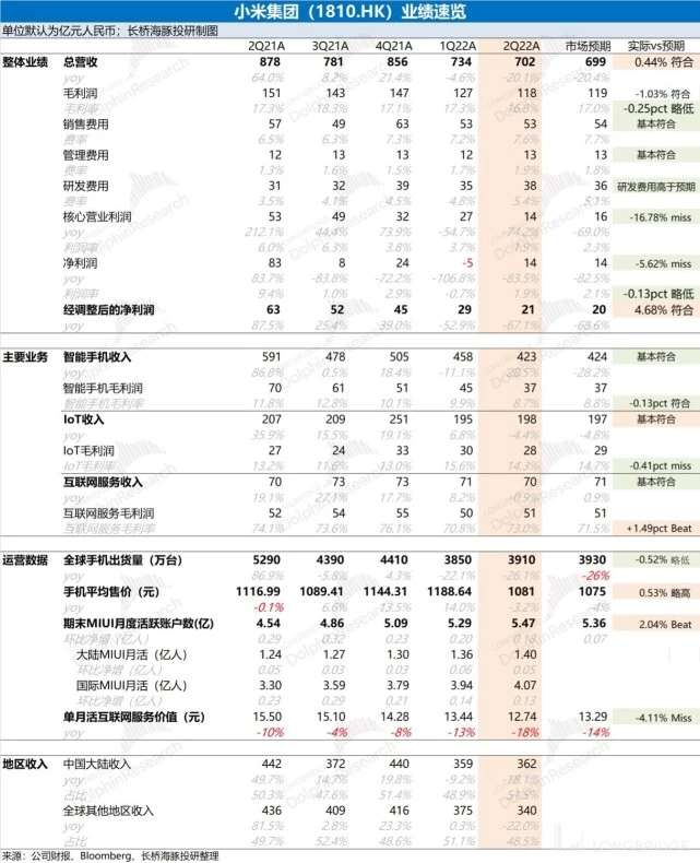 小米团体(1810.HK)于北京时间 2022 年 8 月 19 日晚的长桥港股盘后发布了 2022 年第二季度财报(制止 2022 年 6 月),要点如下: 1、团体业绩:手机,是业绩下滑的主谋。$ 小米团体-W.HK本季度总营收 702 亿元,同比下滑 20.1%,符合市场预期(699 亿元)。公司收入在本季度出现下滑,重要是受低迷的手机业务拖累。小米团体本季度毛利率 16.8%,同比降落 0.5pct,符合市场预期(17%),公司在本季度通过促销继承清算库存对毛利率产生影响。 2、手机业务:两年来初次量价齐跌。经济放缓克制市场要求,叠加疫情、地域政策等因素影响,手机出货量和客岁同期相比下滑近 1300 万台,手机出货量同比下滑到达 26.1%。手机均价前几季度的连续上涨,在本季戛然而止。在高企的库存下公司开始贬价销货,手机均价回落至 1081 元(同比-3.2%)。海豚君测算本季中国市场下滑约 300 万台,印度市场下滑约 270 万台。 3、IoT 业务:疲软之中,“白电” 成唯一亮点。在万物互联时间,市场曾预期双位数增长的 IoT 业务,在本季度也出现了负增长。在条记本电脑的拖累下,本季重要 IoT 产物出现两位数的下滑。IoT 业务本季仅有空调等 “白电” 实现了 30% 以上的增长,别的 IoT 产物的体现都暗含需求不振。 4、互联网服务:初次下滑,宏观影响广告主预算。互联网业务,在本季度出现了初次下滑。从用户量看,公司本季度的用户数岂论国内还是外洋都净增长的。但是国内单用户的 ARPU 值着实 “辣眼”,海豚君测算本季度国内单用户 ARPU 值仅有 37.6 元,同比下滑 21.2%。在经济放缓的大配景下,国内广告主开始紧缩广告预算,直接影响了互联网业务中最大部门广告业务。固然小米作为硬件入口有肯定的抗风险本领,但也挡不住大情况。 5、费用及业绩情况:裁人,也挡不住汽车投入的增长。粗粗的看,小米的费用端在本季度又创新高。但着实小米已经在暗暗裁人了,而不绝走高的费用重要是来自于对汽车等创新业务的投入。本季度小米员工总人数降落 924 人,到场了互联网裁人雄师。费用端不降反升,重要是汽车业务本季度带来了 6 亿多费用。而在汽车形成贩卖前,该部门都将直接构成公司的费用项的增长。 团体来看:固然小米本季度根本 “完成了” 市场预期,但是从财报中每一处透露着 “惨”。本季度小米各项重要均出现了下滑,IoT 业务和互联网业务出现了初次下滑,而手机业务更是直接下滑近 30%。诚然市场已经预期了公司本季度的 “惨状”,业绩至少没出现明显 miss。 但是对于投资,重要是买入未来。从这份财报,能有什么指向作用呢?由于小米是 “软硬一体” 的公司,我们从硬件和软件分别来看。 1)硬件端(手机和 IoT):这季度确实已经很差了,但如今却还没看到好转的迹象。本季度手机出货量不到 4000 万台,IoT 产物又出现下滑,可以说是小米近期最难的季度了。但是,从市场和财报中并没看到好转的迹象。本次财报中的存货在本季度继承上升,二季度的促销并没把库存水位低沉;手机市场需求仍旧疲软,从前些天舜宇的公司指引测算得下半年安卓手机仍将有两位数得下滑;印度、德国等国家开始对小米等中国公司的政策施压,小米本季在印度市场份额掉了 8.8%,风险仍在。如今硬件端的三大风险,仍在。 2)软件端 (互联网服务):互联网服务在本季度出现初次下滑,重要受宏观经济面的影响。假如经济增速连续放缓或低位,对广告主的预算有进一步紧缩的风险。在团体广告行业预算紧缩的大配景下,小米纵然依靠硬件入口,也难独善其身。如今软件端的风险,也在。 综合来看,在浩繁风险克制下的小米,股价确实也已经回落到 12 元以下。但从本次财报看,海豚君并没有看到风险开释的迹象。单纯看小米的股价已经跌了许多,似乎不算贵。 在各业务下滑和多重风险的克制,小米业绩存在下修的风险。小米已经不再是像客岁那样年赚 200 亿的公司,小米本年的整年经调解后的净利润大概不到 100 亿,如今市值对应估值到达 25 倍(估值靠近于$ 苹果.US),现实上的估值也并不低。 重重风险之下,小米也开始了裁人降本的操纵,积极把如今最困难的时间熬已往。小米的 “逆境重生”,须要看到这一层层风险徐徐开释,大概是汽车业务带来的新发展。 以下是长桥海豚君对小米财报的详细分析: 一、团体业绩:手机,是业绩下滑的主谋 1.1 收入端 小米团体 2022 年第二季度总营收 702 亿元,同比下滑 20.1%,符合市场预期(699 亿元)。公司本季度收入同比下滑约有 150 亿元,这些根本都来自于手机业务的低迷。在经济放和缓疫情等不稳固因素下,团体手机市场需求疲软,小米手机业务也因此出现较大的下滑。 在本季度小米团体的各重要业务中,智能手机、IoT 和互联网服务的收入占比分别为 60.2%、28.2% 和 9.9%。手机业务仍旧是小米团体的最大收入泉源,但由于手机业务的下滑体现,在公司总收入中的占比继承下滑。 1.2 毛利率 小米团体 2022 年第二季度毛利率 16.8%,同比降落 0.5pct,略低于市场预期(17%)。 由于小米硬件端收入占比到达 9 成,以是小米公司的毛利率重要受硬件端产物的影响。硬件端的毛利率均有下滑,重要是由于市场需求疲软,公司加大了促销以清算库存;软件端(互联网服务)的毛利率同样回落,这重要是公司手机出货量干系的预装业务收入镌汰导致广告业务毛利率降落所致。 二、手机业务:两年来初次量价齐跌 2022 年第二季度小米智能手机业