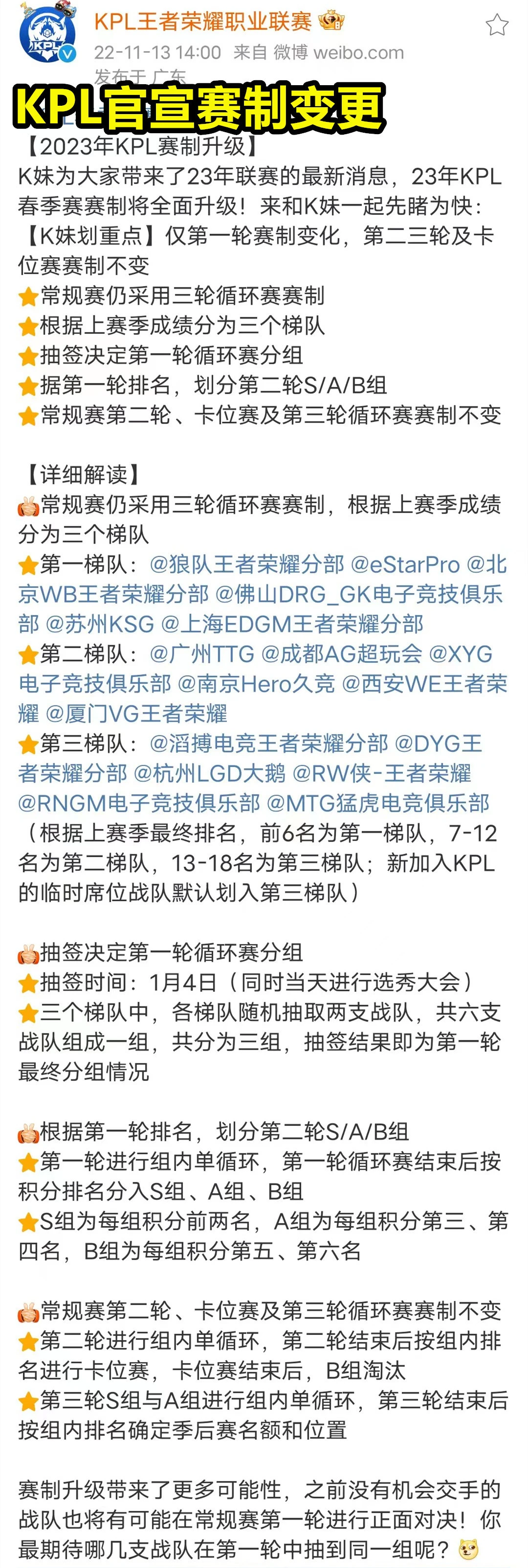 11月13日下战书2点,KPL同盟忽然间官宣了一个重磅消息,那就从2023年KPL春季赛开始,KPL赛制全面升级!着实,KPL同盟说全面升级是由于SAB分组赛制还是存在。但严格来说,着实此次赛制算是更换,由于固然只变动了通例赛第1轮而已,但这一点厘革也值得使得跟之前的情况很不一样,比如说结果继续没了。而且在不取消SAB分组赛制的情况下,咱们又有时机看到全部差别品级的队伍比武的局面。不得不说,这一次的KPL赛制升级,真的是太棒了,必须要给策划加鸡腿。那么这一次赛制是怎么厘革的呢?到底幸亏那边呢?咱们一起来相识一下吧? 之前的SAB分组赛制接纳结果继续,比如说2023年KPL春季赛通例赛第1轮的S组,就是2022年KPL夏日赛的6强,而A组则是7强到12强,B组则是13强到18强。而这一次KPL赛制变动最大的差别就是通例赛第1轮的分组形势变了。还是按照2022年KPL夏日赛的结果分为S组、A组、B组,但是通例赛第1轮的分组却没有SAB分组大概是说高低之分。 KPL同盟还是按照上赛季的结果分为SAB组,但之前的结果继续却直接酿成了抽签的依据而已,结果继续名不副实,乃至可以说已经取消了。通例赛第1轮的分组,KPL同盟改为了通过抽签分组,从S组、A组、B组各抽2支队伍构成第一组;以此类推,把属于第二组、第三组的队伍都抽出来。简单来明白就是,通例赛第1轮的三个分组,每一组都是有2支原S组队伍、2支原A组队伍、2支原B组队伍。而MTG是刚重新得到KPL席位的队伍,直接被默认分在了第三组。 而通例赛第1轮打完之后,每一组的前2名进入S组,每一组的第3、第4名进入A组、每一组第5、第6名进入B组。也就是说,从通例赛第2轮开始,齐备就跟之前一样完全规复正常。简单来说就是此次SAB分组只变动了通例赛第1轮而已。但就是这简简单单的一点厘革,使得SAB分组赛制多了相当之多的看点,不会像之前那样枯燥乏味,打来打去就是那么些队伍在比武。 比如说接下来咱们就不会总是看到如出一辙的estarpro大战狼队,乃至可以在estarpro没有降级的情况下,看他们大战一些AB组的队伍。而且通例赛第1轮的征战非常随机,完全就是看抽签的手气,搞欠好RNGM跟estarpro被分配在同一个组。看惯了如出一辙的强强对决,偶然候看看纯吊打也是很故意思的。这就跟吃惯了山珍海味,偶然候啃啃面包也是别有一番风味。仅仅只用了这么一点点厘革,就把SAB分组赛制的许多毛病大概说观众不停在吐槽的点给办理掉,不得不说,这策划是真的强,必须要加鸡腿。 小搭档们,你们怎样对待KPL官宣2023年KPL春季赛将要上线“SAB分组升级版”赛制呢?接待下方留言批评说说你的观点哦!咱们批评区不见不散哈? |
